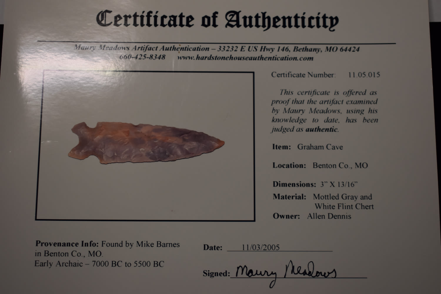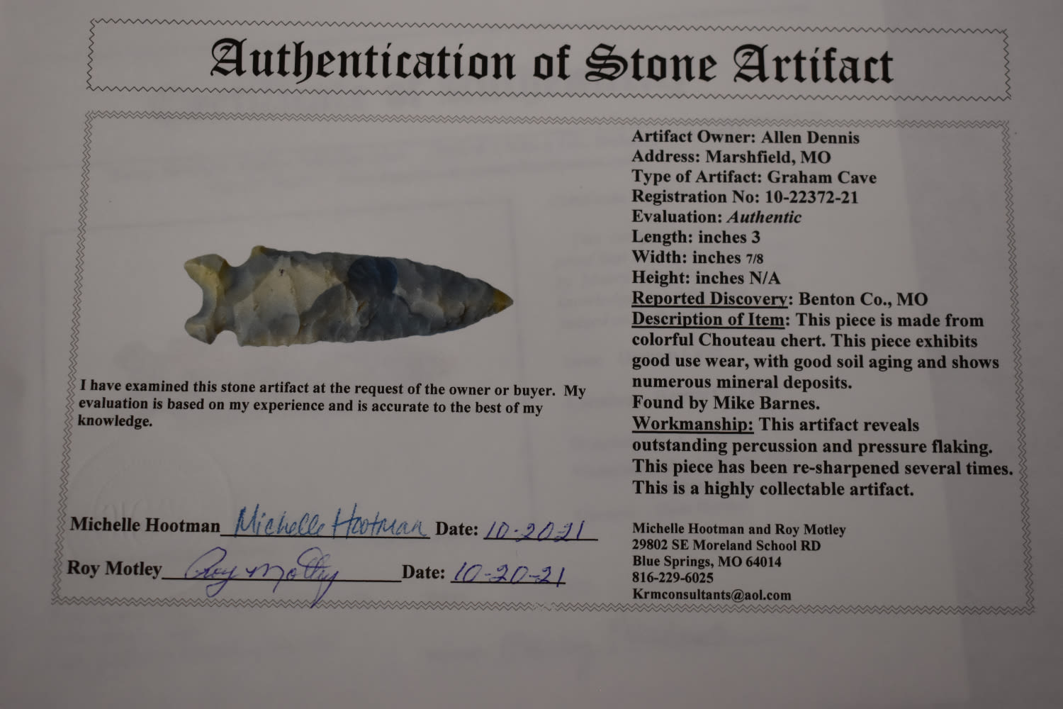 3″ Graham Cave, 2x COA Motley/Meadows found by Mike Barens Benton Co Missouri, Very Colorful Motled Chert