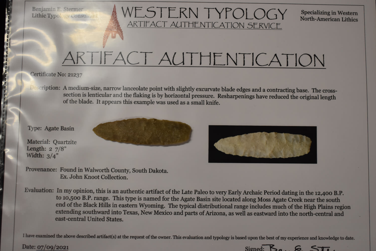 2 7/8″ Quartzite Agate Basin, Stermer COA, found in Walworth Co South Dakota