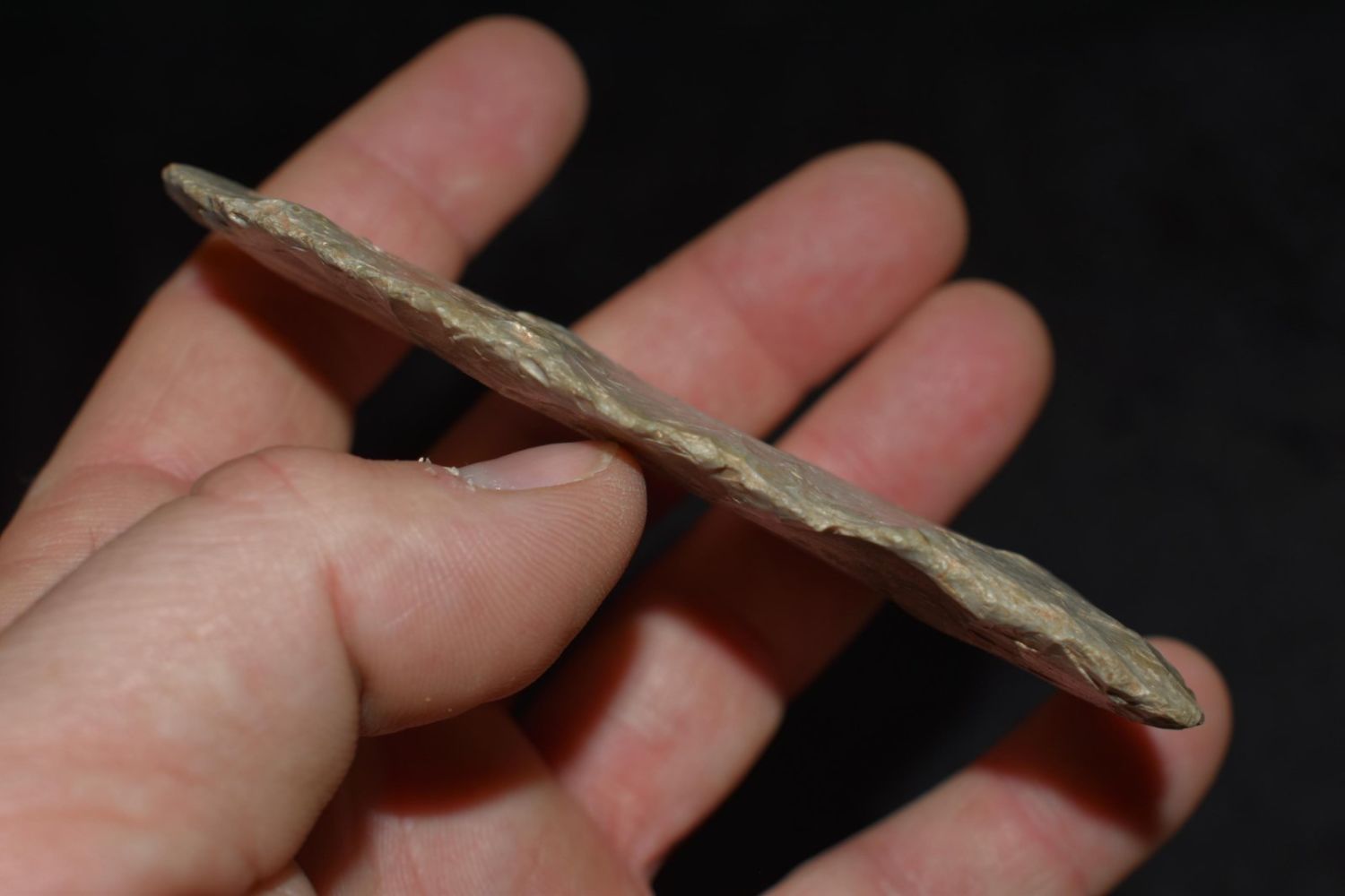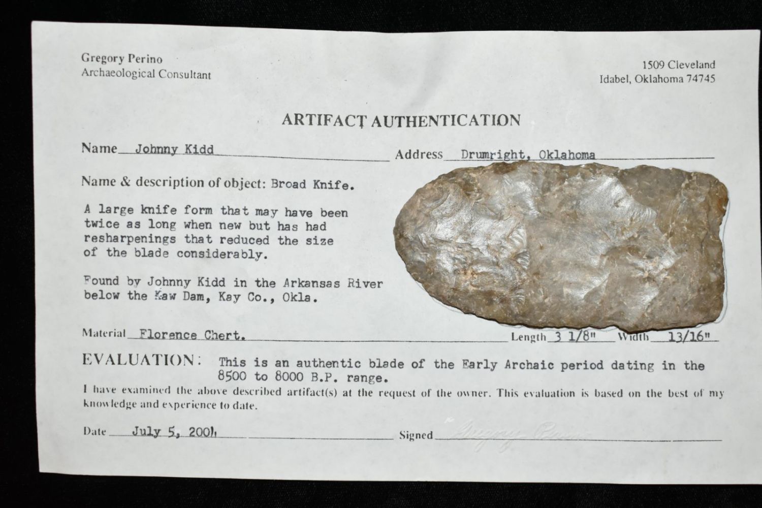 3 7/8″ Broad Knife, Perrino COA, Found by Johnny Kidd near the Arkansas River in Kay Co. Arkansas