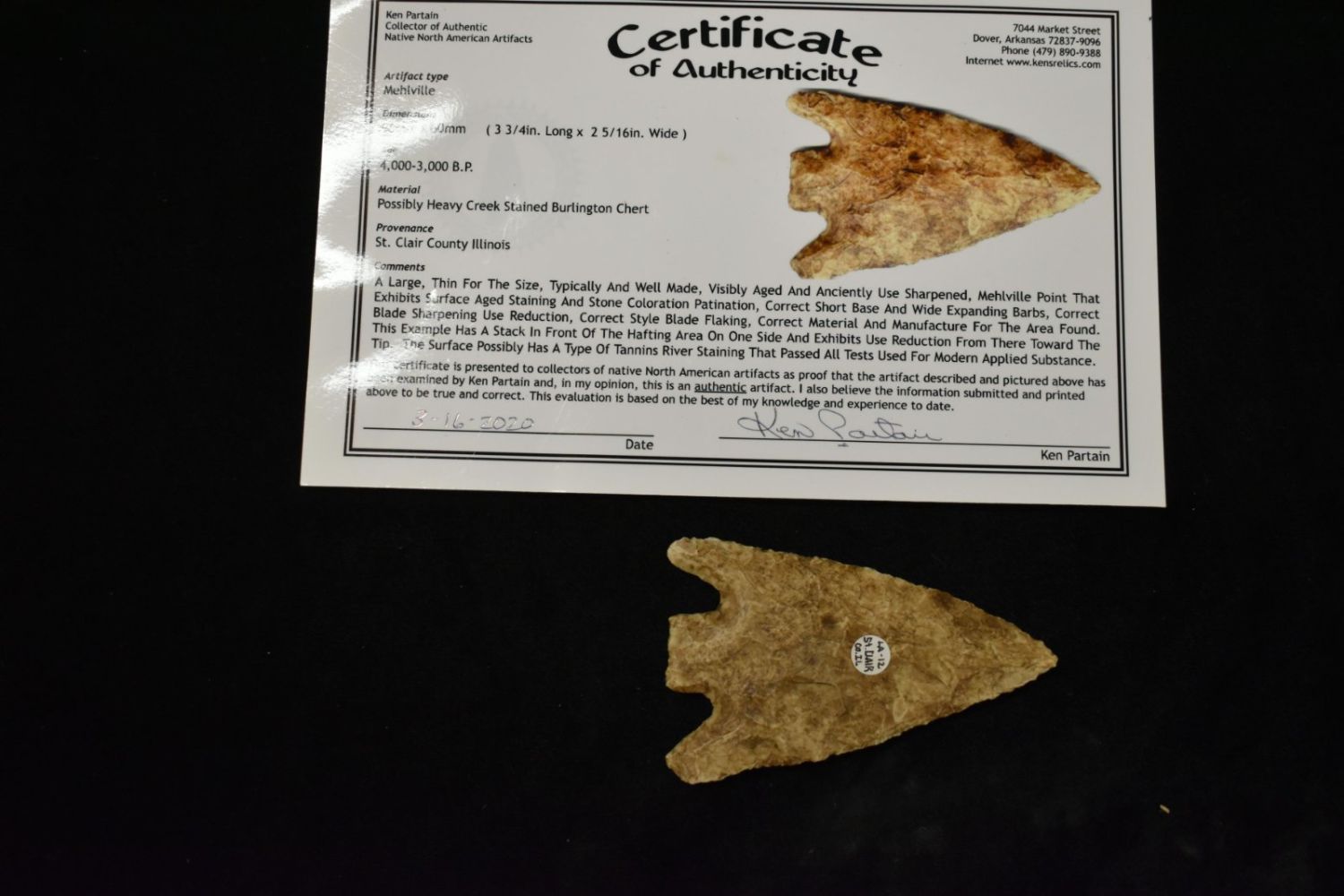 3 1/4″ Smith, Partain COA, found in St Clair Co. Illinois, Ex. Brian Sundberg Collection