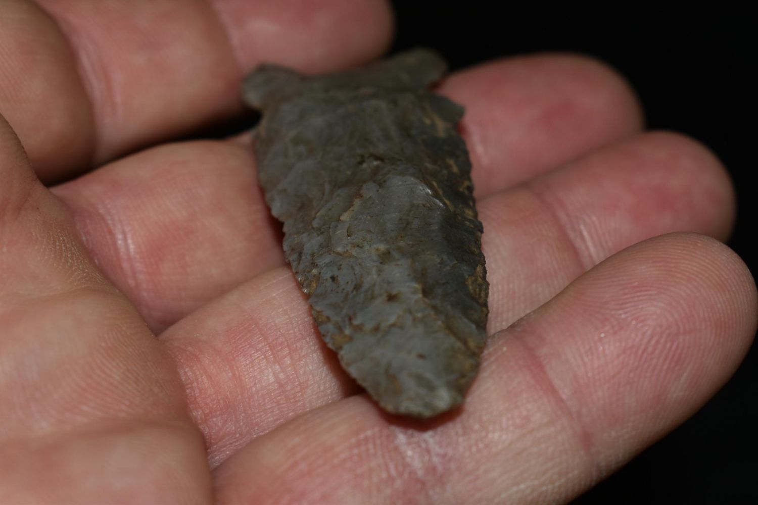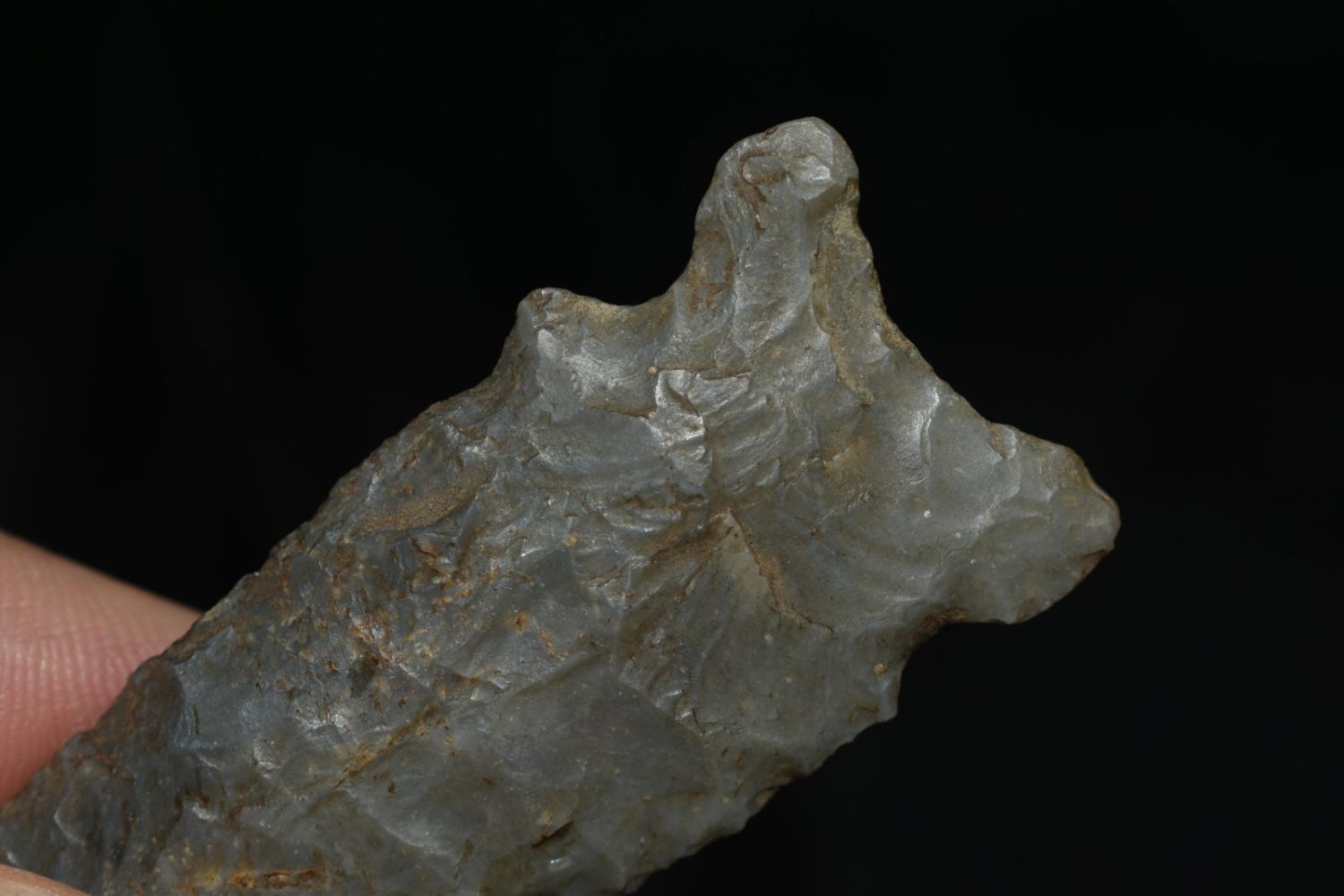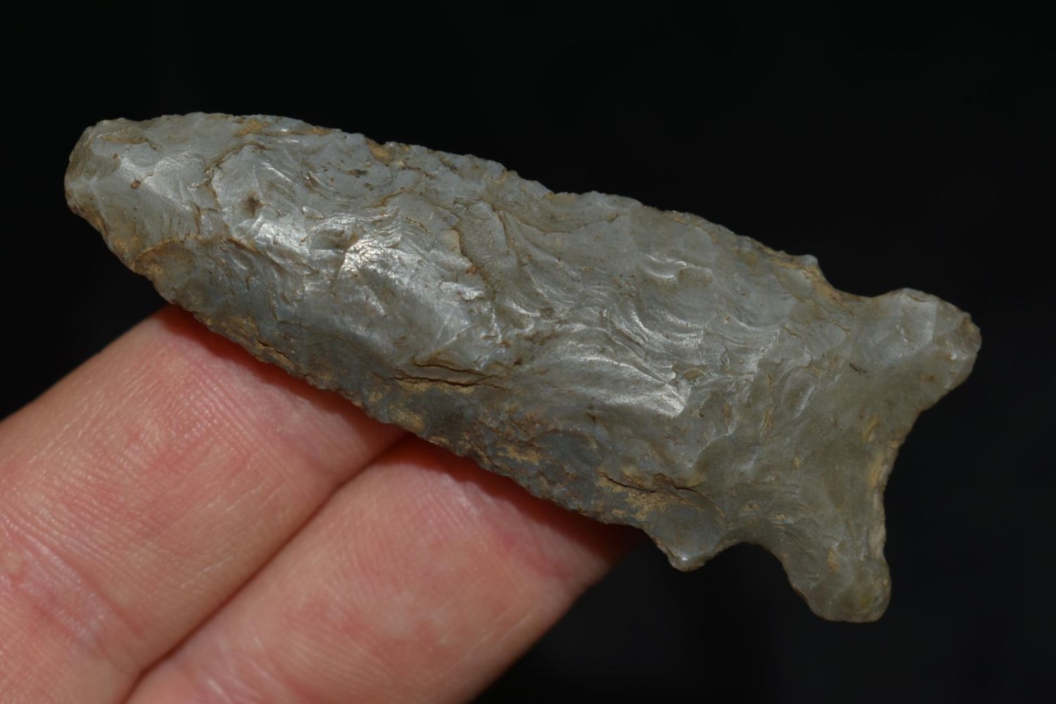 2 1/2" Graham Cave, Well Made, Nice Flaking, made of colorful grey chert, from Hancock Co Illinois