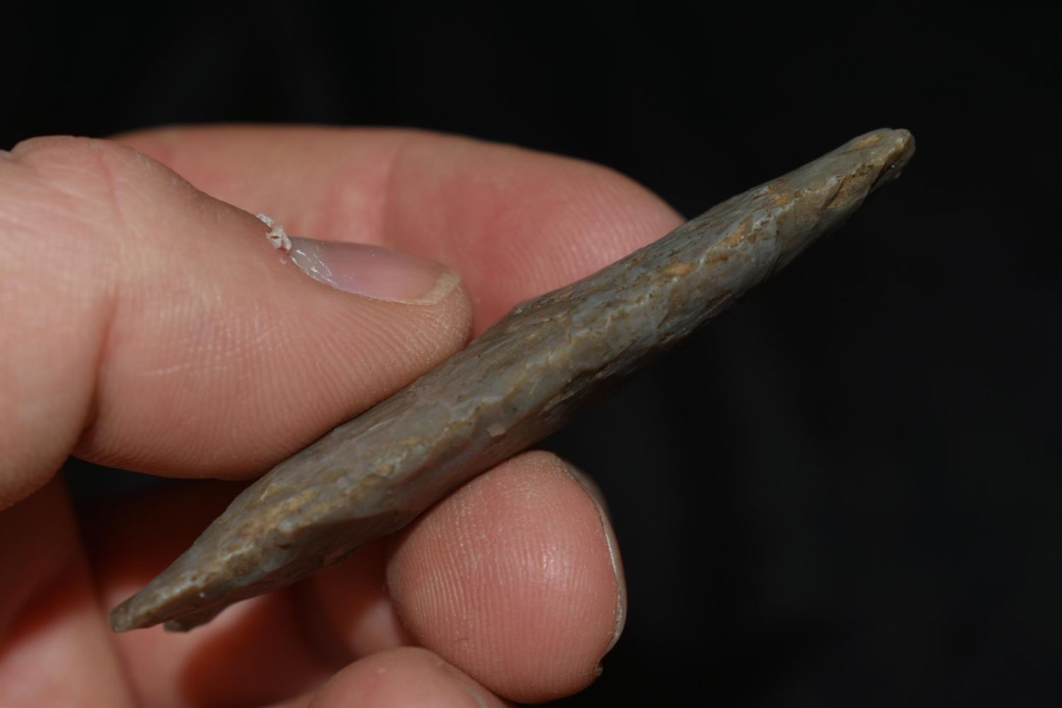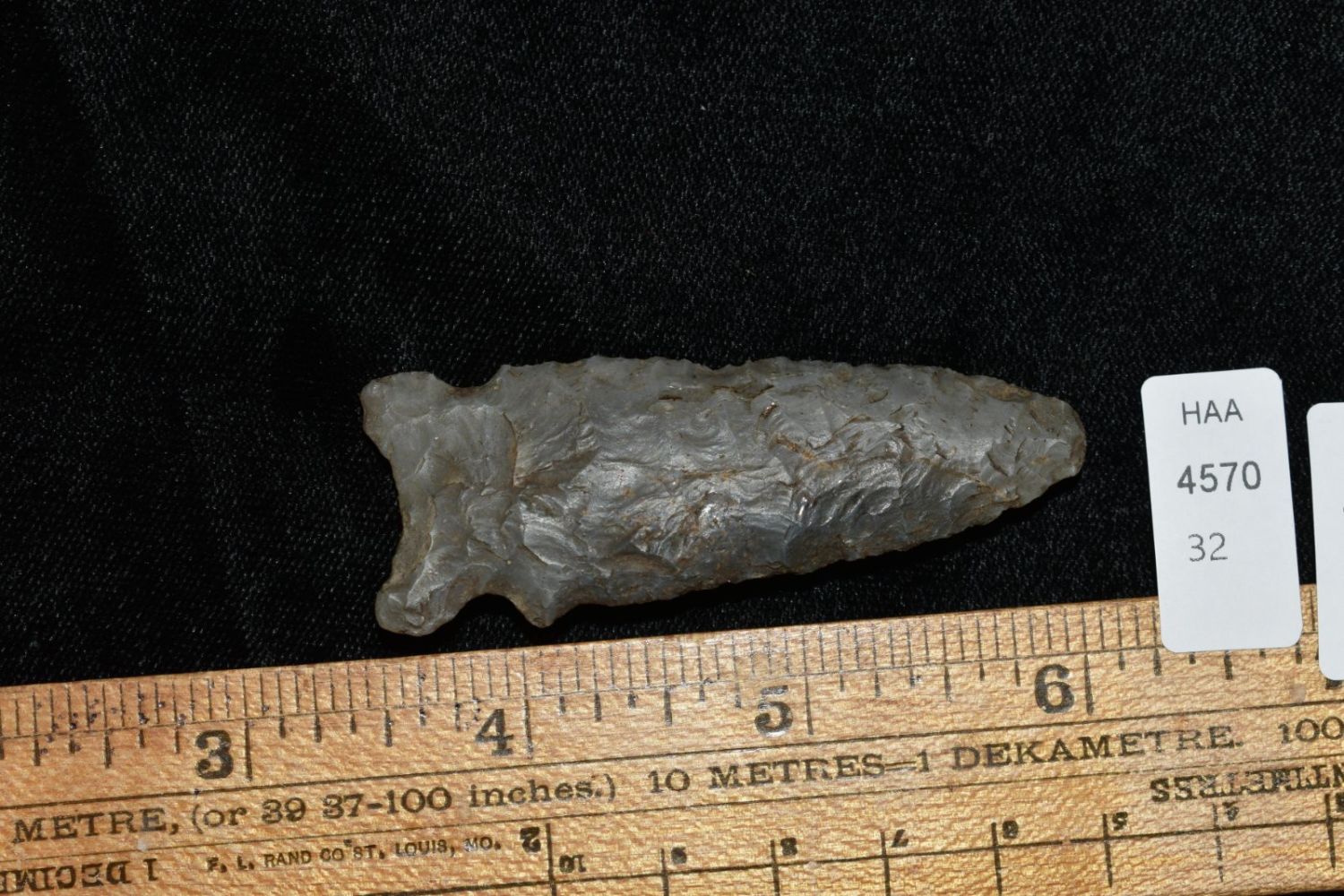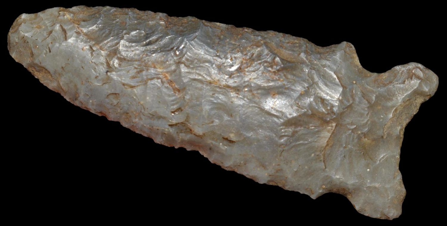 2 1/2" Graham Cave, Well Made, Nice Flaking, made of colorful grey chert, from Hancock Co Illinois