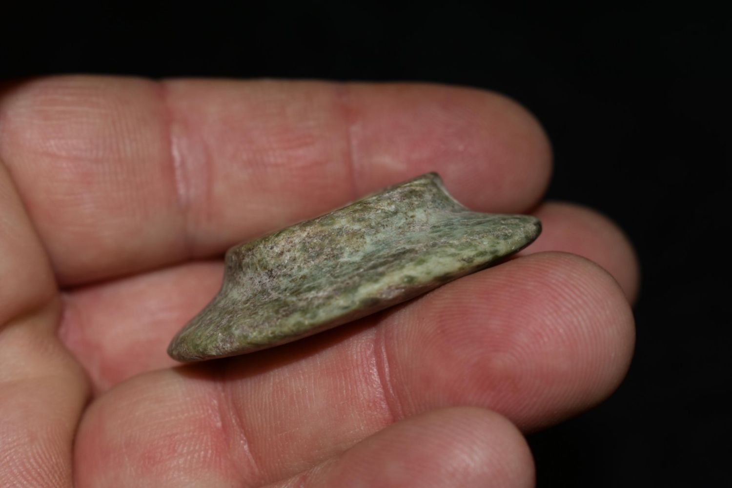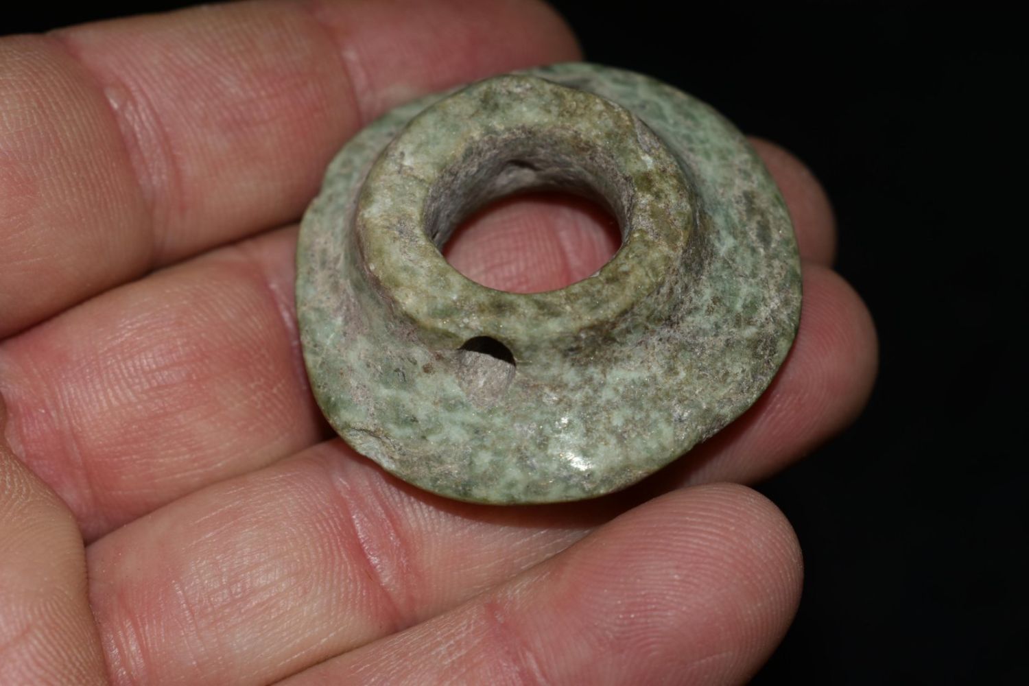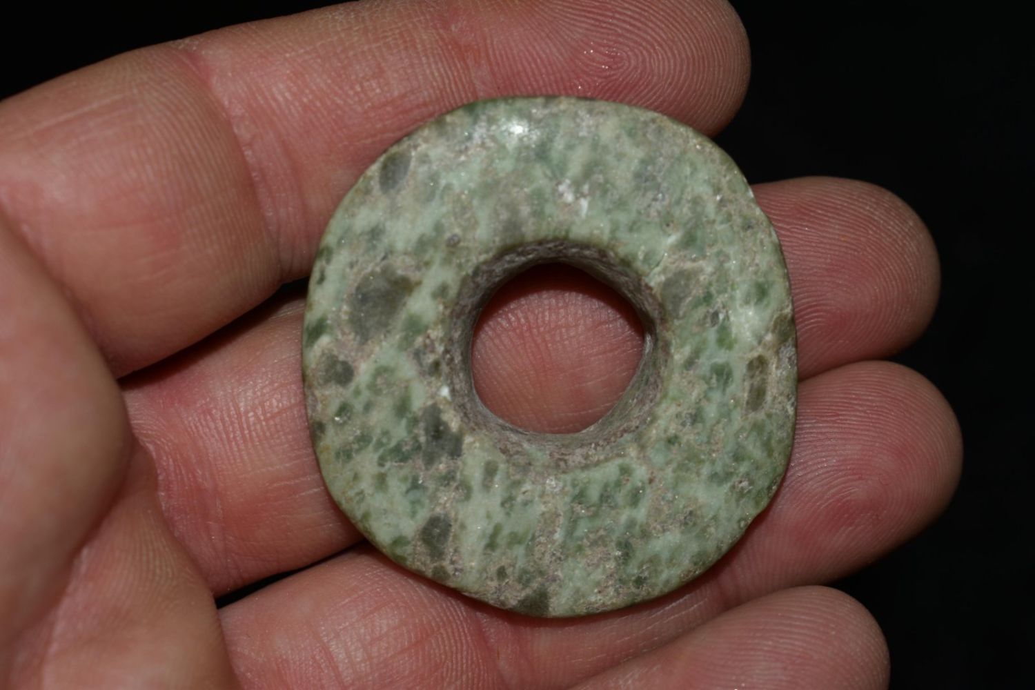 1 3/4″ Pre-Colombian Jade Drilled and Polished Ear Spool, Ex Greg Perdun and Chuck Adams