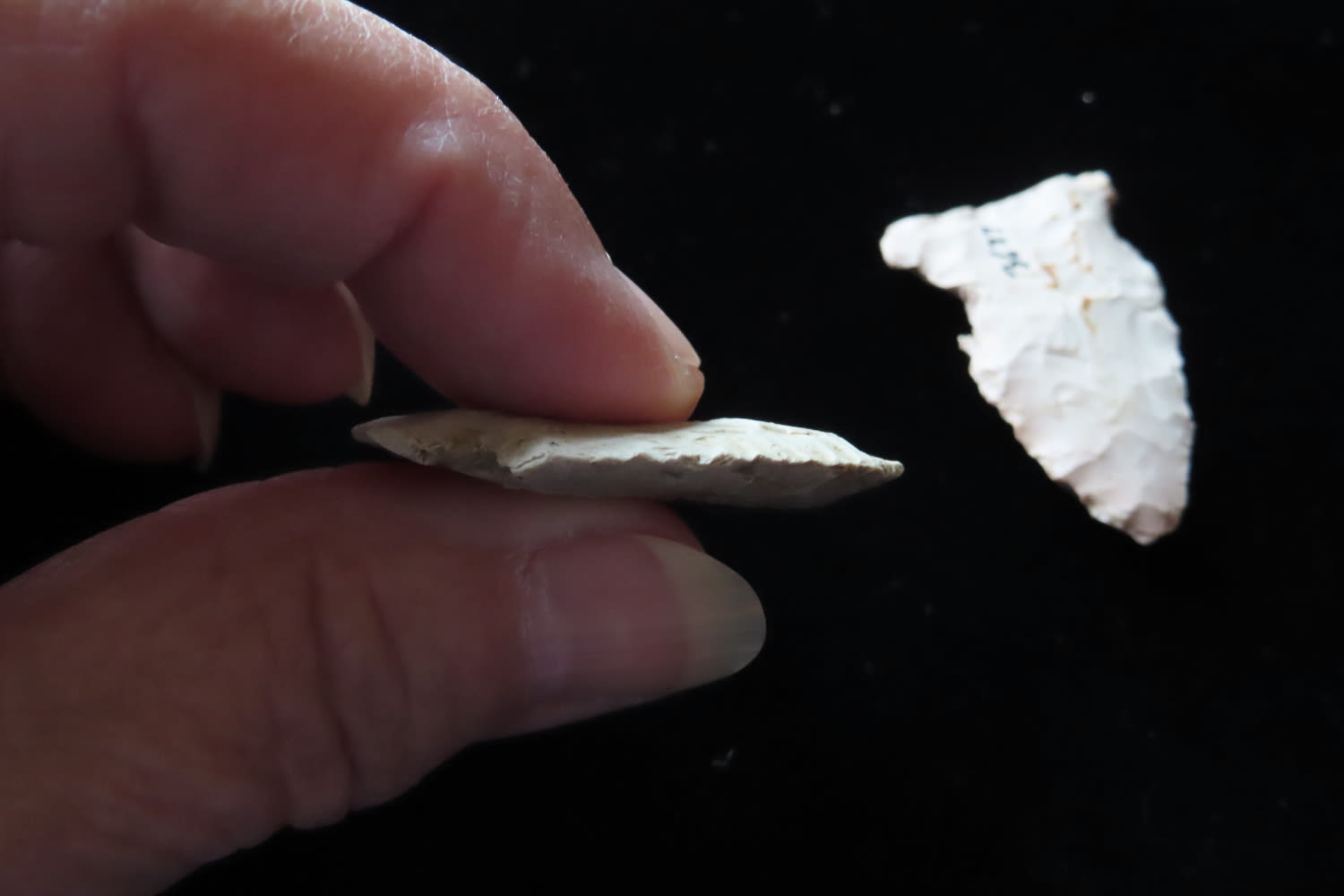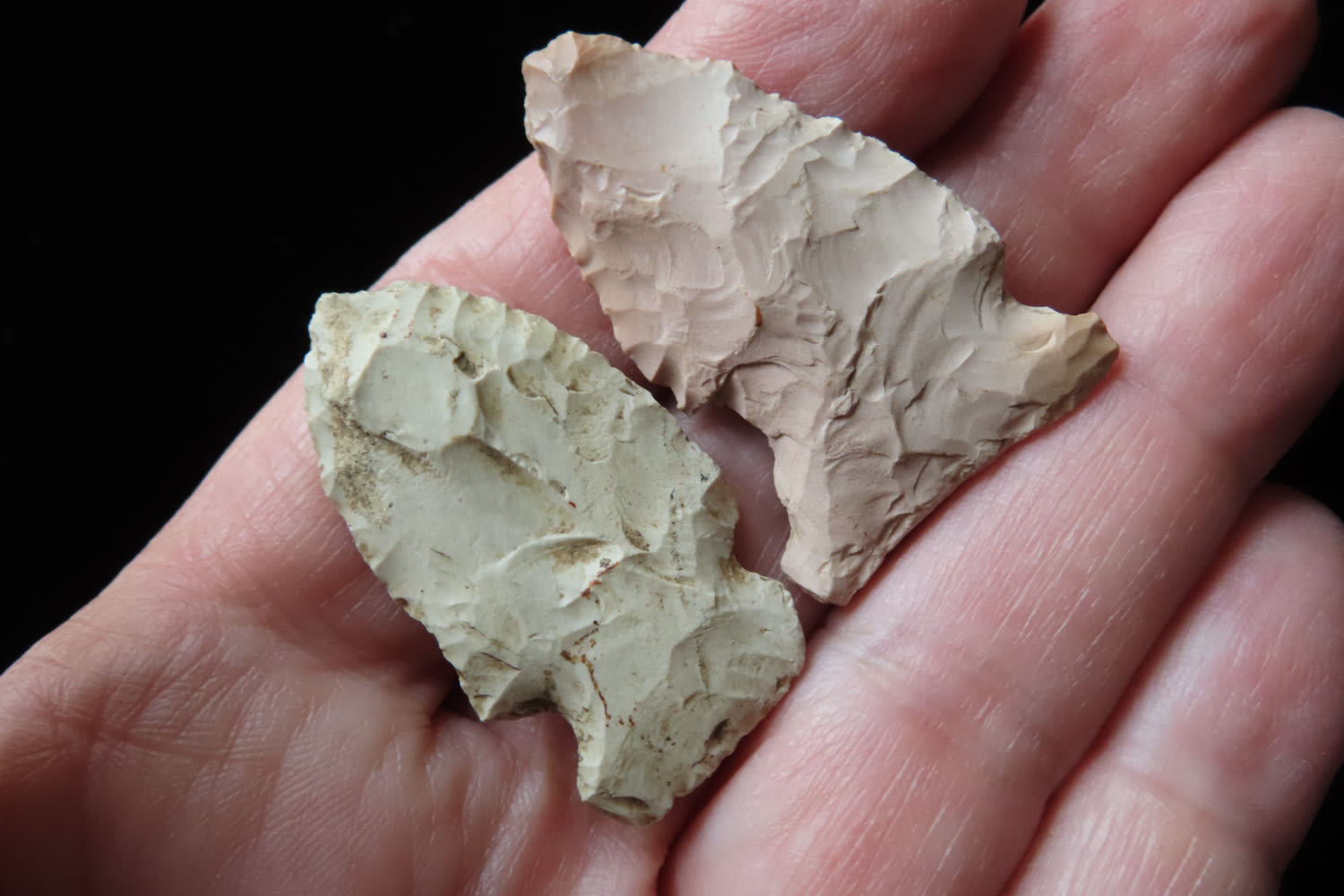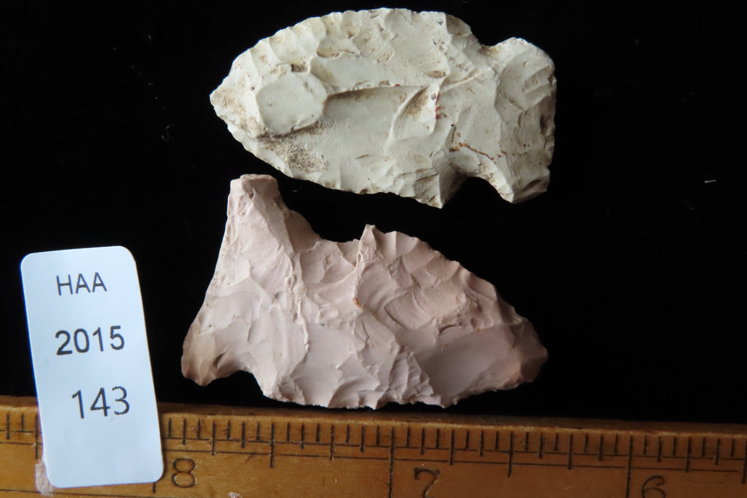 Two 1 7/16″ Sidenotch points from the late Bruce Cox collection of Hamilton, Illinois.