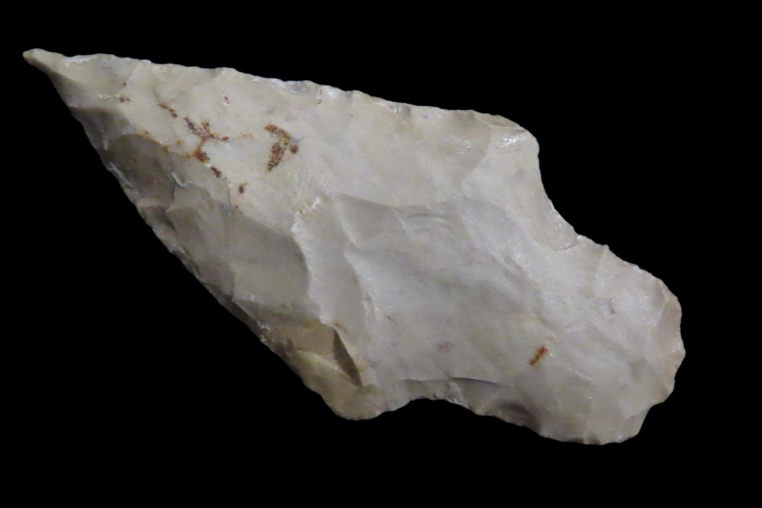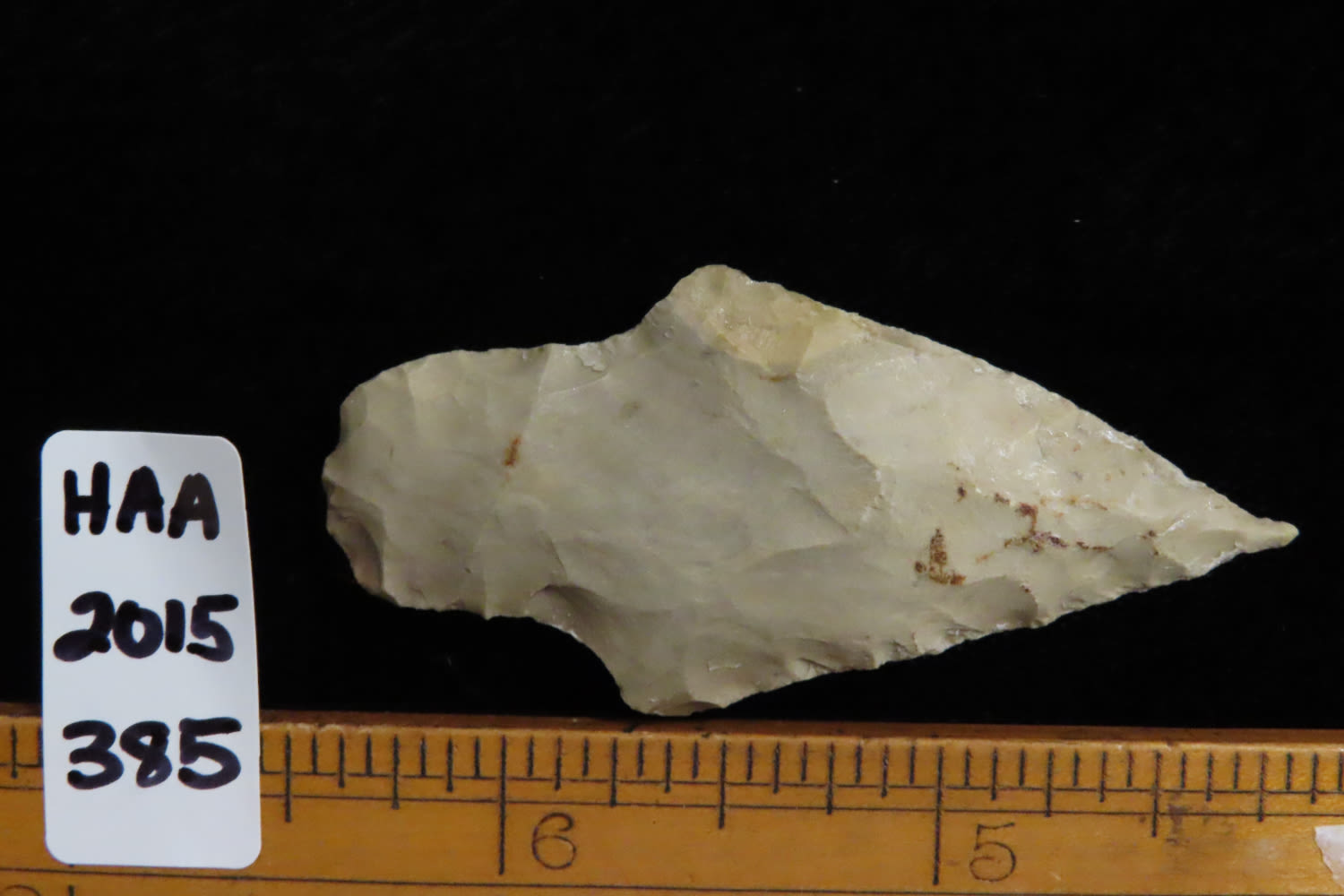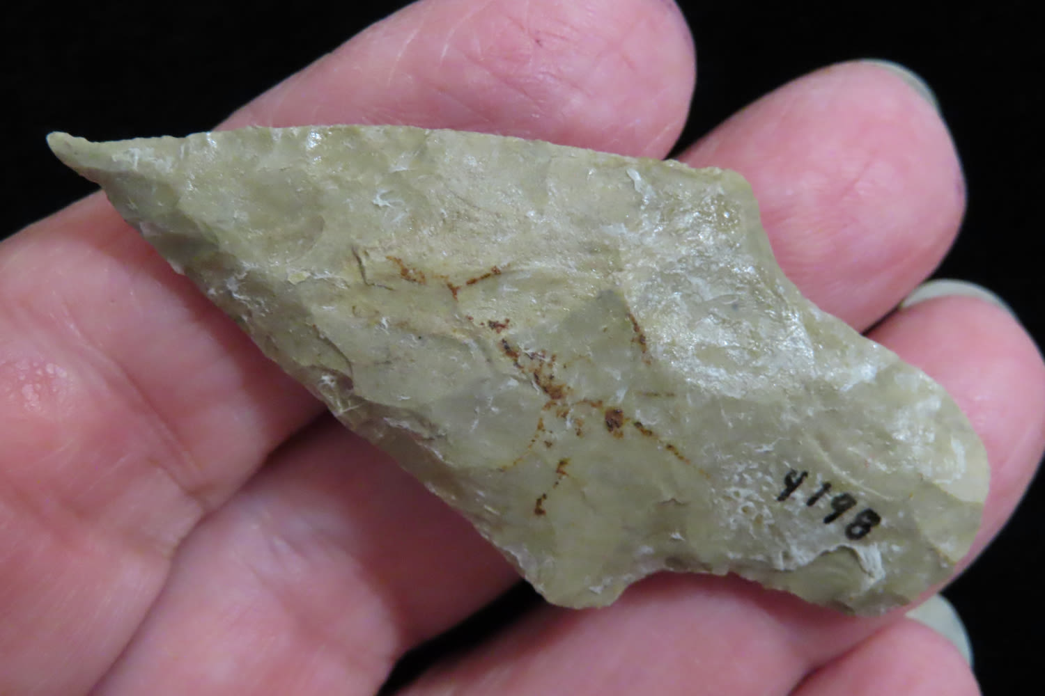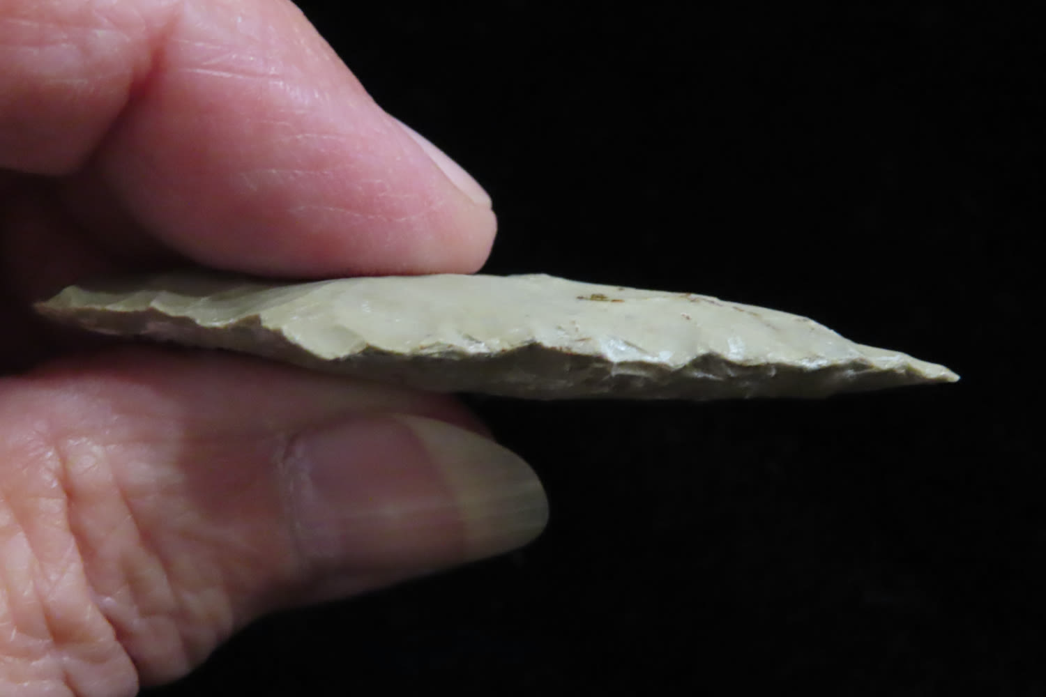 2 1/4″ Adena with a needle tip found in the Midwest and out of the late Bruce Cox collection of Hamilton, Illinois.