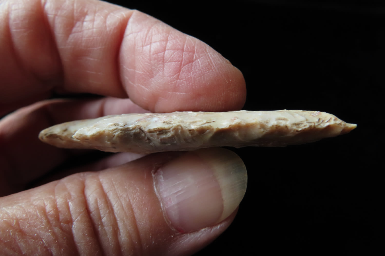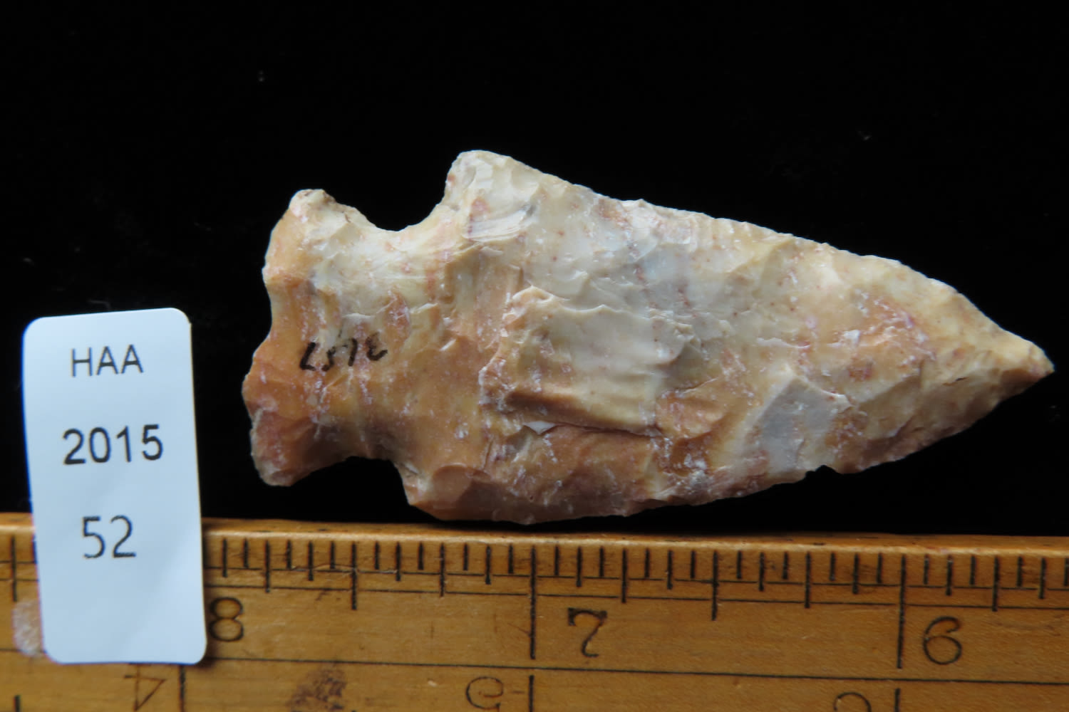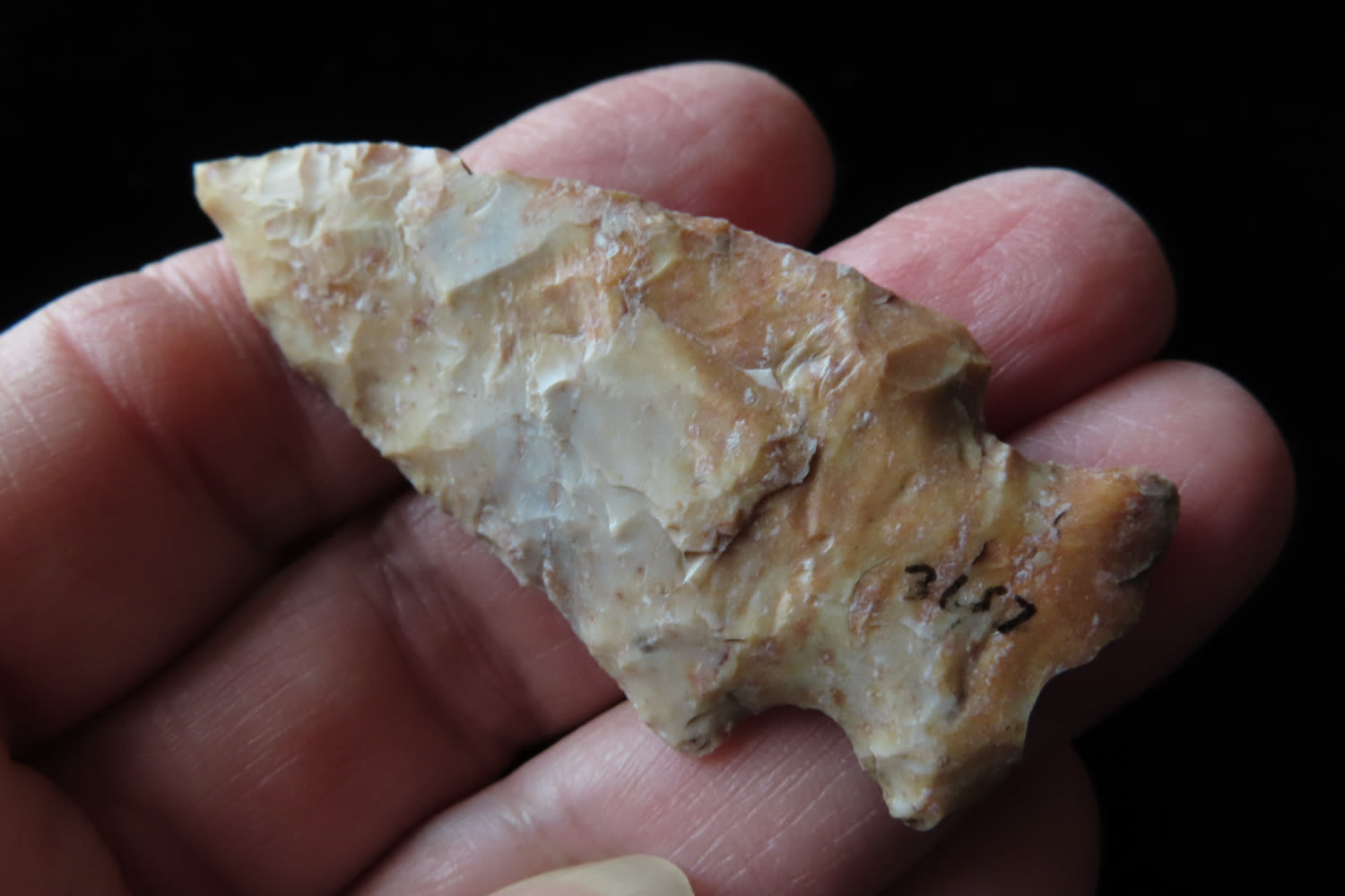 2 1/4″ Apple Creek made from a pretty River Stained flint. From the late Bruce Cox collection Hamilton, illinois.