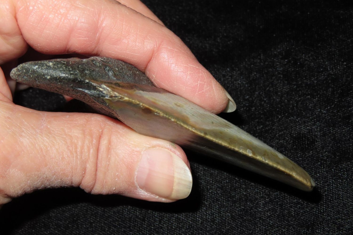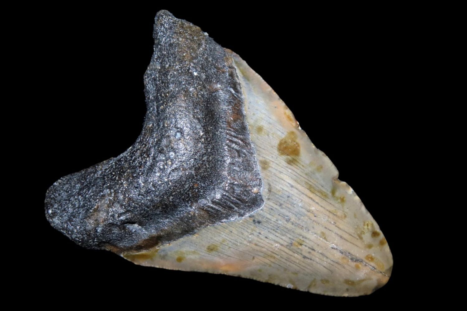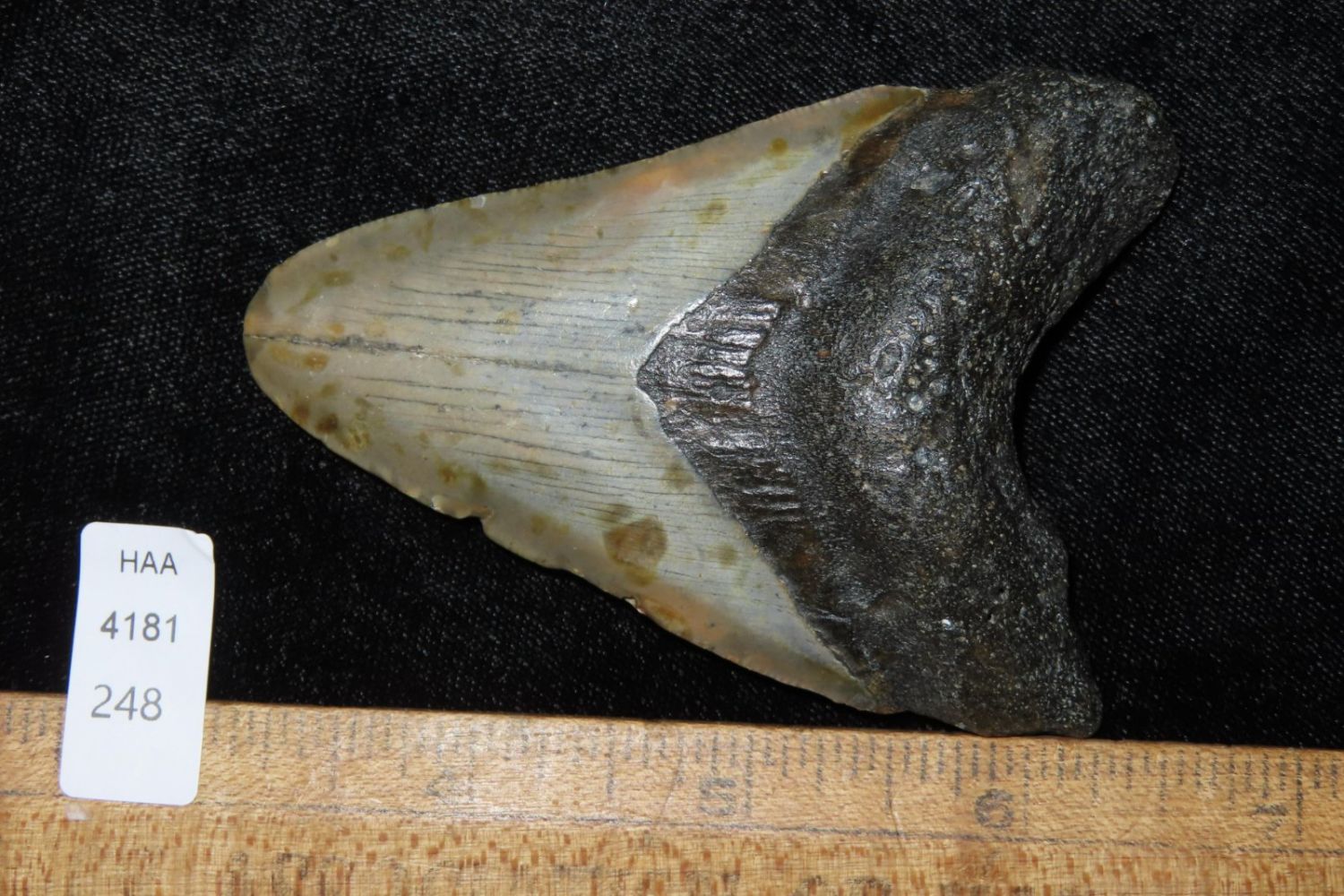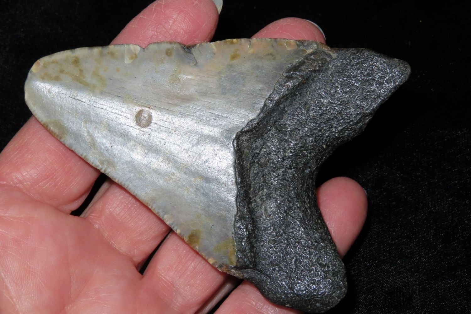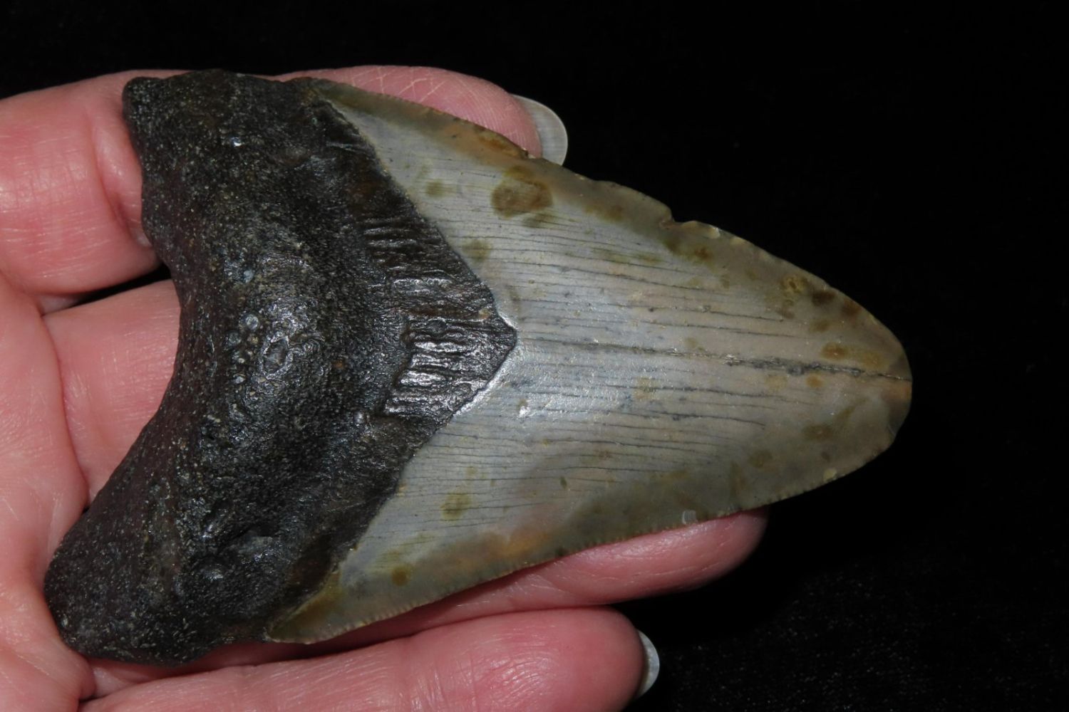 3 3/8″ Megaladon Shark Tooth Fossil, South Carolina Megalodon (Otodus megalodon), meaning “big tooth”, is an extinct species of mackerel shark that lived approximately 23 to 3.6 million years ago.