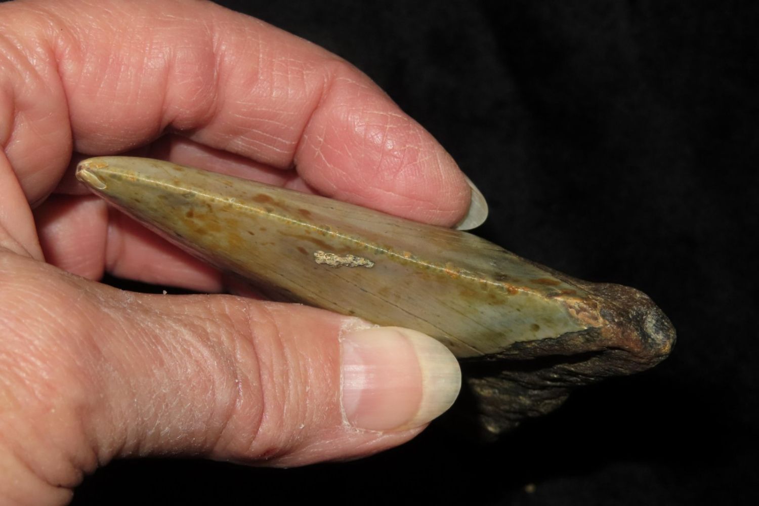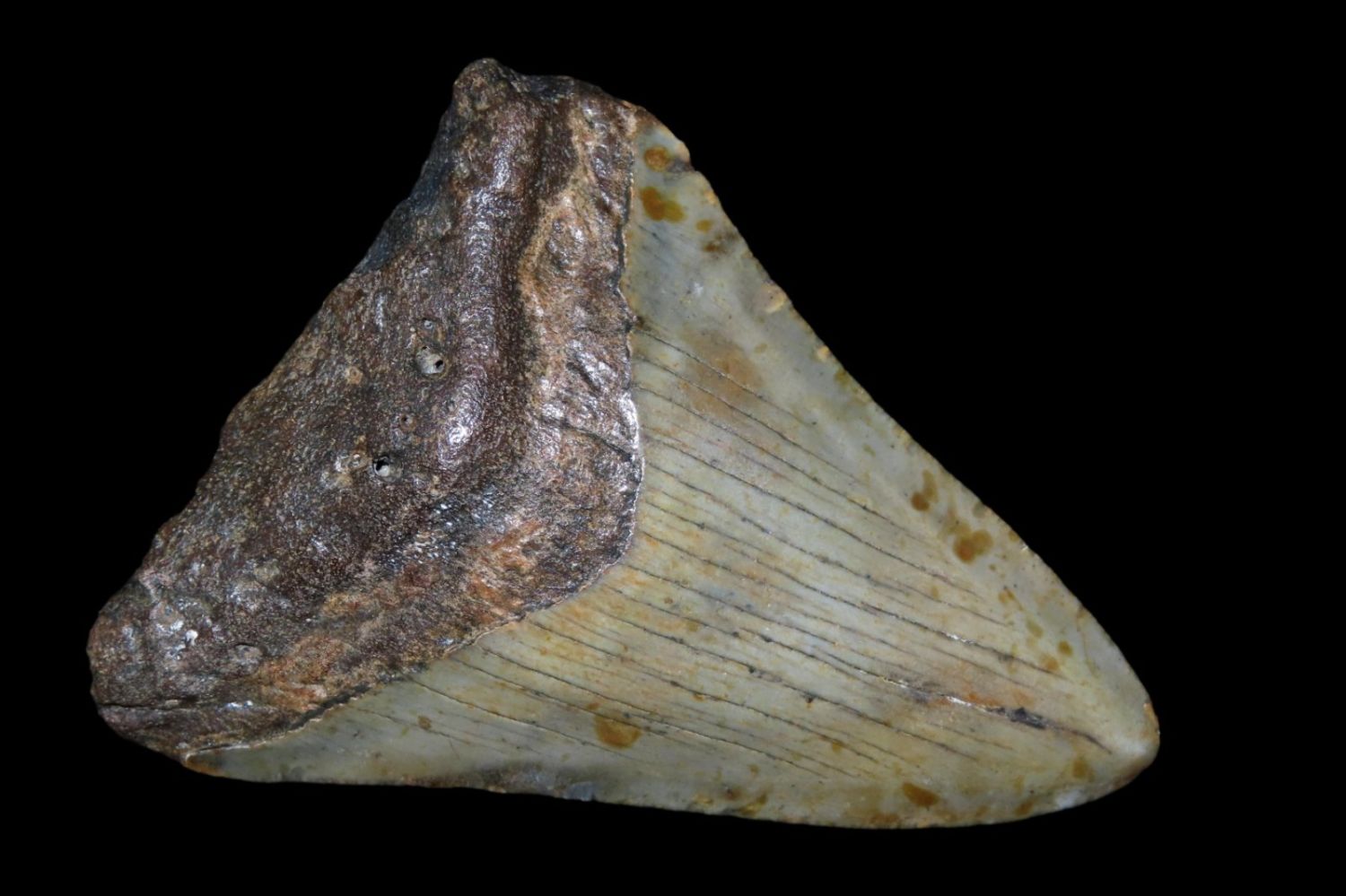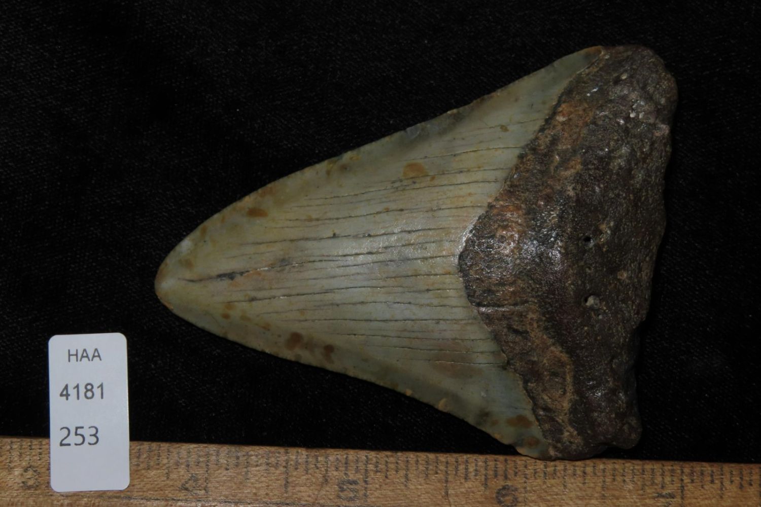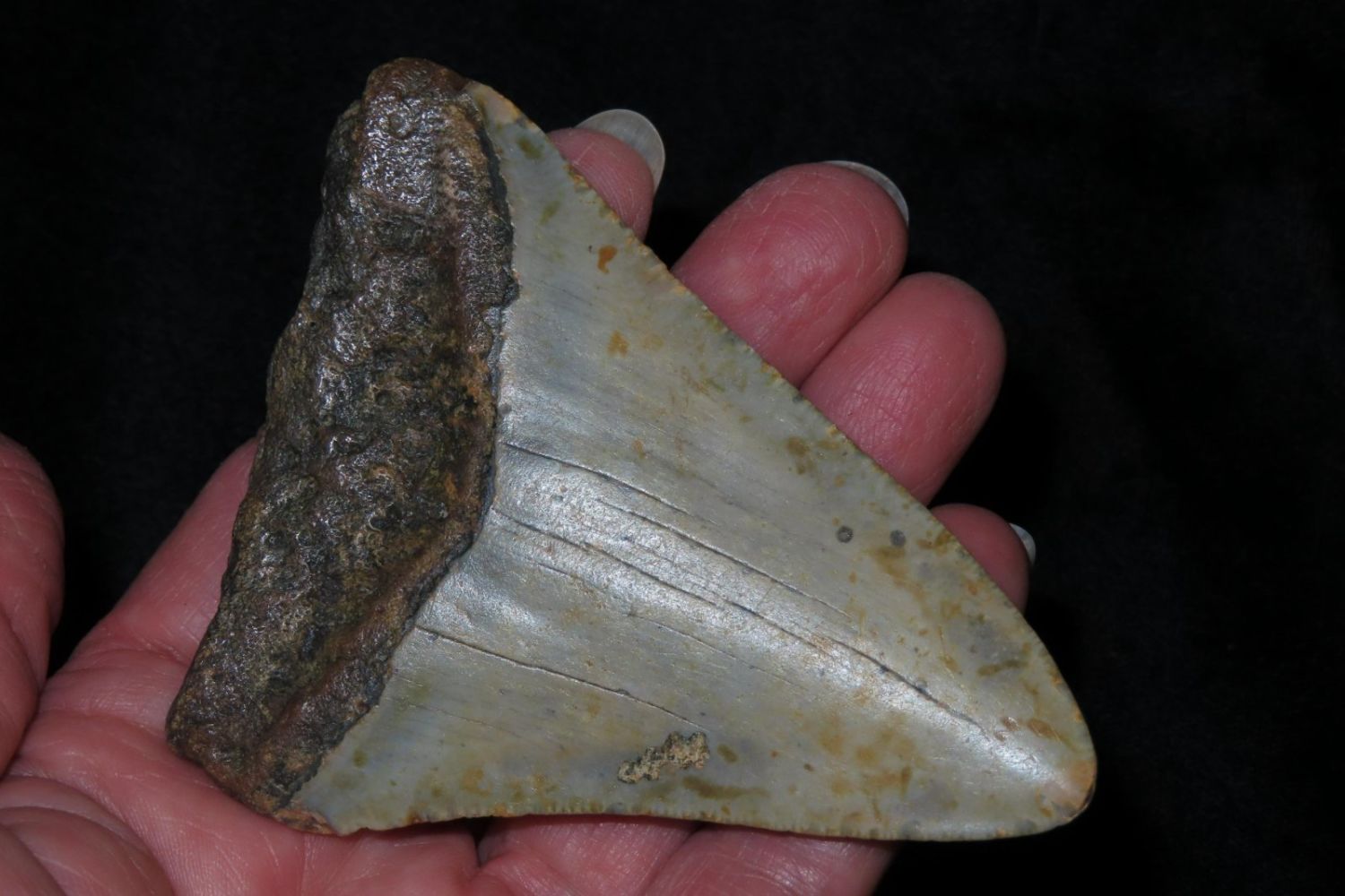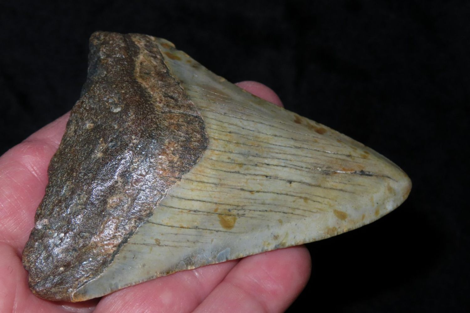 3 1/2″ Megaladon Shark Tooth Fossil, South Carolina Megalodon (Otodus megalodon), meaning “big tooth”, is an extinct species of mackerel shark that lived approximately 23 to 3.6 million years ago.