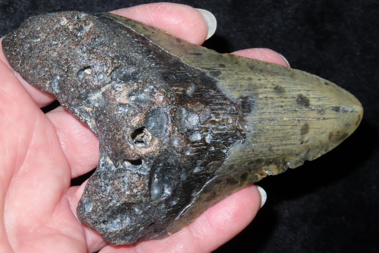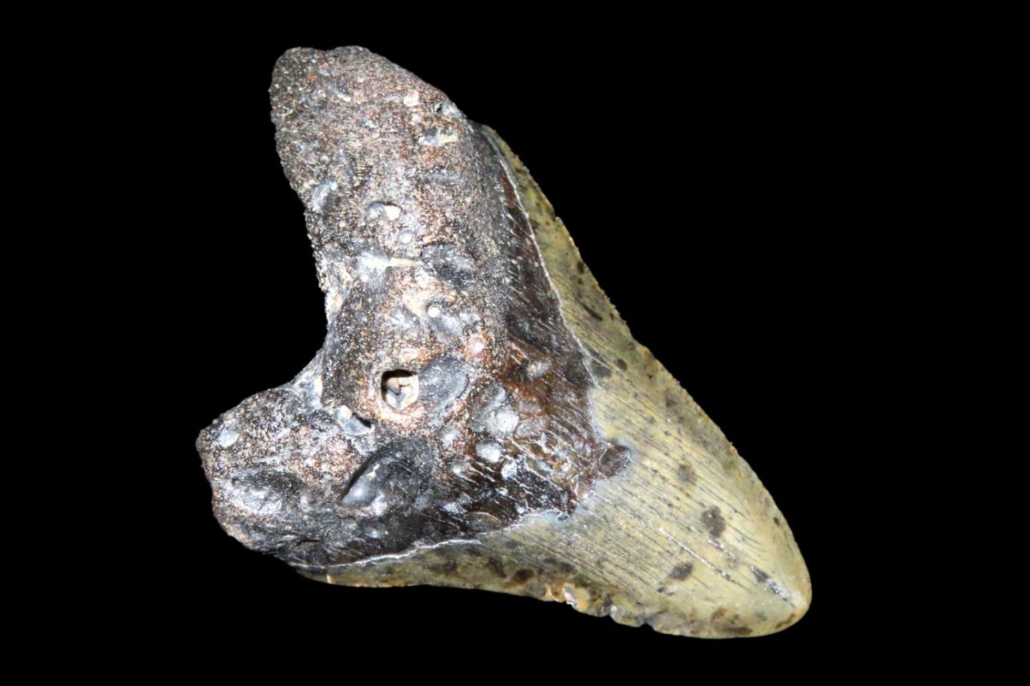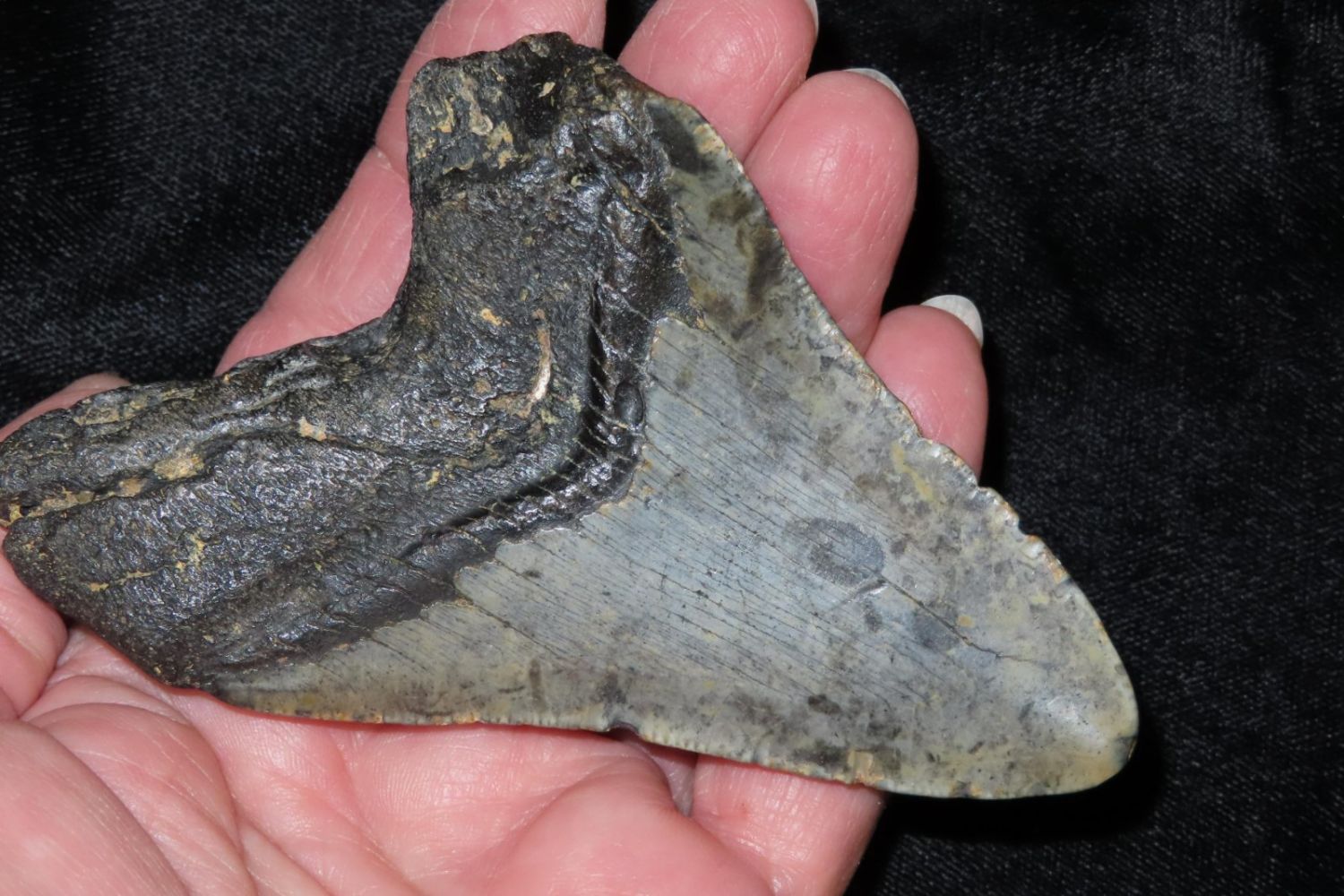 4 1/8″ Megaladon Shark Tooth Fossil, South Carolina Megalodon (Otodus megalodon), meaning “big tooth”, is an extinct species of mackerel shark that lived approximately 23 to 3.6 million years ago.