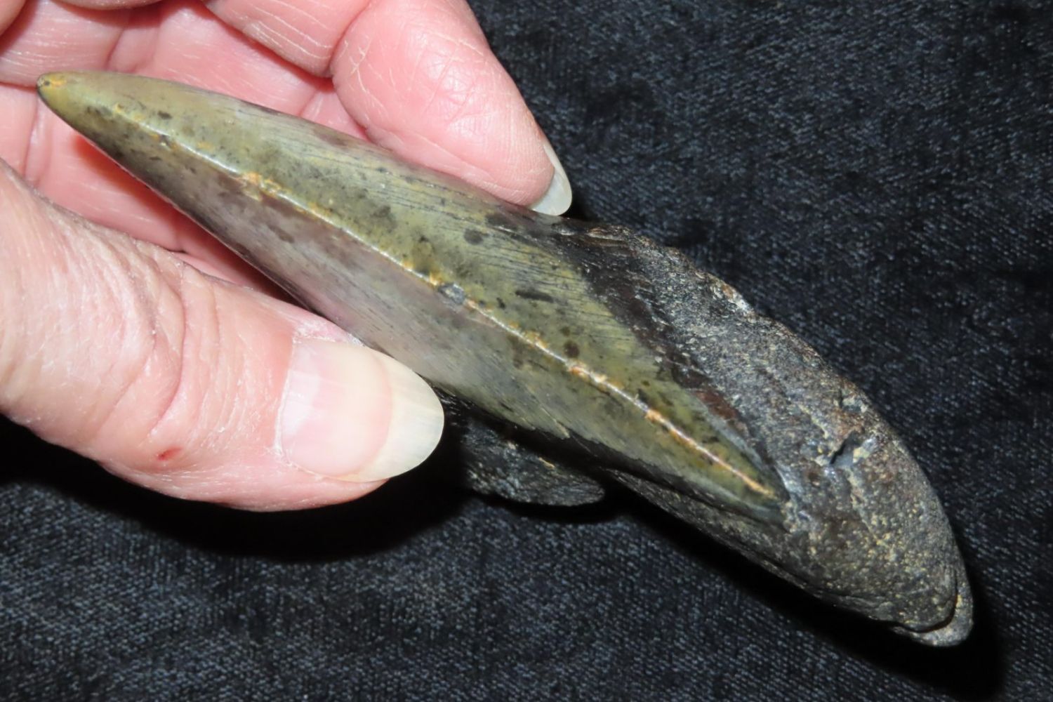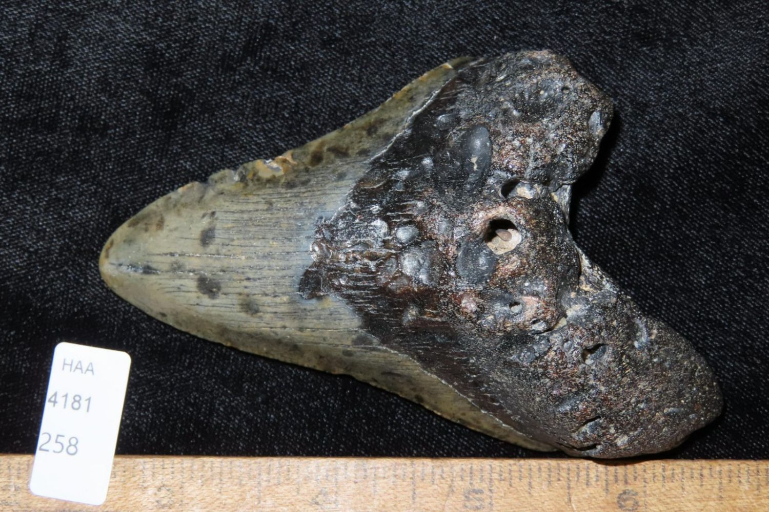 4 1/8" Megaladon Shark Tooth Fossil, South Carolina Megalodon (Otodus megalodon), meaning "big tooth", is an extinct species of mackerel shark that lived approximately 23 to 3.6 million years ago.