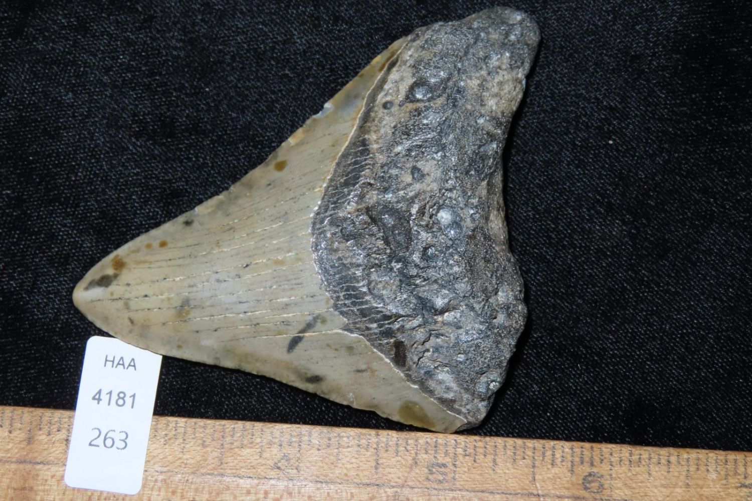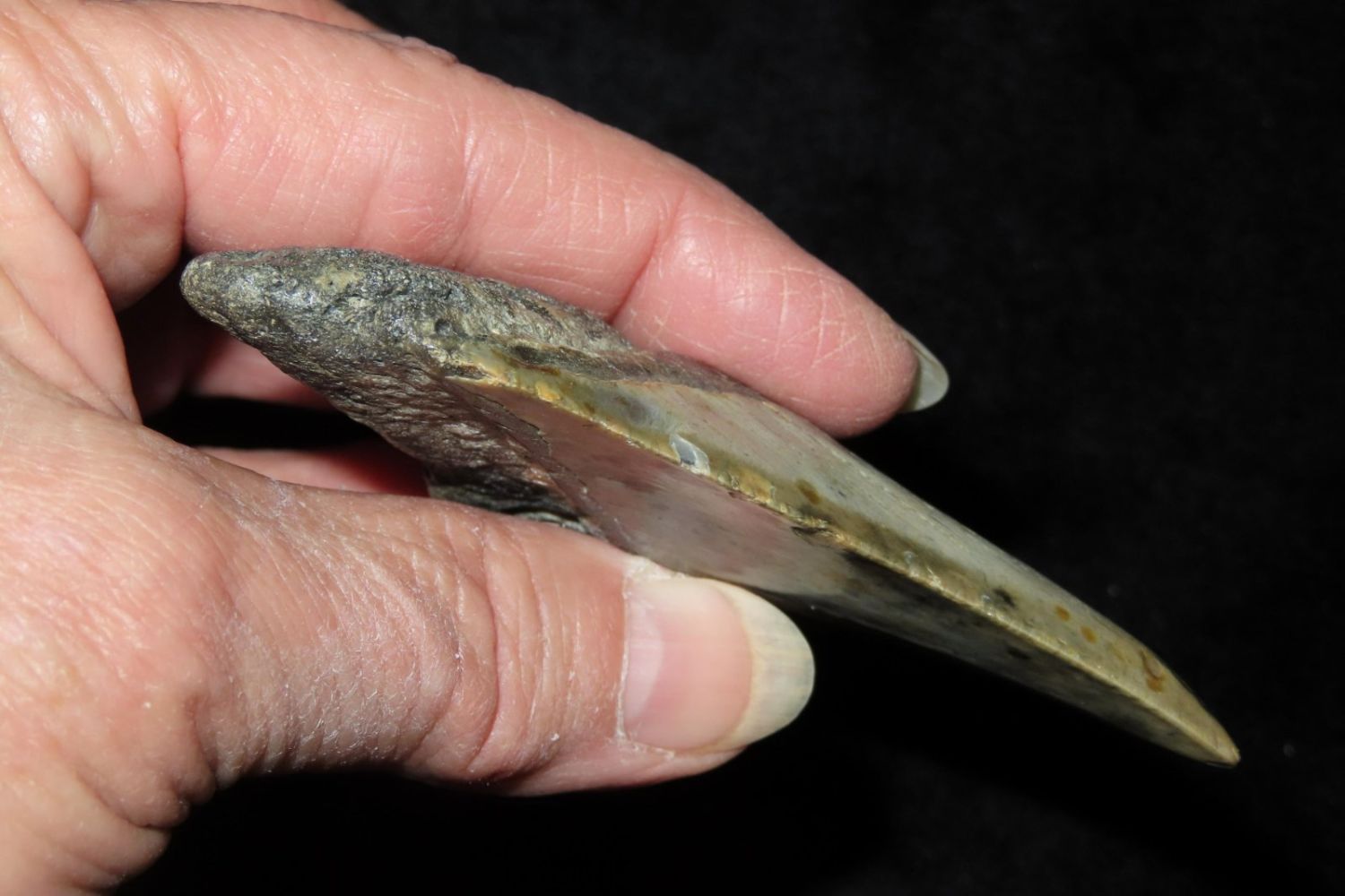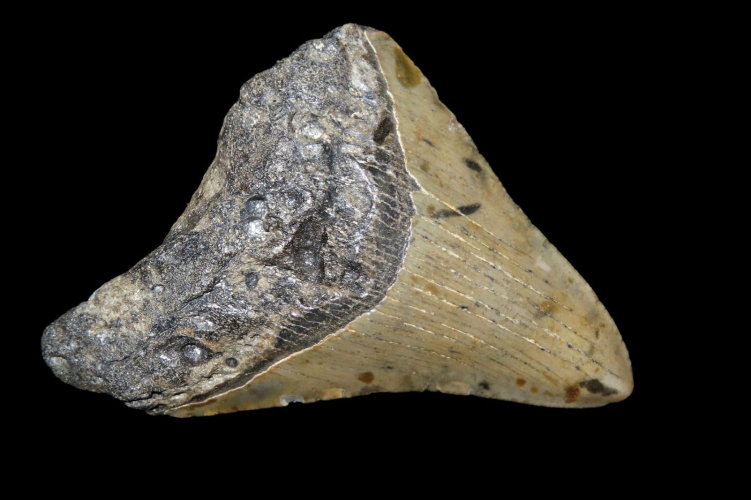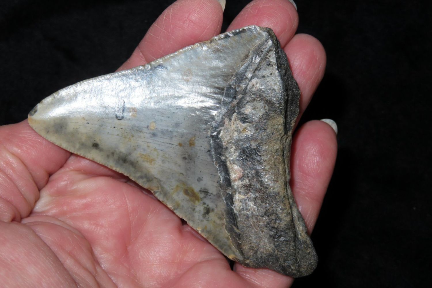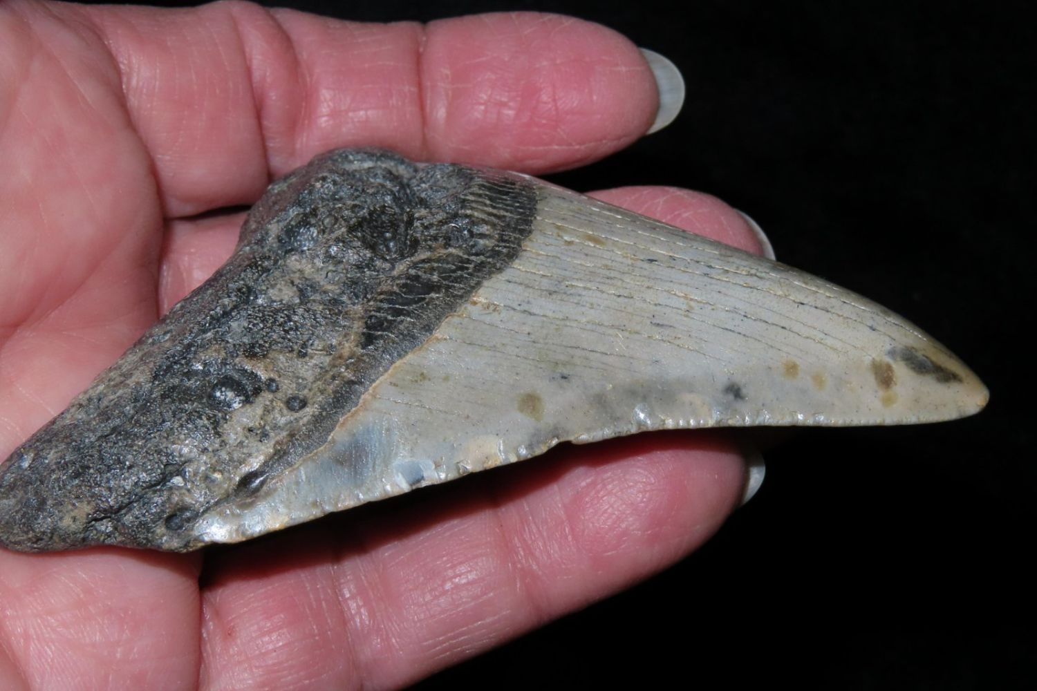3 1/2″ Megaladon Shark Tooth Fossil, South Carolina Megalodon (Otodus megalodon), meaning “big tooth”, is an extinct species of mackerel shark that lived approximately 23 to 3.6 million years ago.