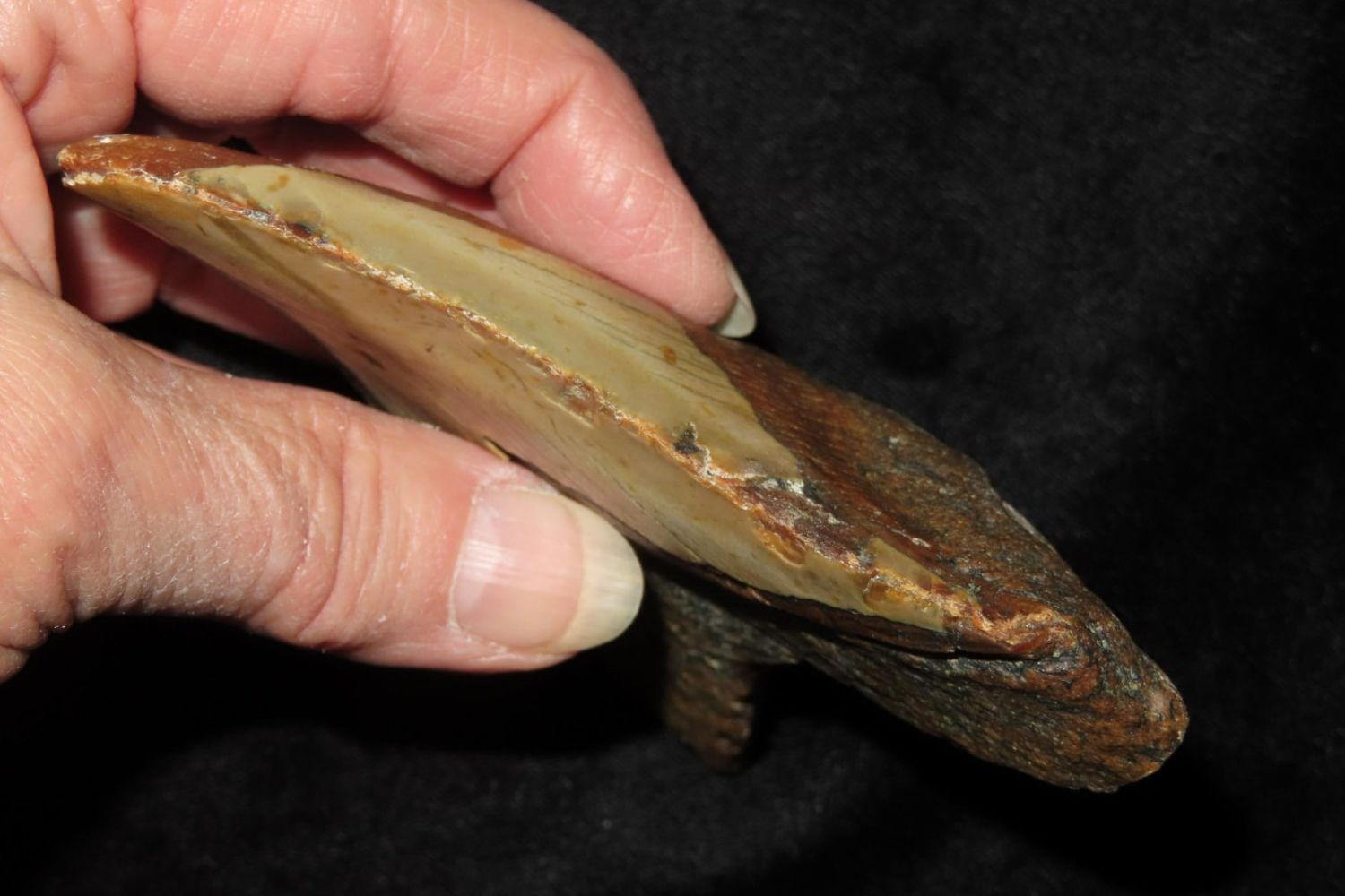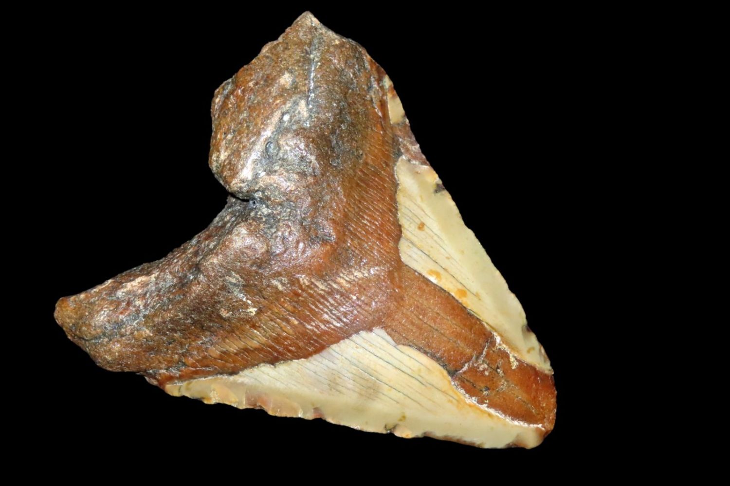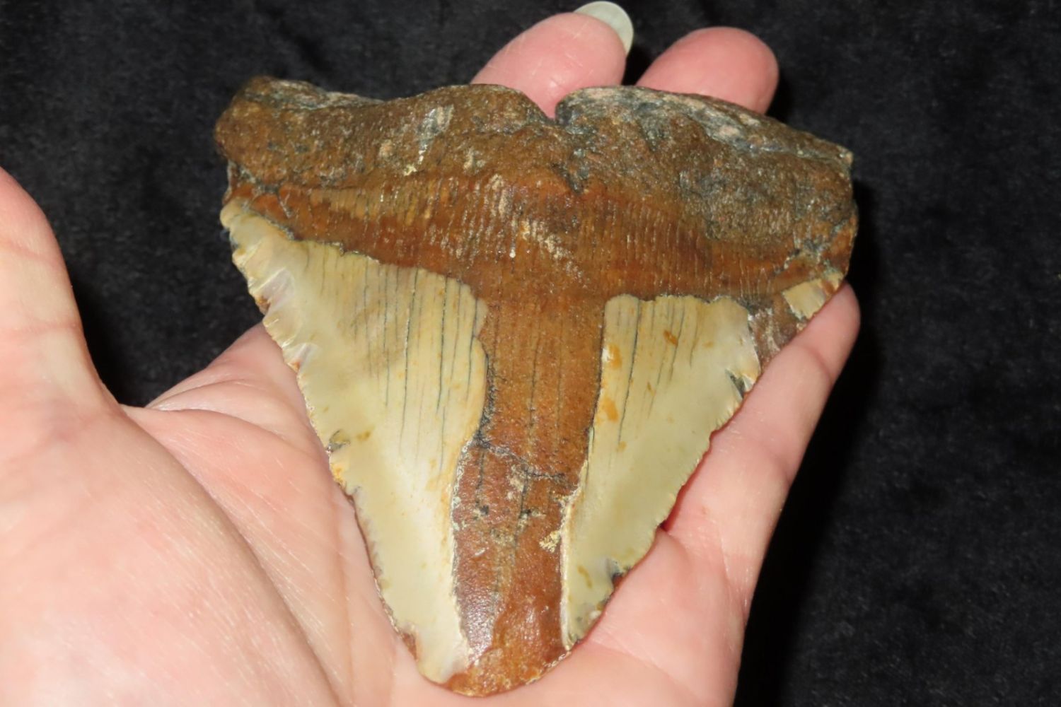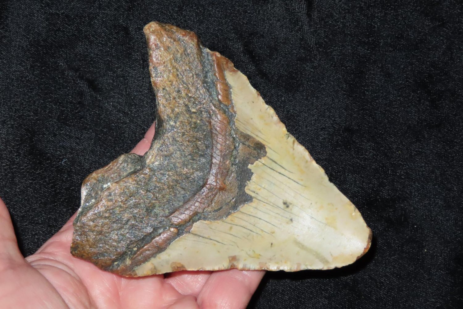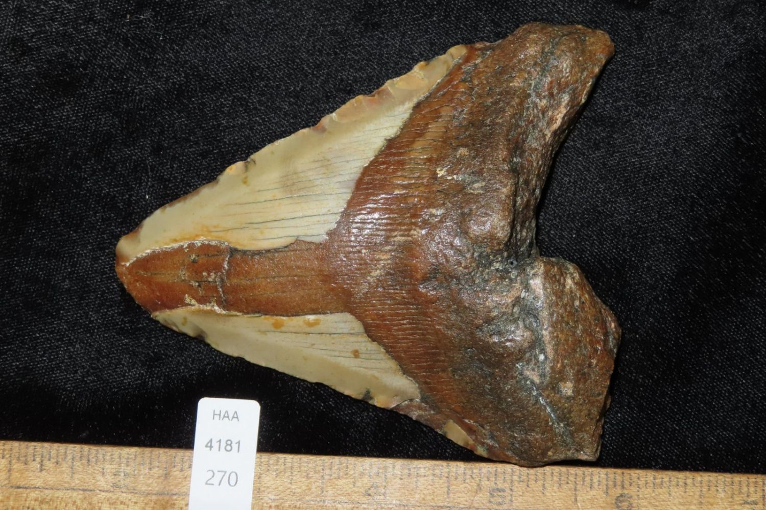 4 3/8″ Megaladon Shark Tooth Fossil, South Carolina Megalodon (Otodus megalodon), meaning “big tooth”, is an extinct species of mackerel shark that lived approximately 23 to 3.6 million years ago.