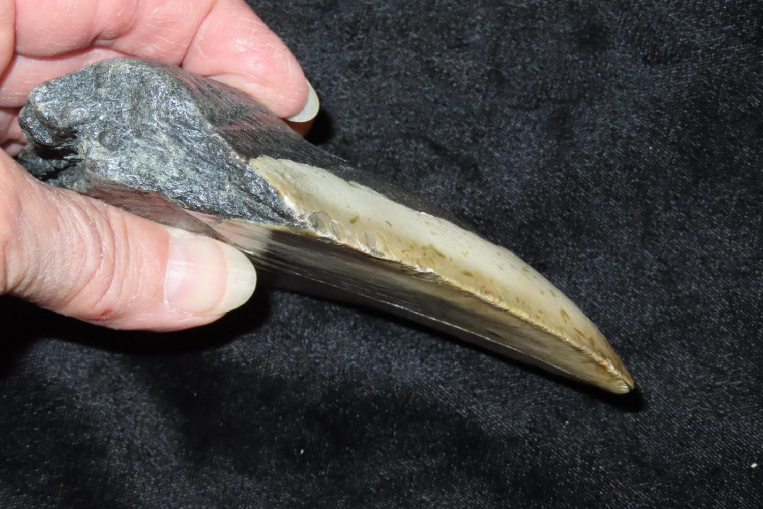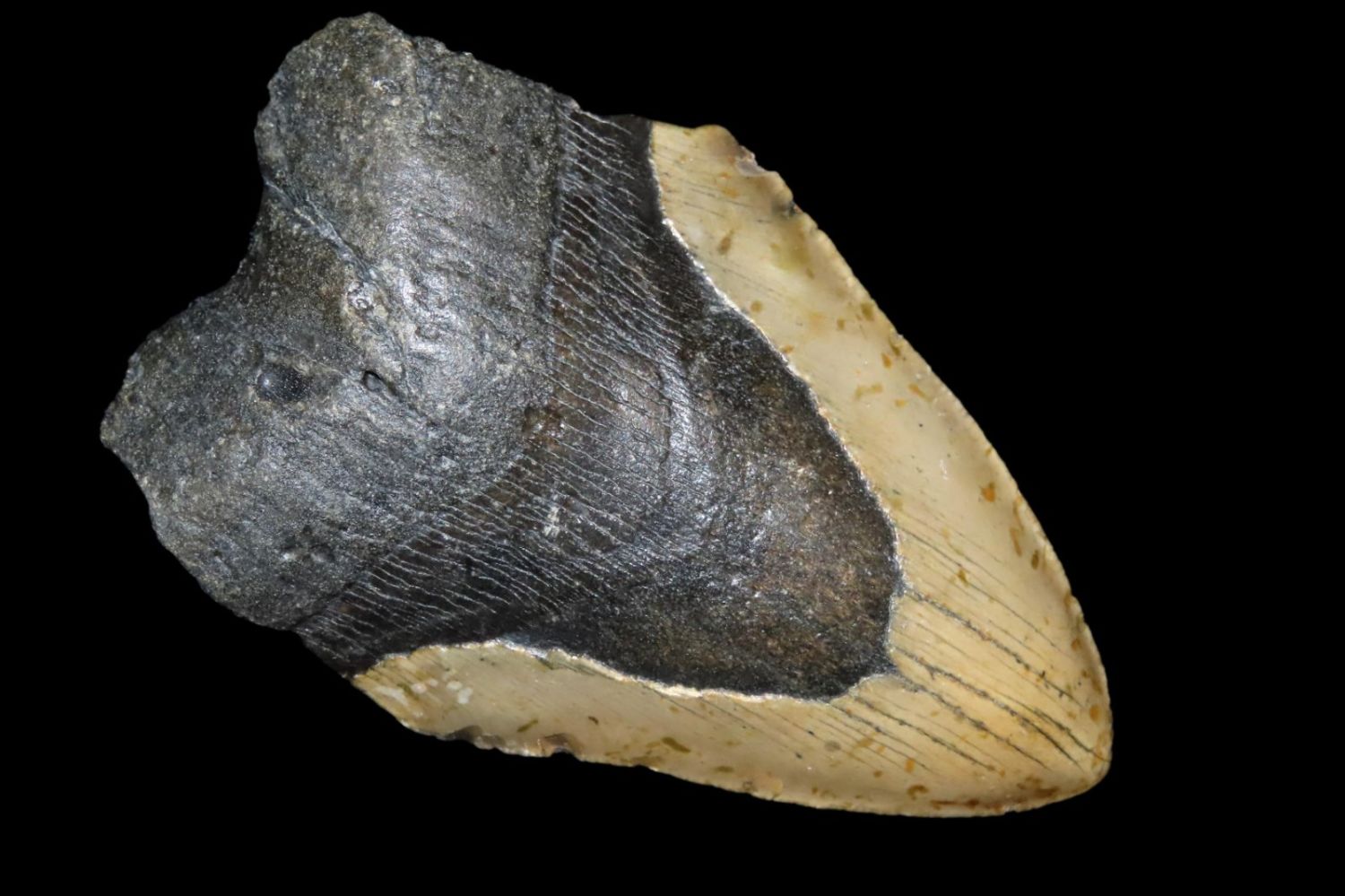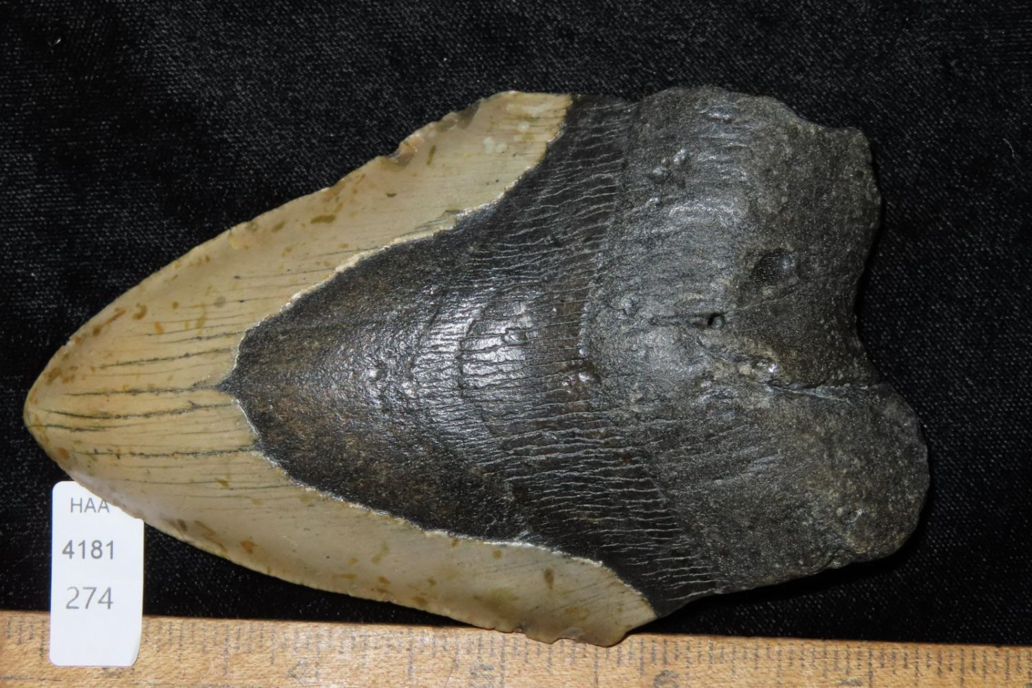 4 7/8″ Megaladon Shark Tooth Fossil, South Carolina Megalodon (Otodus megalodon), meaning “big tooth”, is an extinct species of mackerel shark that lived approximately 23 to 3.6 million years ago.