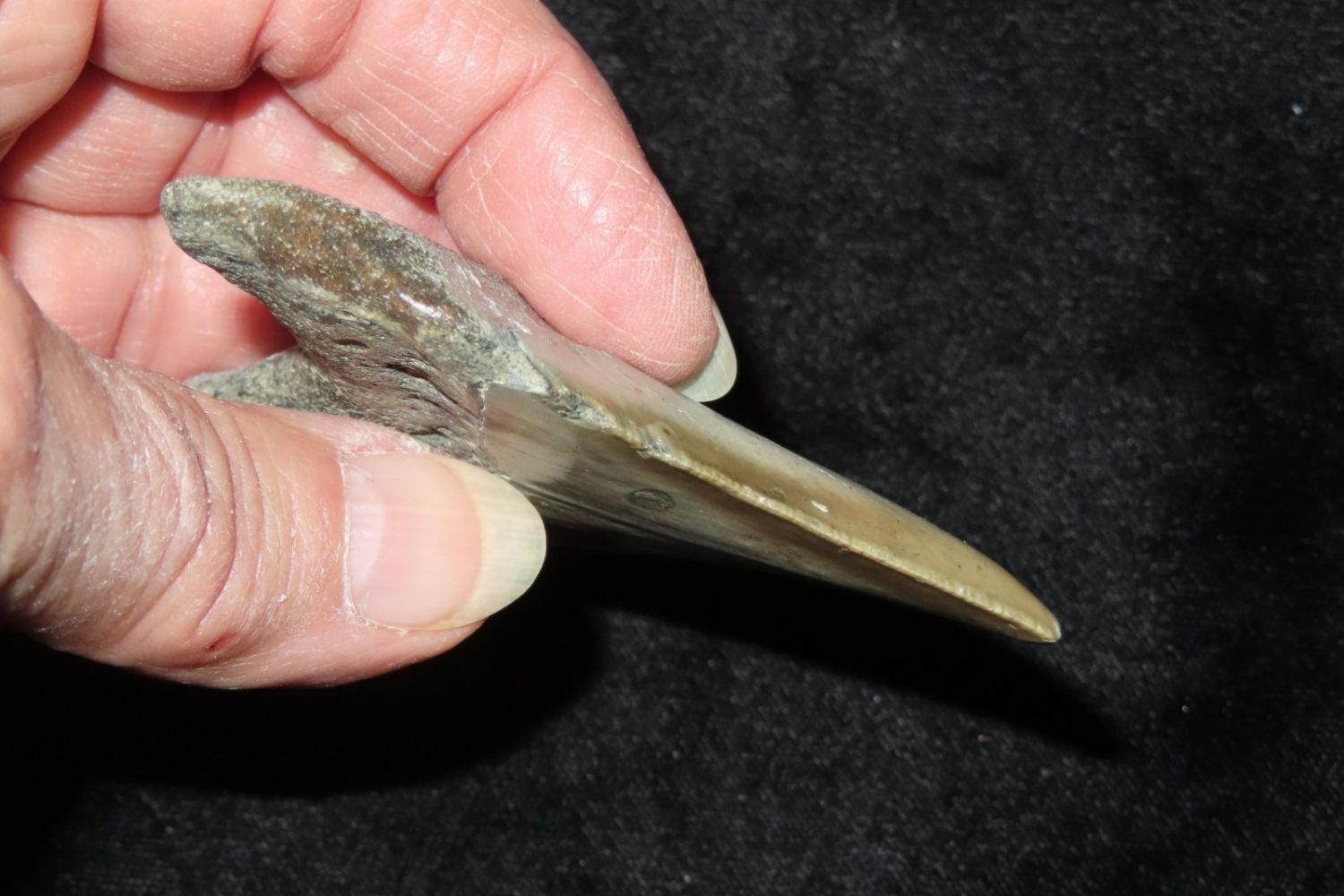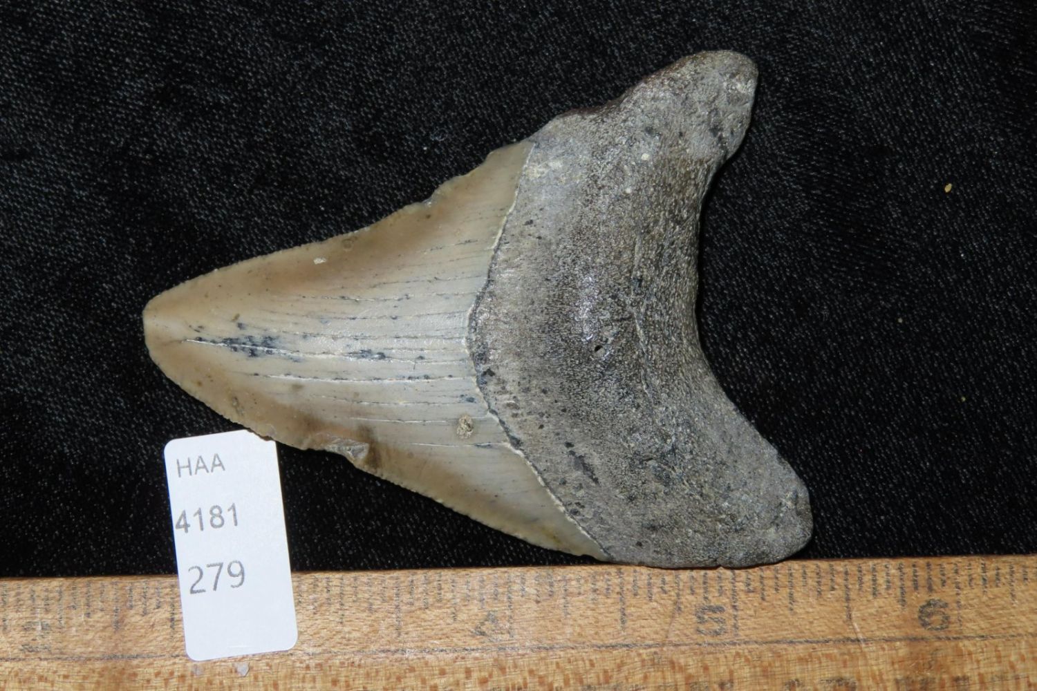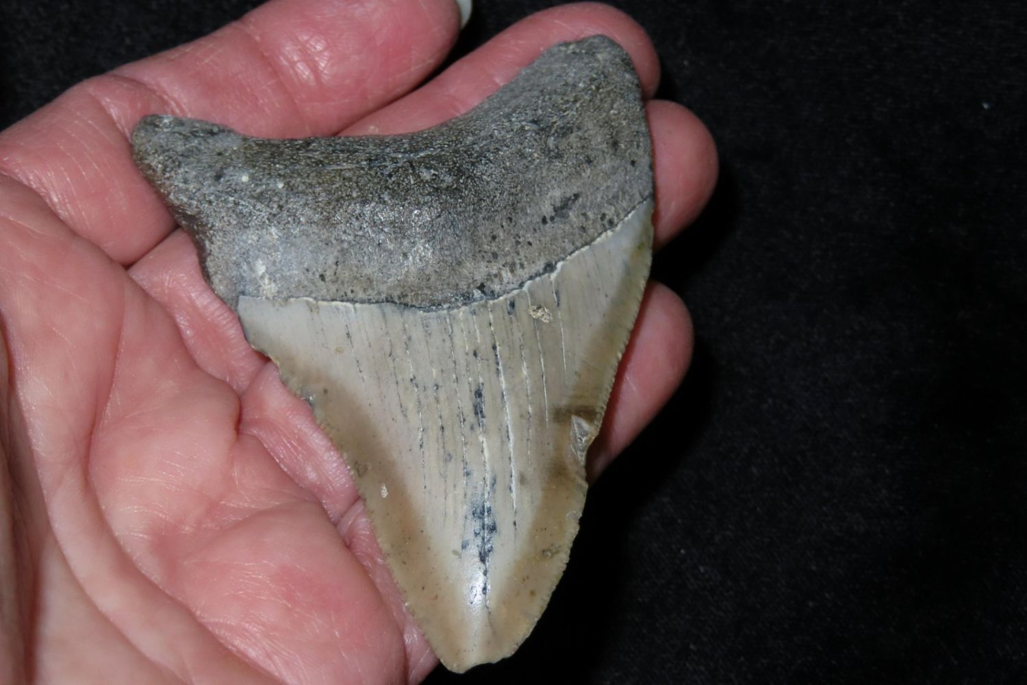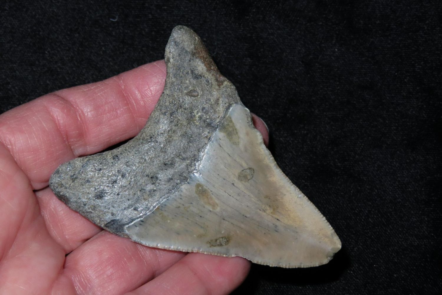 3 1/8″ Megaladon Shark Tooth Fossil, South Carolina Megalodon (Otodus megalodon), meaning “big tooth”, is an extinct species of mackerel shark that lived approximately 23 to 3.6 million years ago.