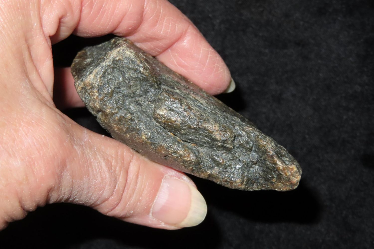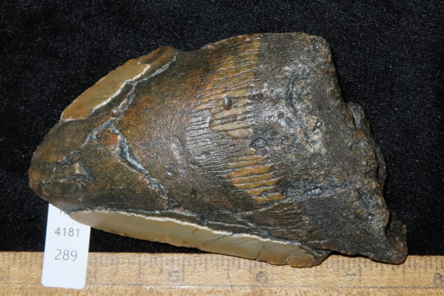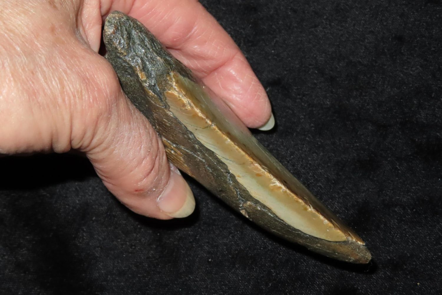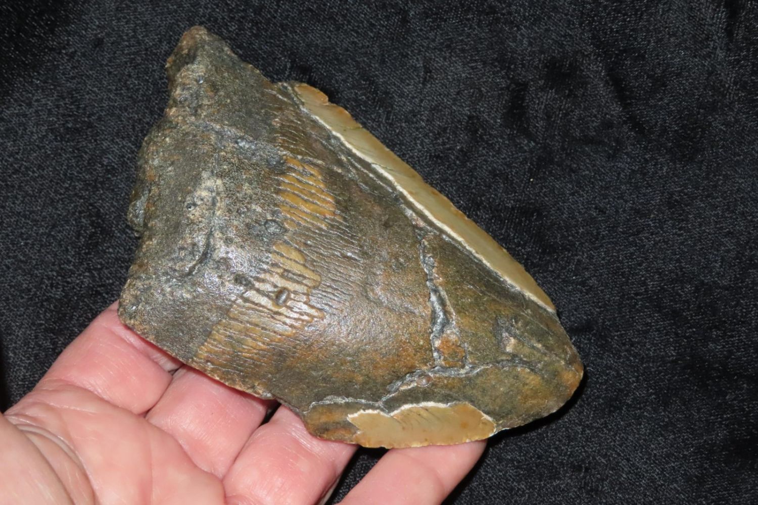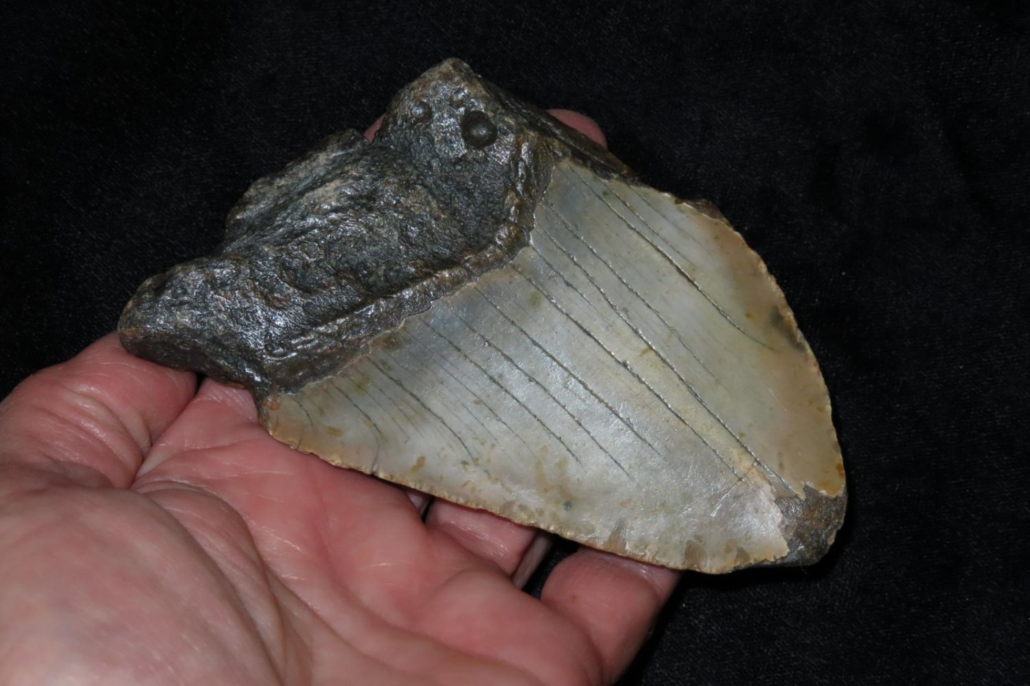 4 3/8″ Megaladon Shark Tooth Fossil, South Carolina Megalodon (Otodus megalodon), meaning “big tooth”, is an extinct species of mackerel shark that lived approximately 23 to 3.6 million years ago.