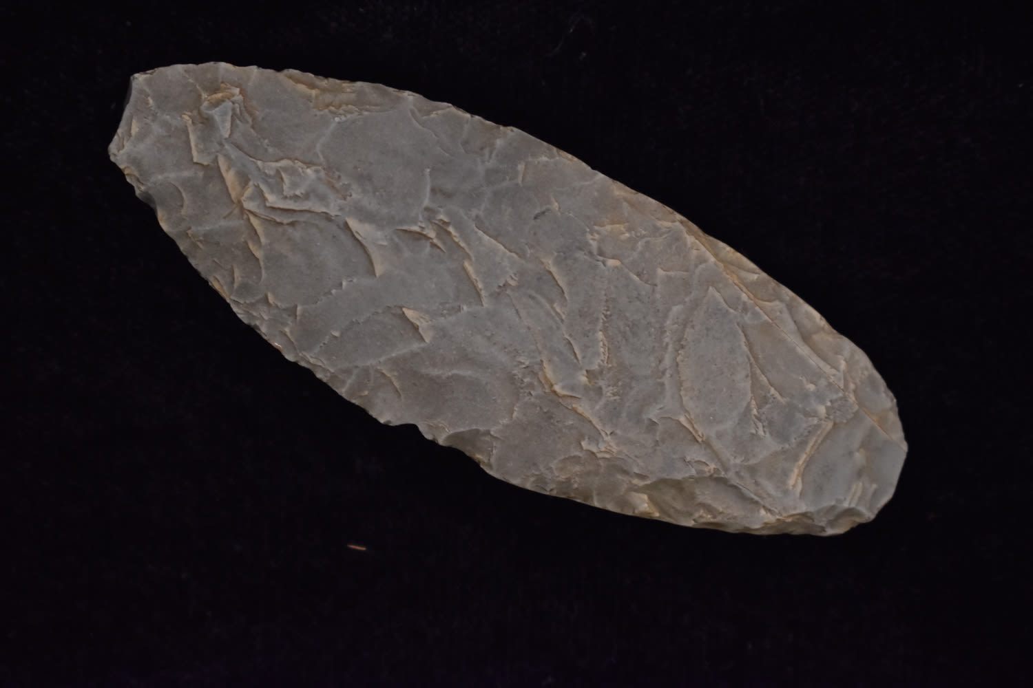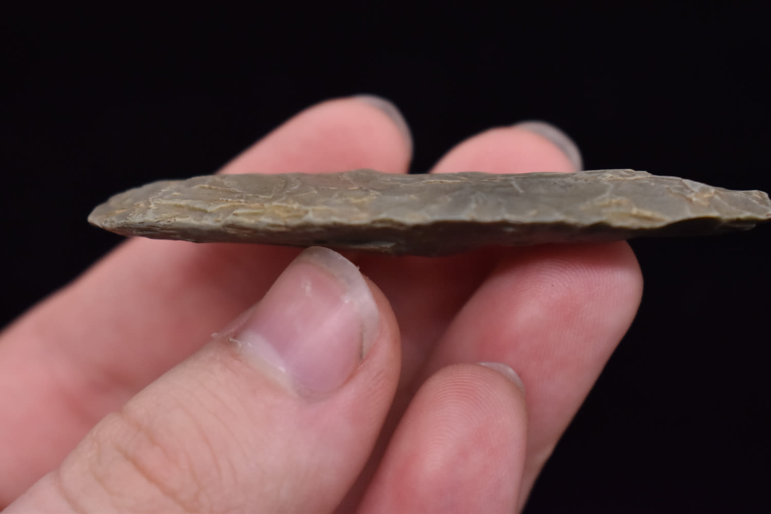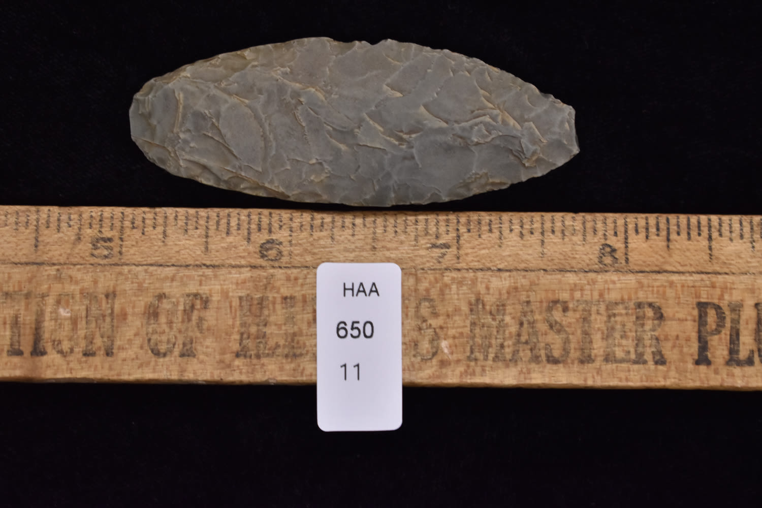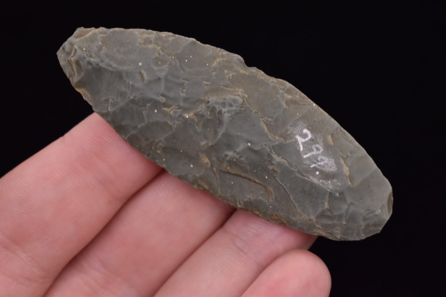 3 5/8″ Wll Flaked late Paleo Knife, heavy basal grinding, made of unique green colored flint, Ex Robert Hruska Collection, Milwaukee, Wisconsin