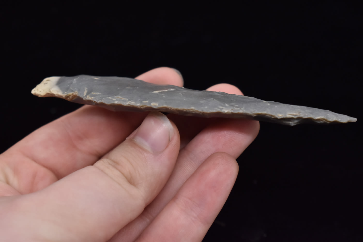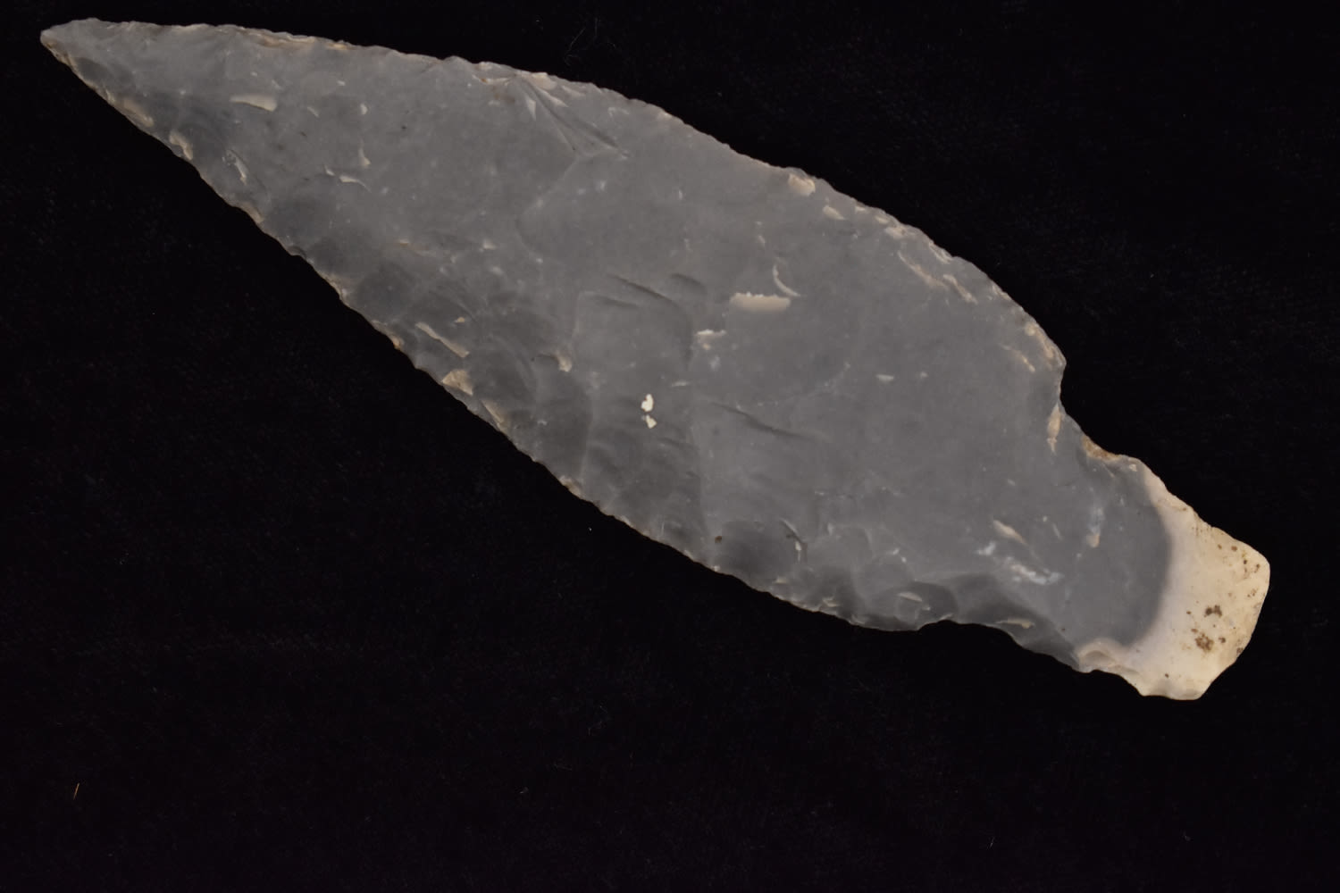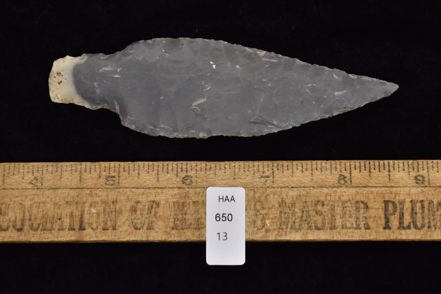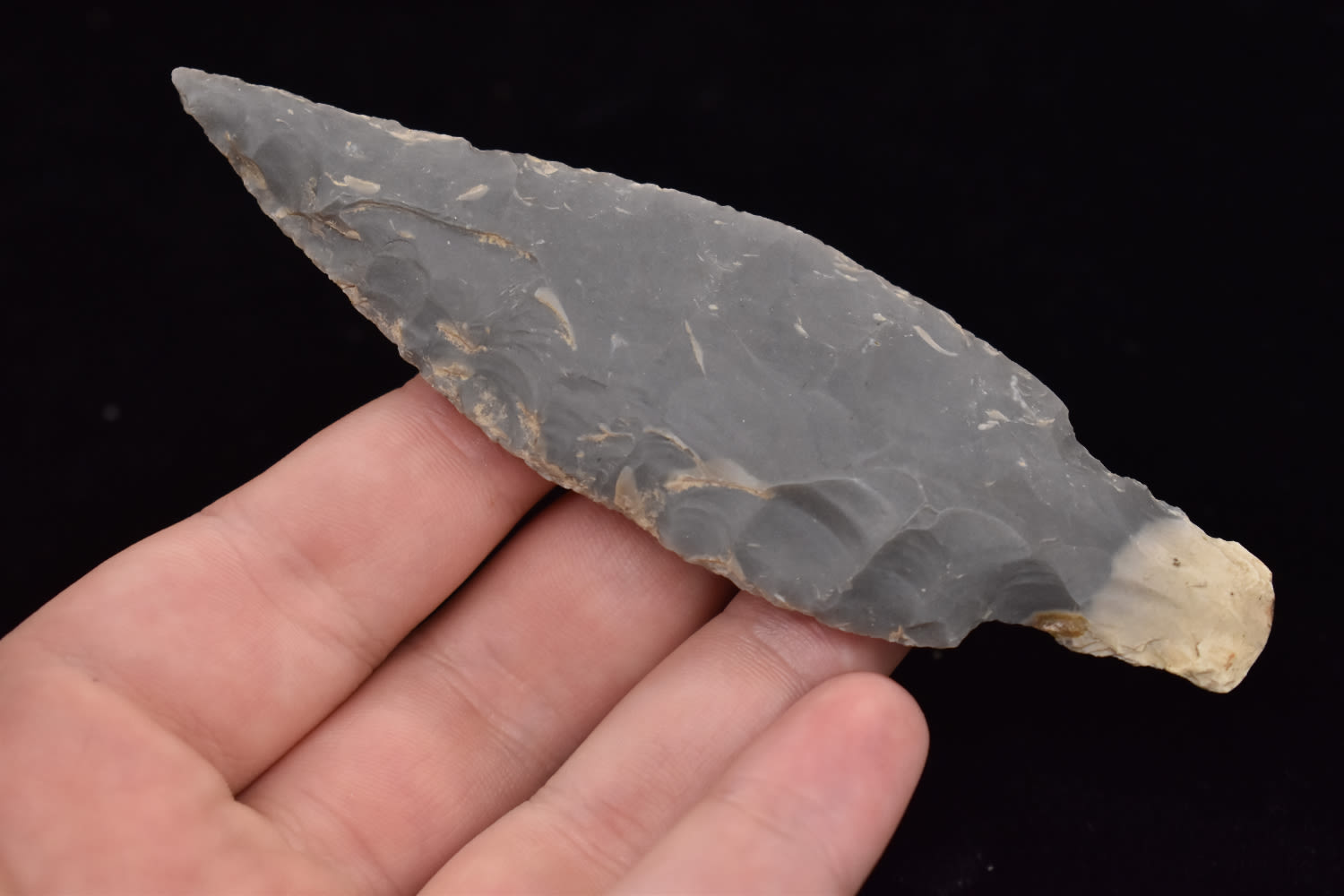 5 1/2″ Double Notch Turkey Tail fashioned out of Gray Hornstone, extremely well flaked,Ex Robert Hruska Collection, Milwaukee, Wisconsin
