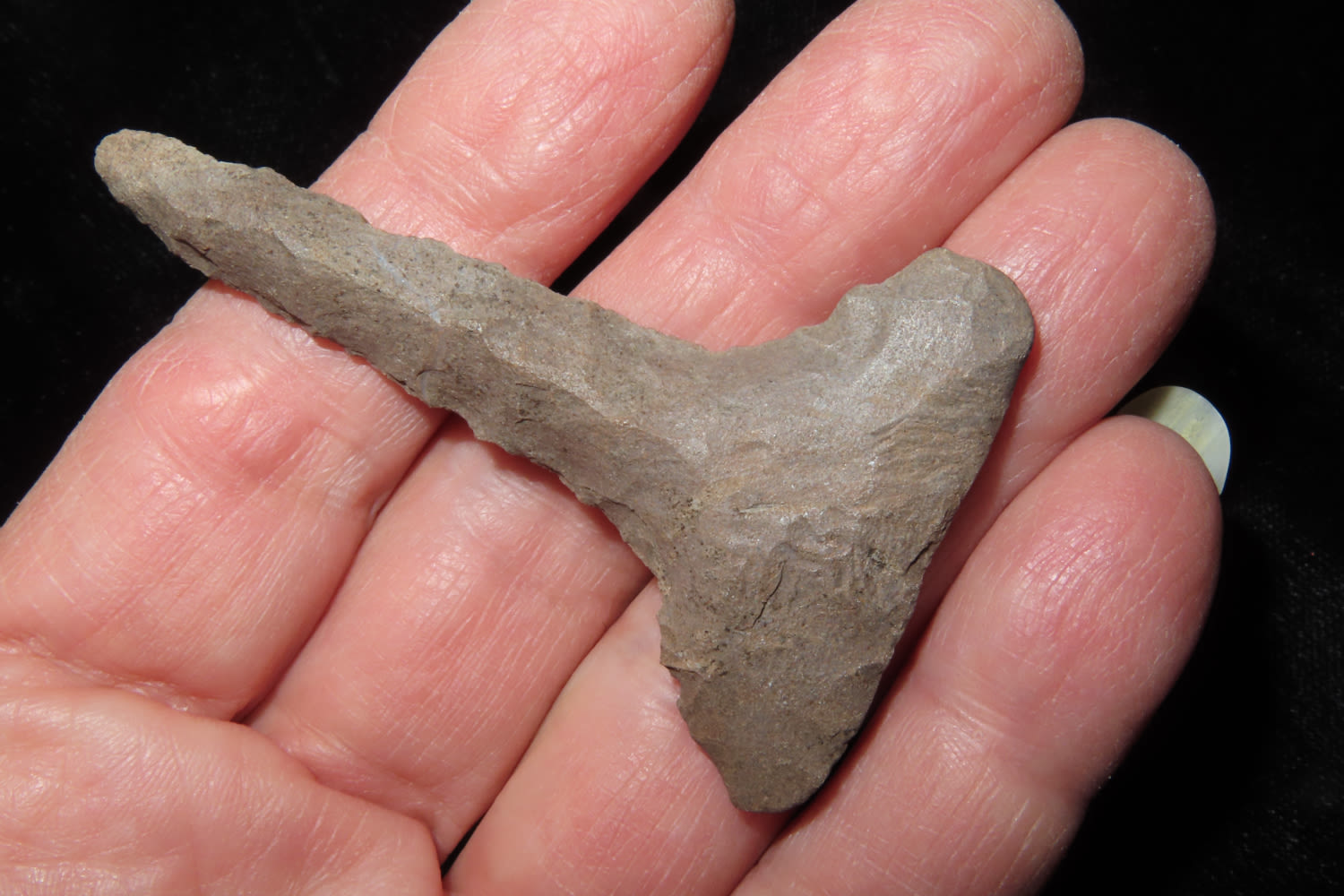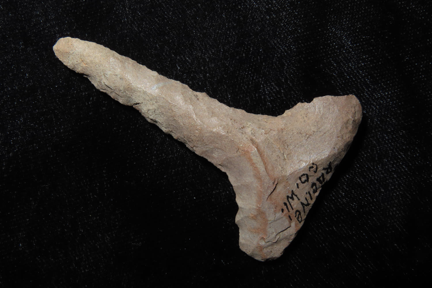3 3/8″ Archaic Thebes Drill found in Racine Co, Wisconsin, Ex Robert Hruska Collection, Milwaukee, Wisconsin