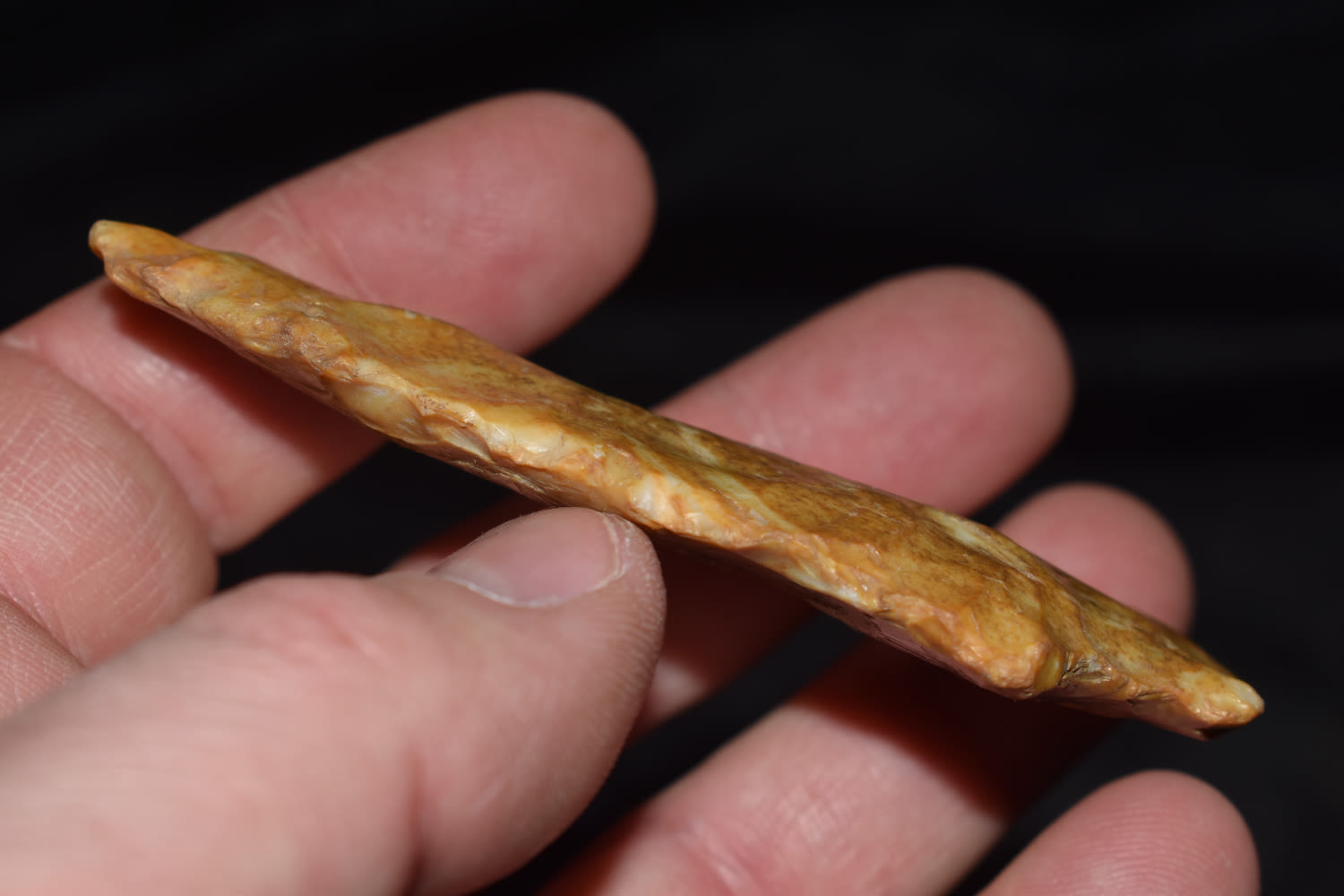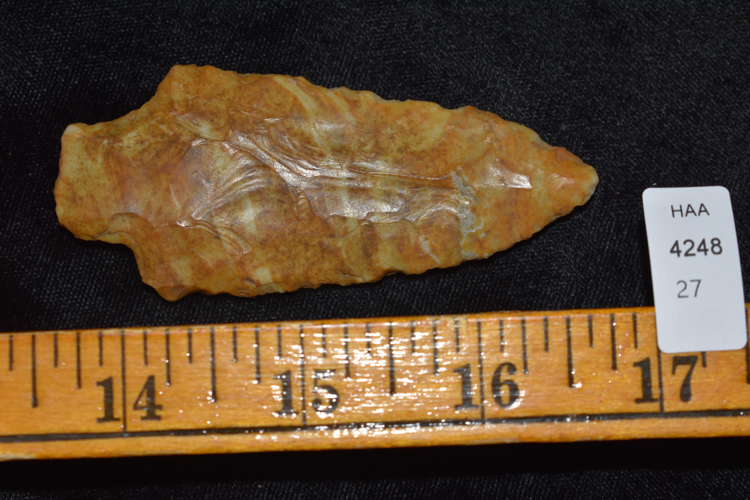 3 5/16″ Adena Robins made from a stunning river stained flint found by Ben Bauer in Polk Co, Missouri.