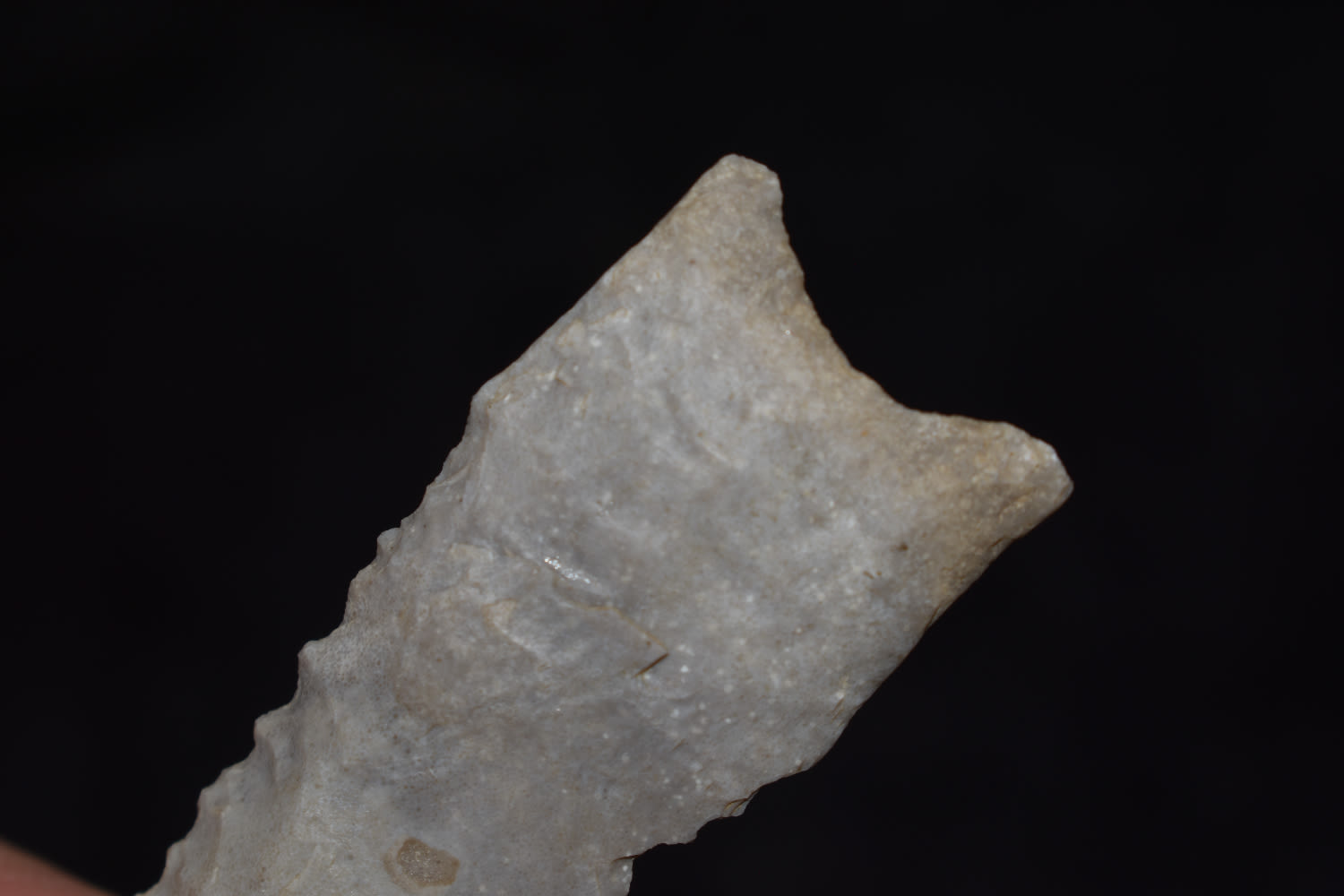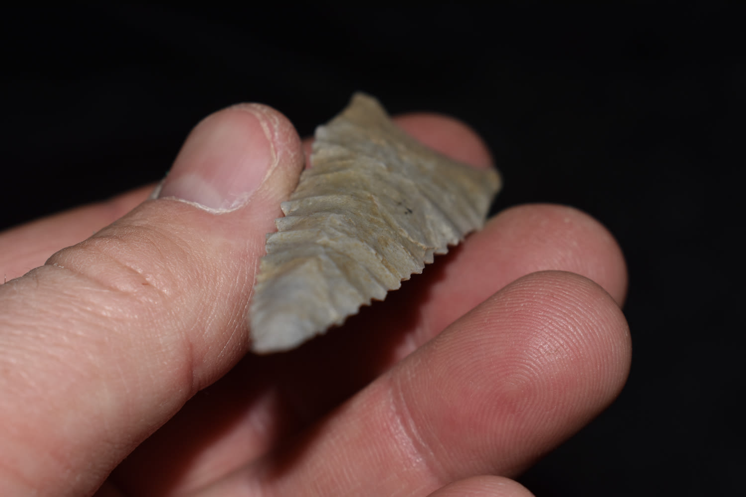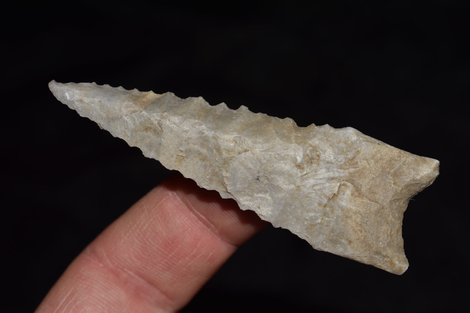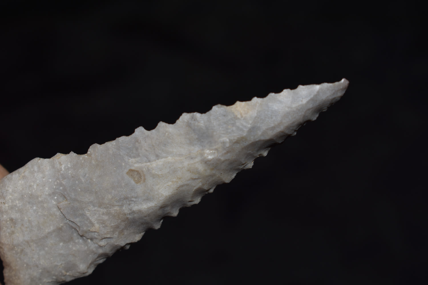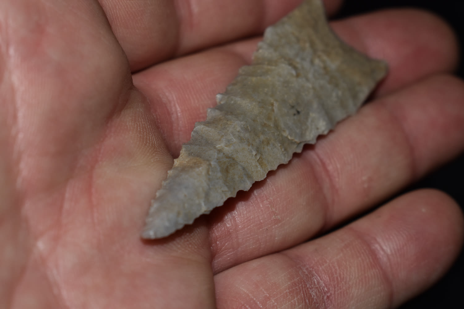 2 7/8″ Serated Dalton made from a pretty blueish gray flint found by Ben Bauer in Polk Co, Missouri.