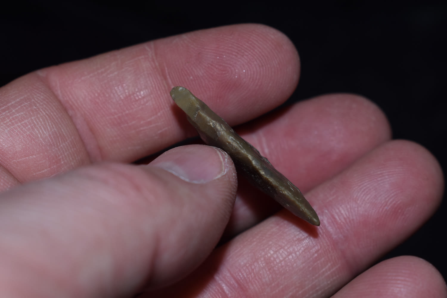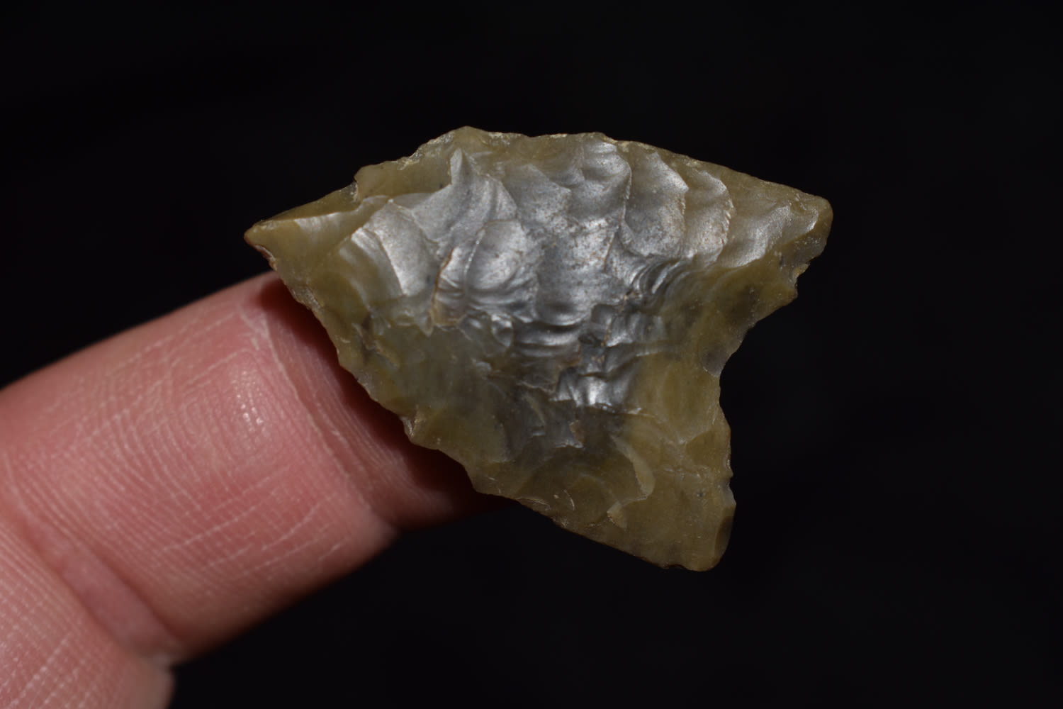 1 5/16″ Paleo Goshen a rare piece with a impact fracture from use found by Ben Bauer in Polk Co, Missouri.