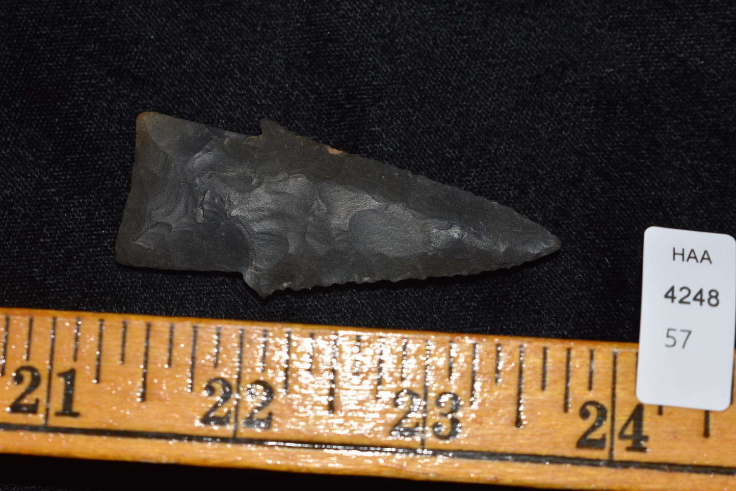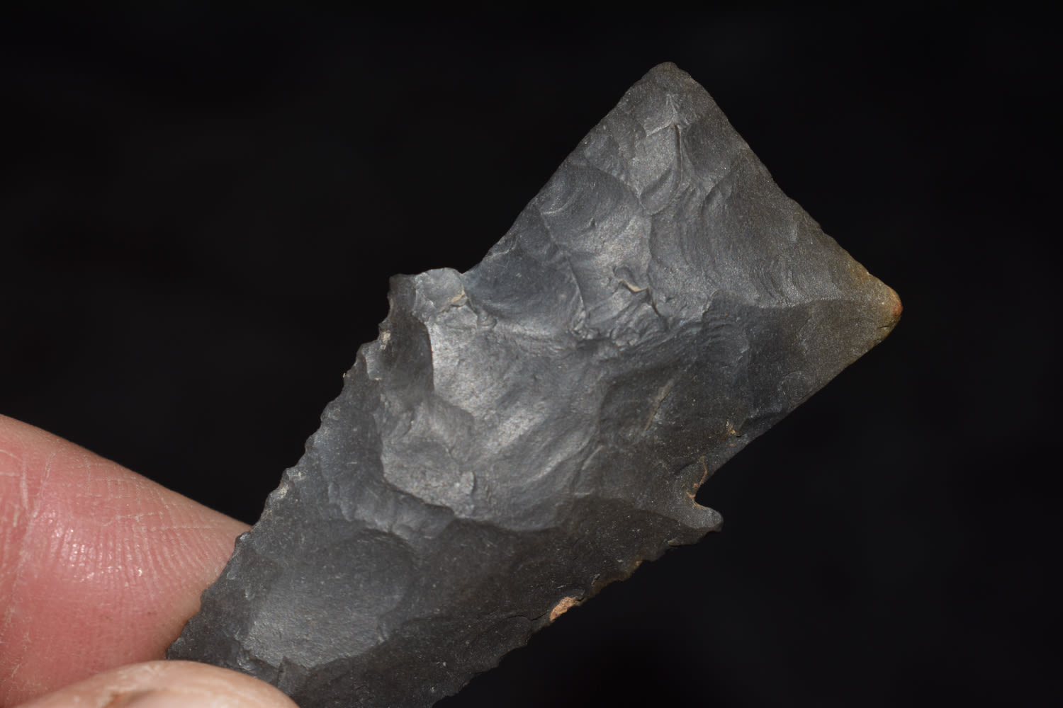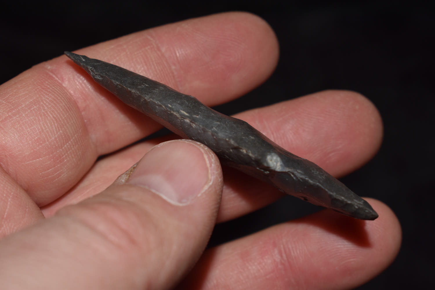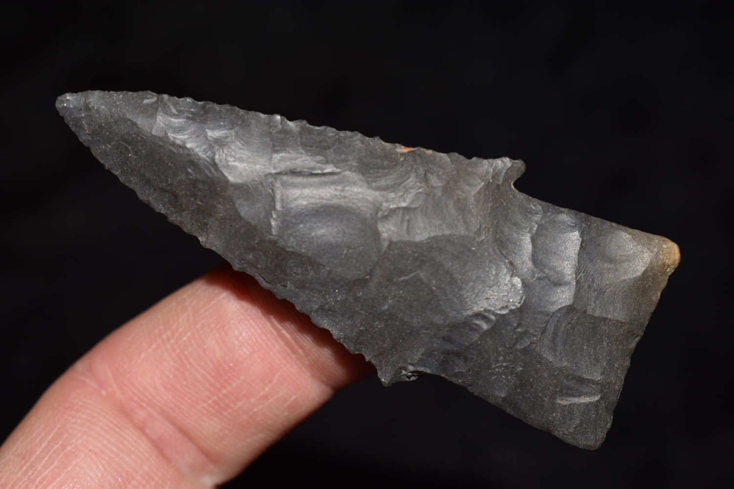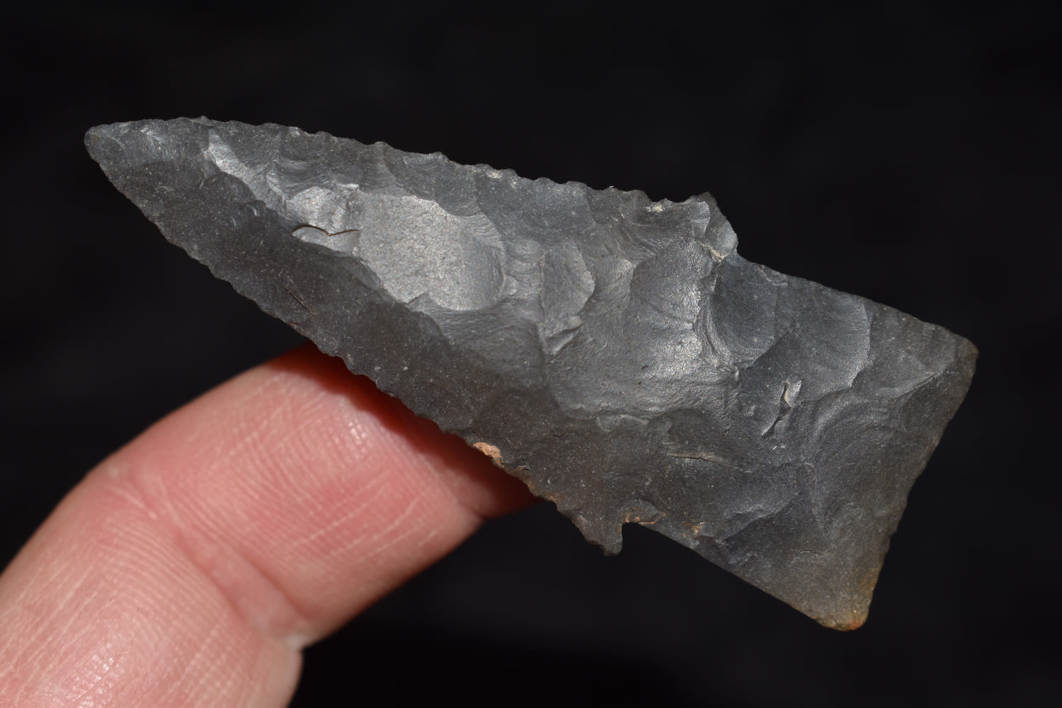 2 9/16″ Serated Hardin made from a black flint found by Ben Bauer in Polk Co, Missouri.
