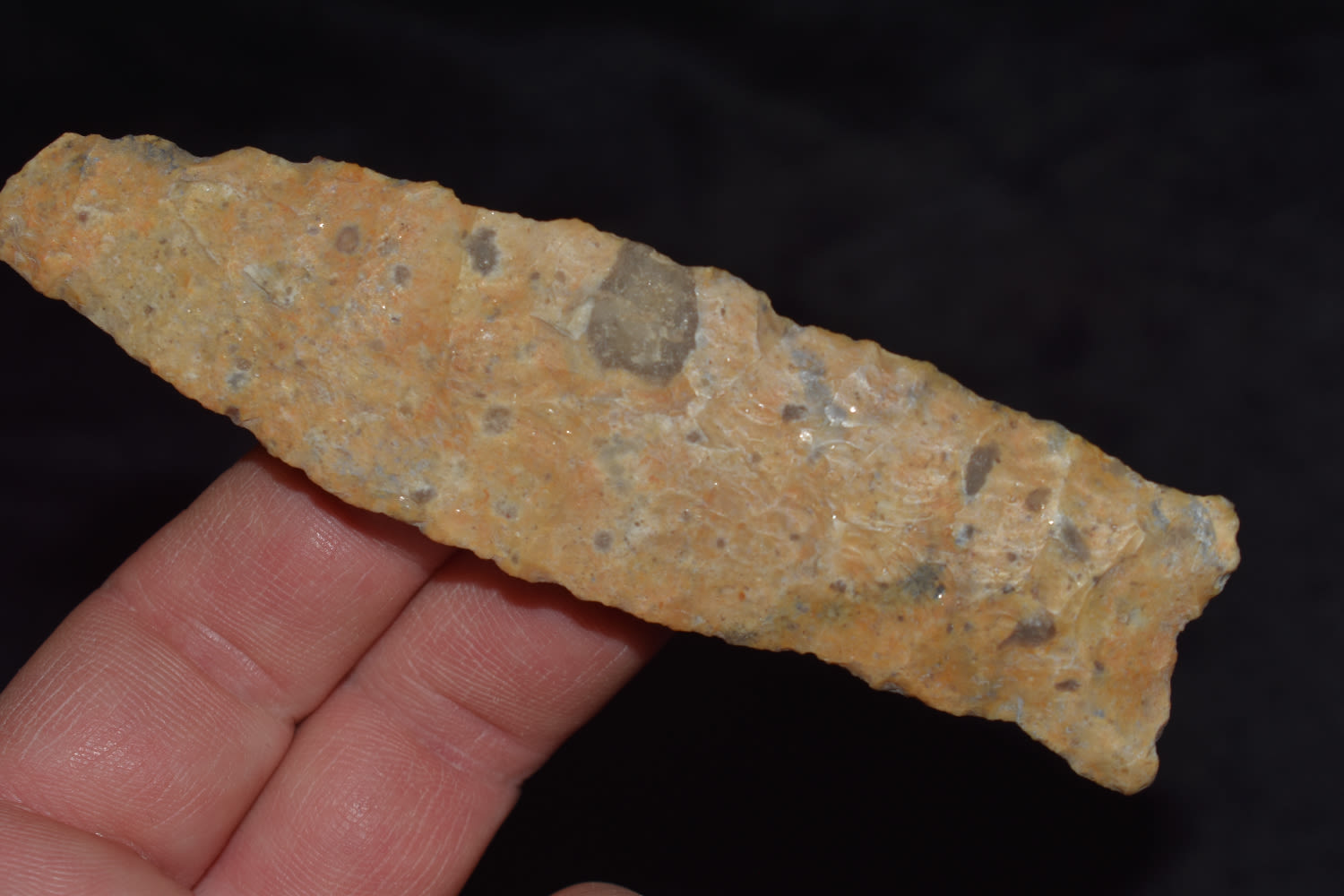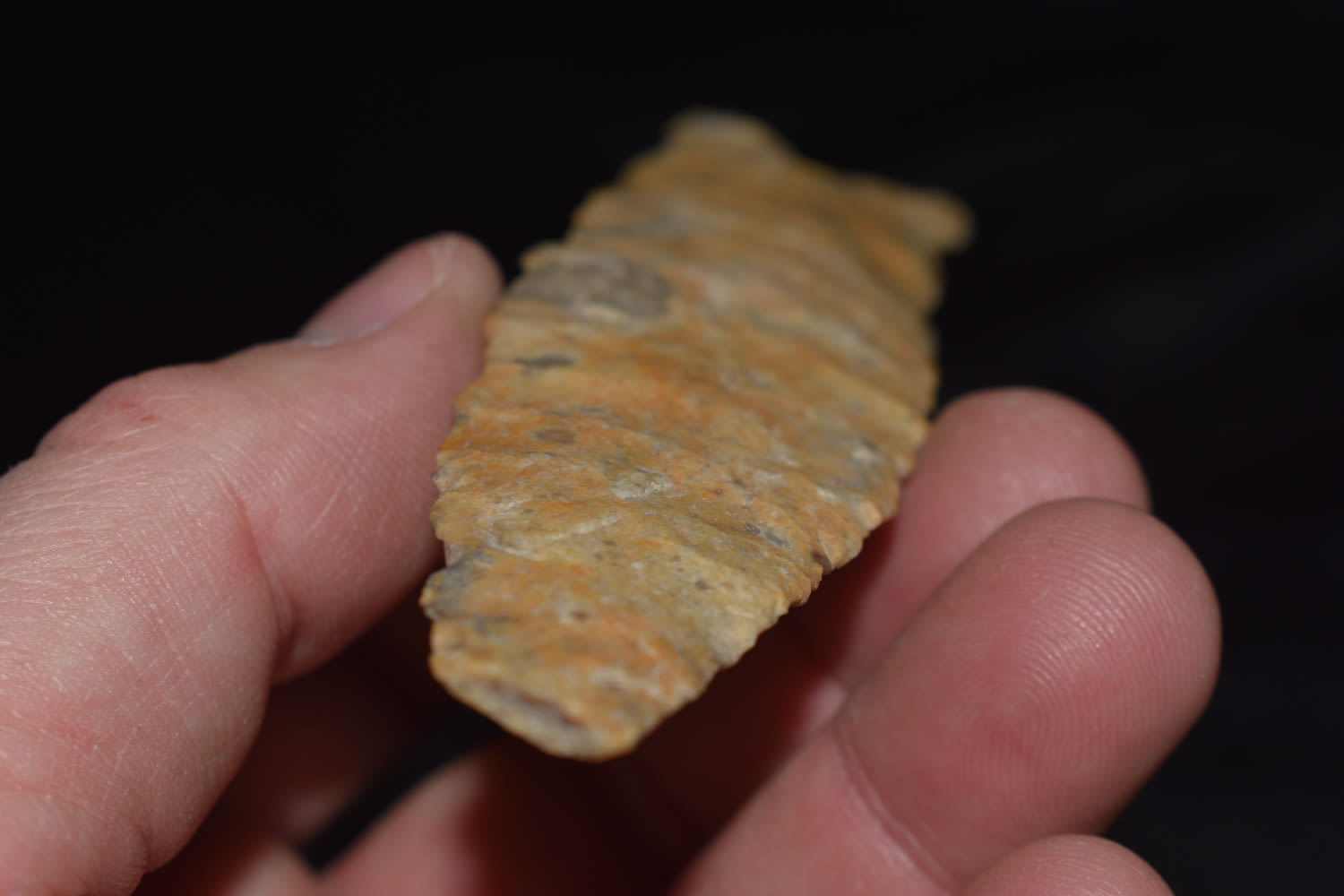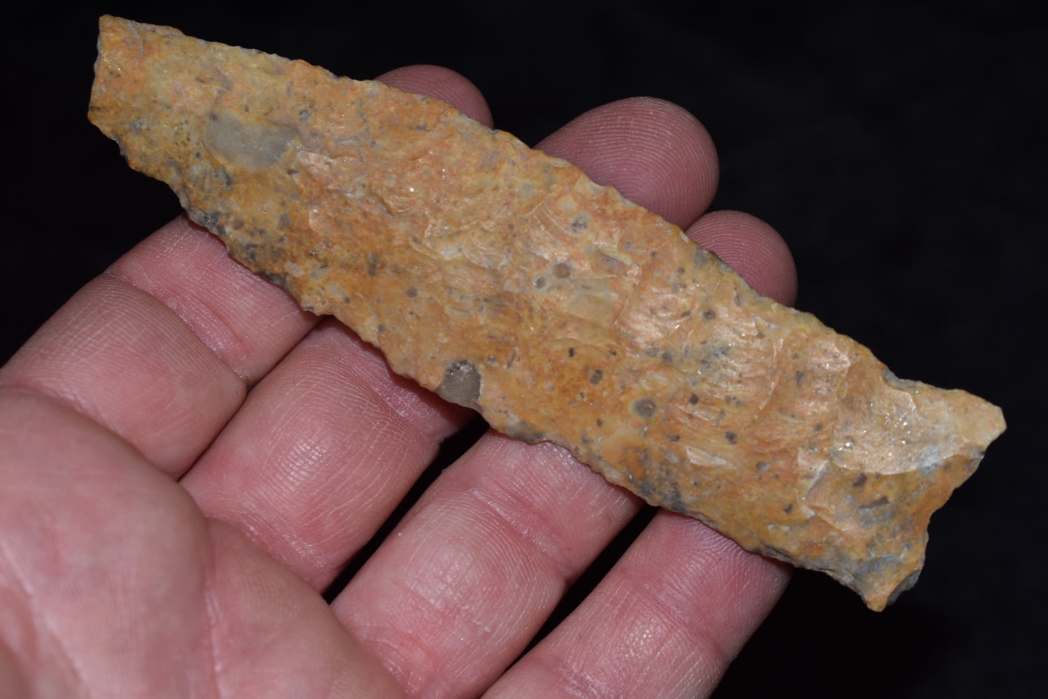4 3/8″ Paleo Heartbreaker with beautiful flaking found by Ben Bauer in Polk Co, Missouri.
