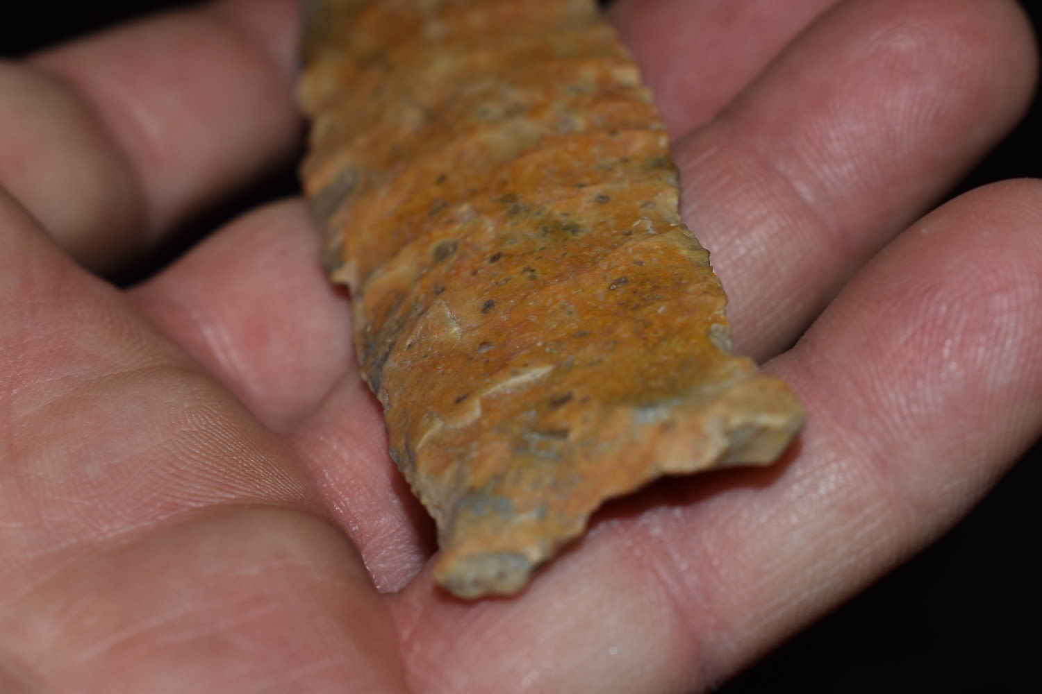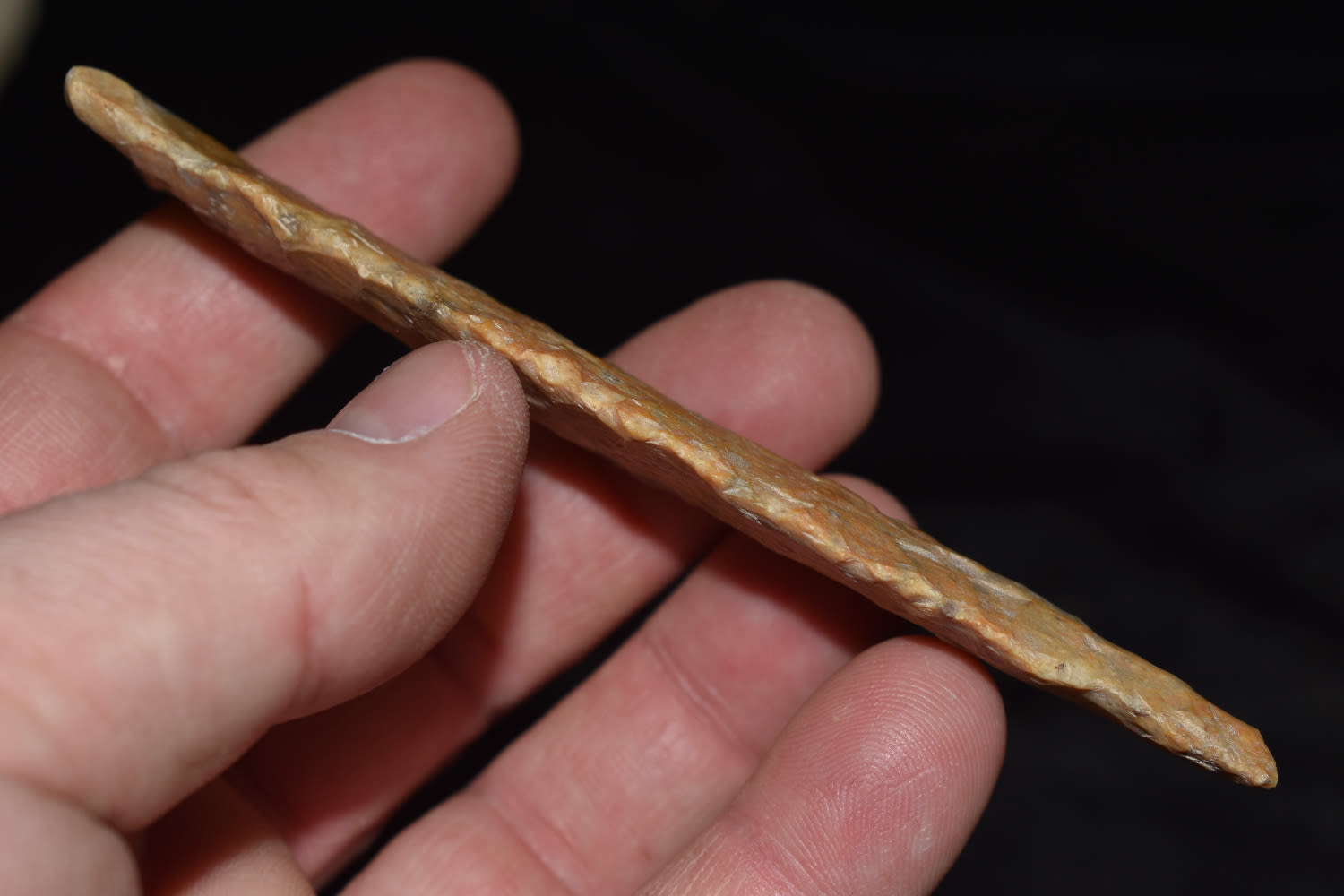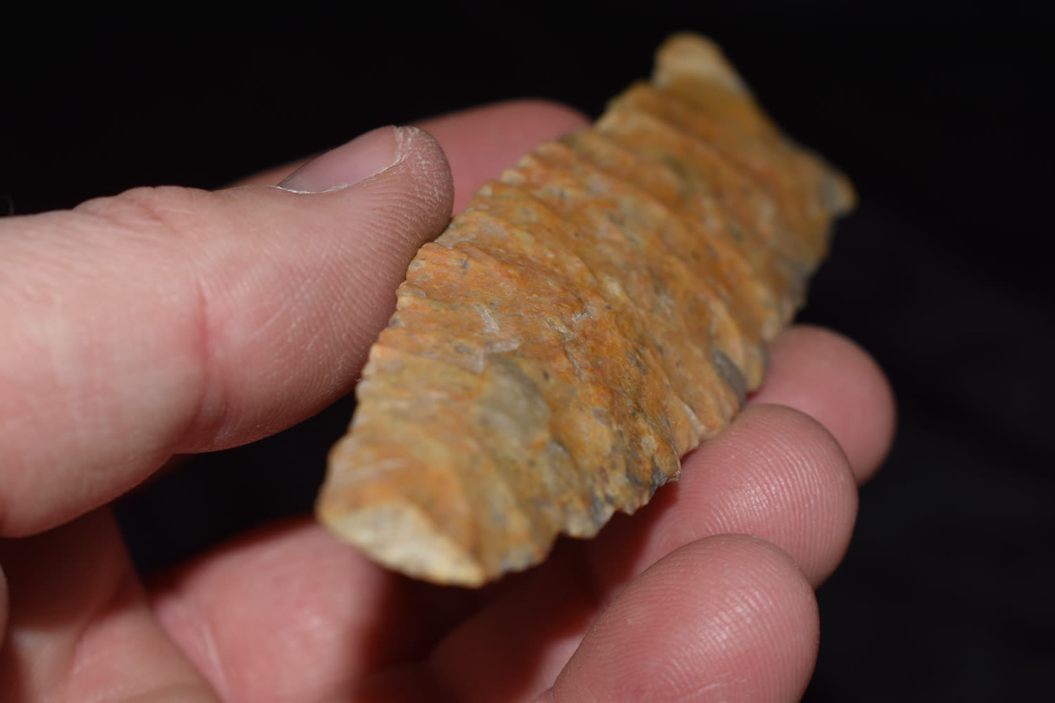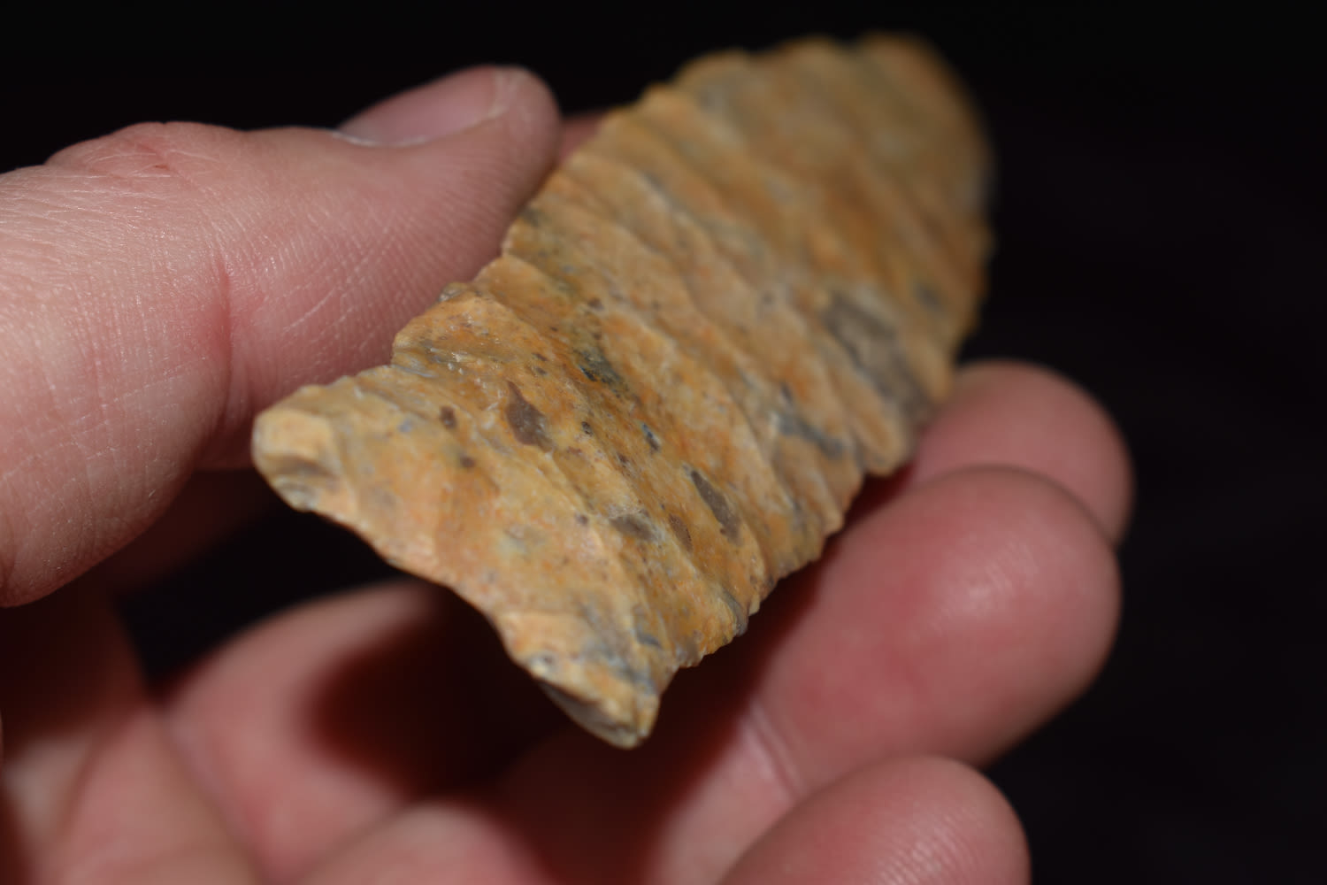 4 3/8″ Paleo Heartbreaker with beautiful flaking found by Ben Bauer in Polk Co, Missouri.