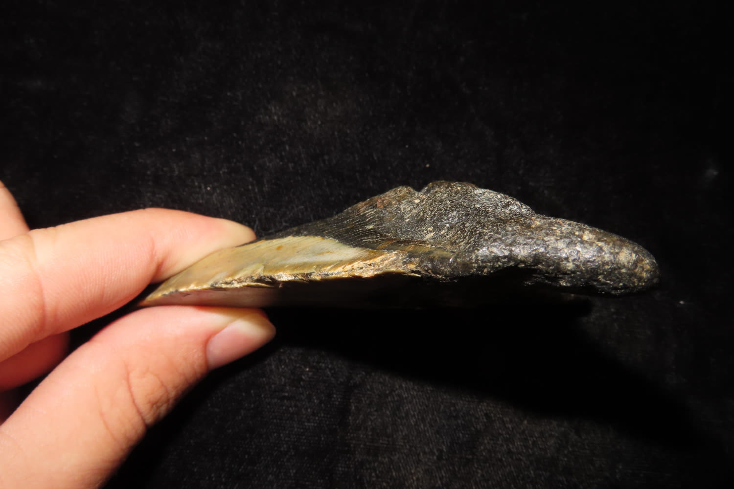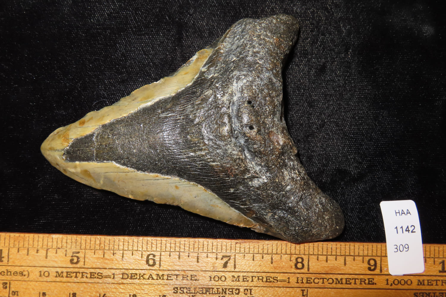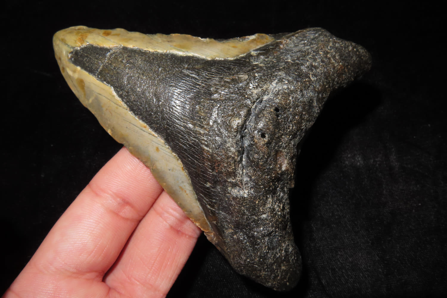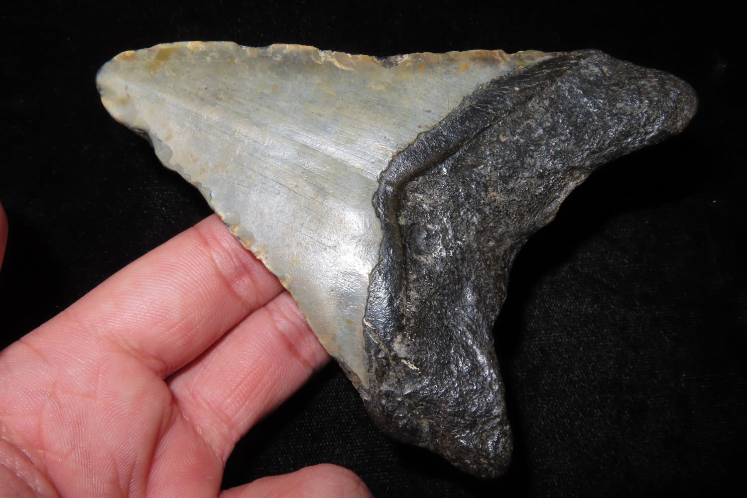 HUGE 4 1/4″ LONG MEGALODON SHARK TOOTH FOSSIL FOUND OFF THE COAST OF CAROLINAS