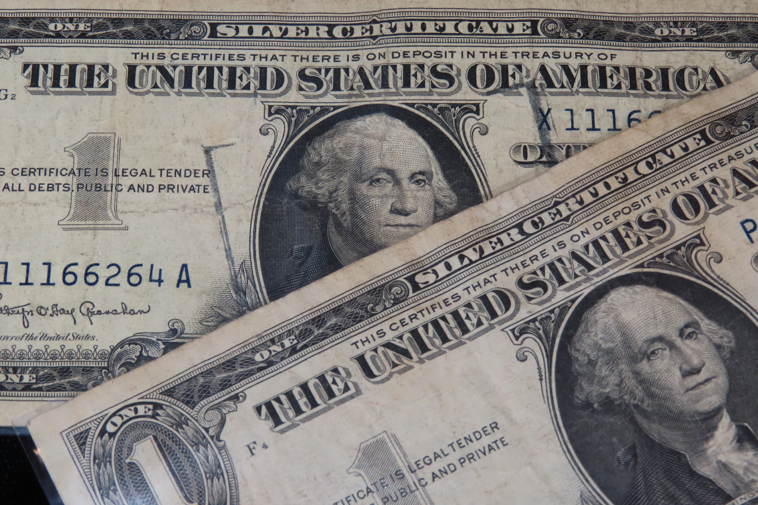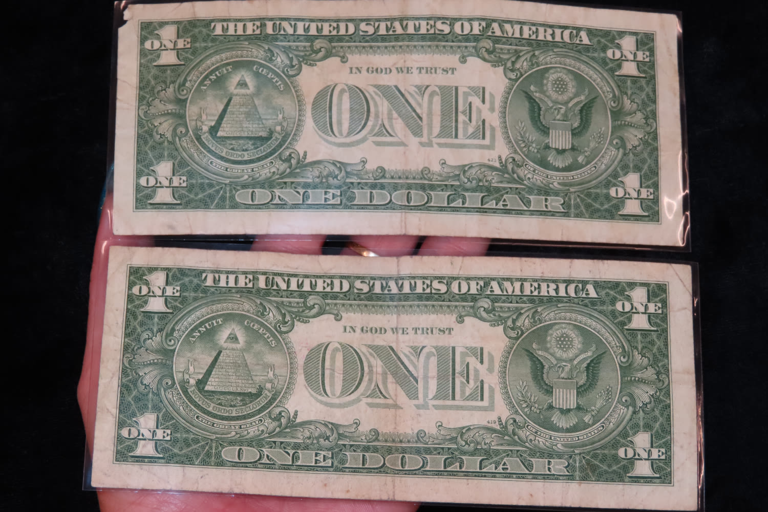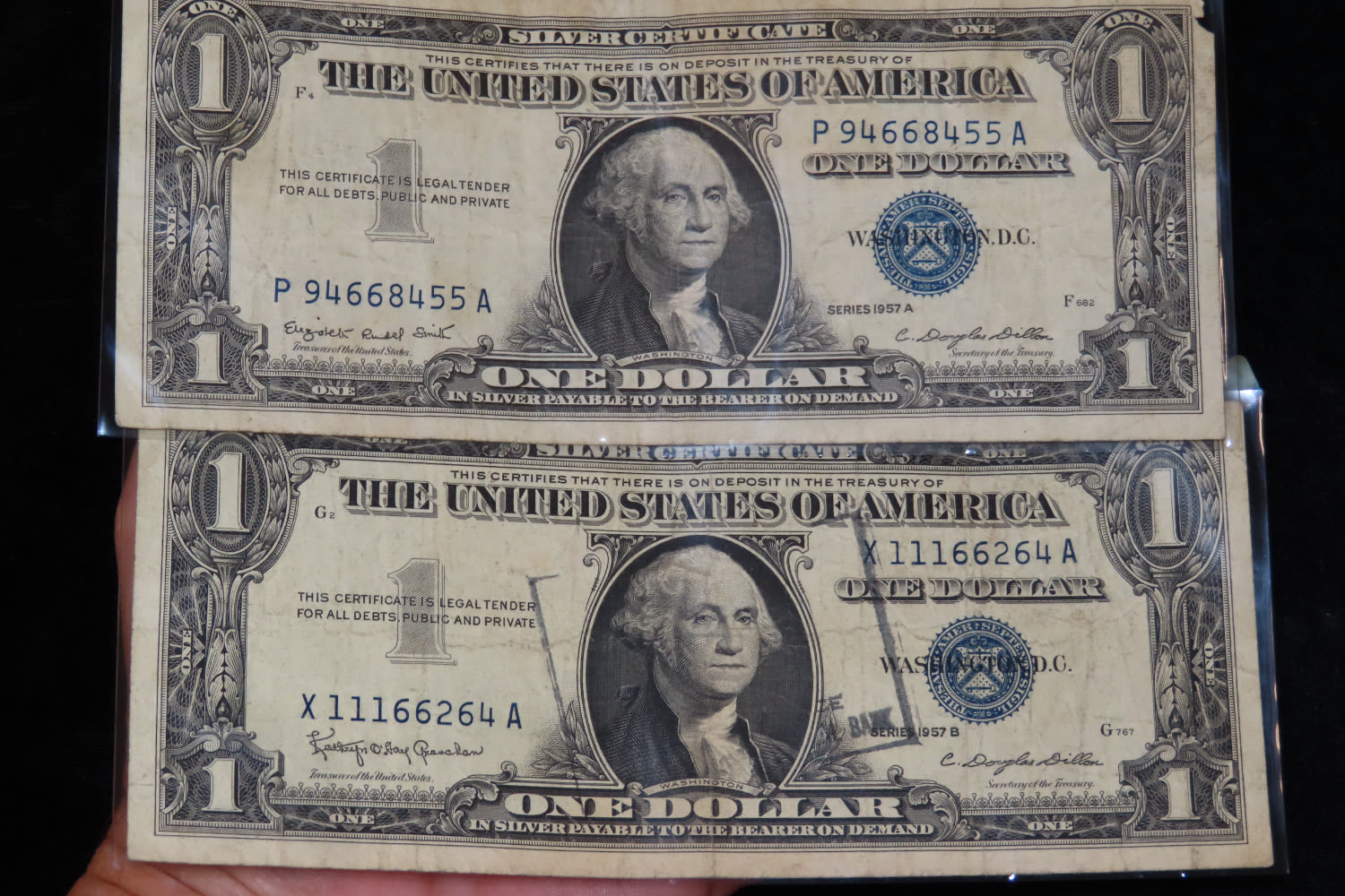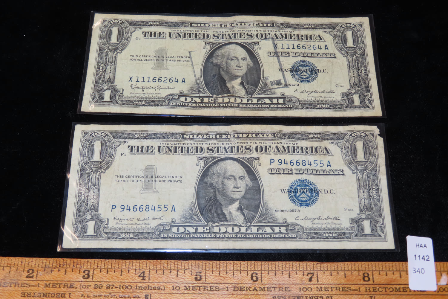 LOT OF 2 SILVER CERTIFICATE ONE DOLLAR BILLS FROM 1957, UNITED STATES US CURRENCY