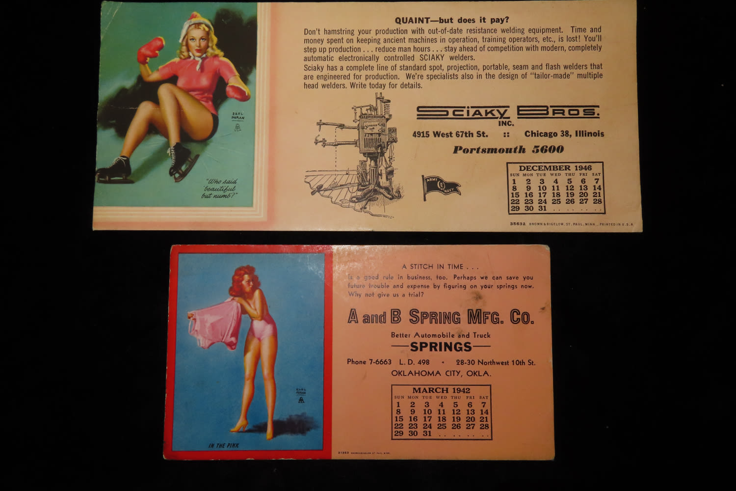 PAIR OF VINTAGE 1940'S PIN UP GIRL INK BLOTTERS CALENDARS, CHICAGO ILLINOIS & OKLAHOMA CITY, 1942 & 1946, SEMI-NUDE PINUPS
