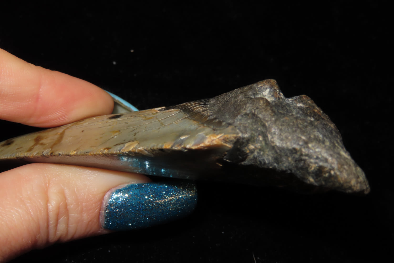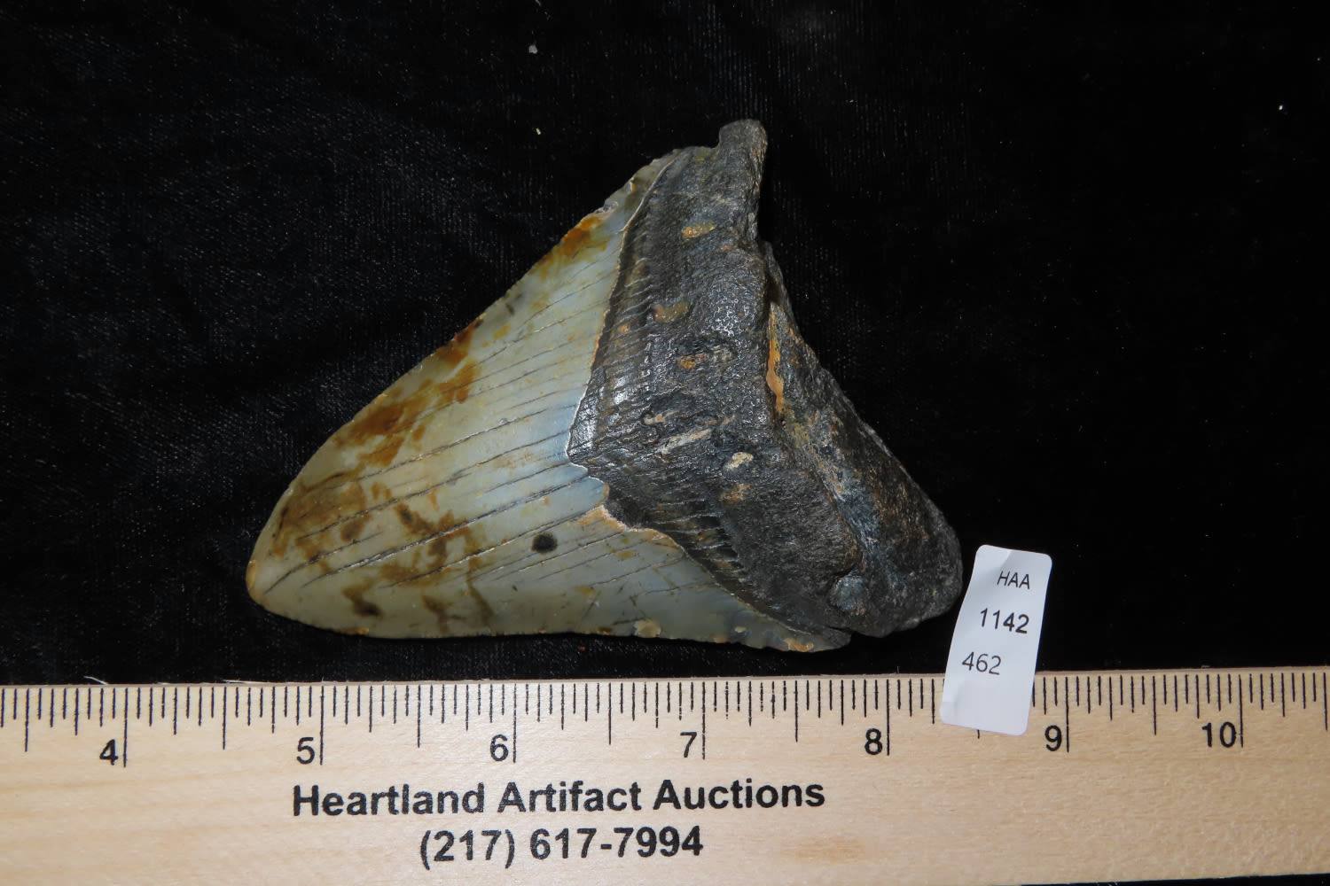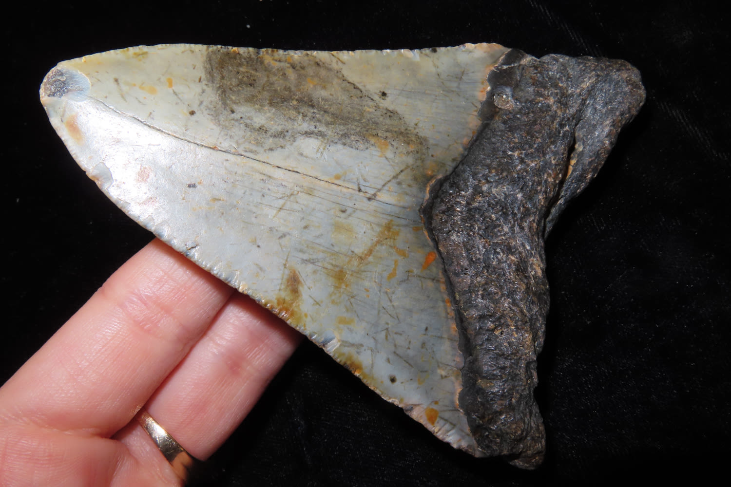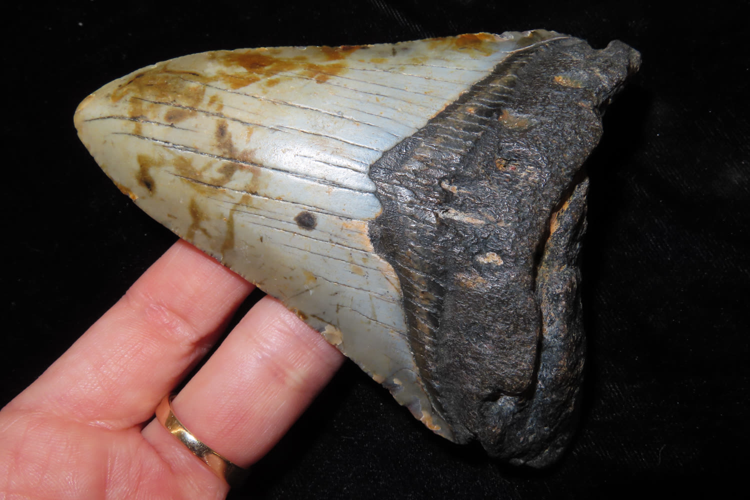 HUGE 5 1/4″ LONG MEGALODON SHARK TOOTH FOSSIL FOUND OFF THE COAST OF CAROLINAS
