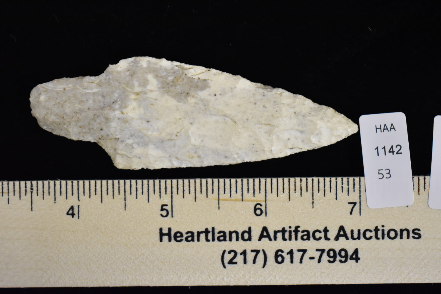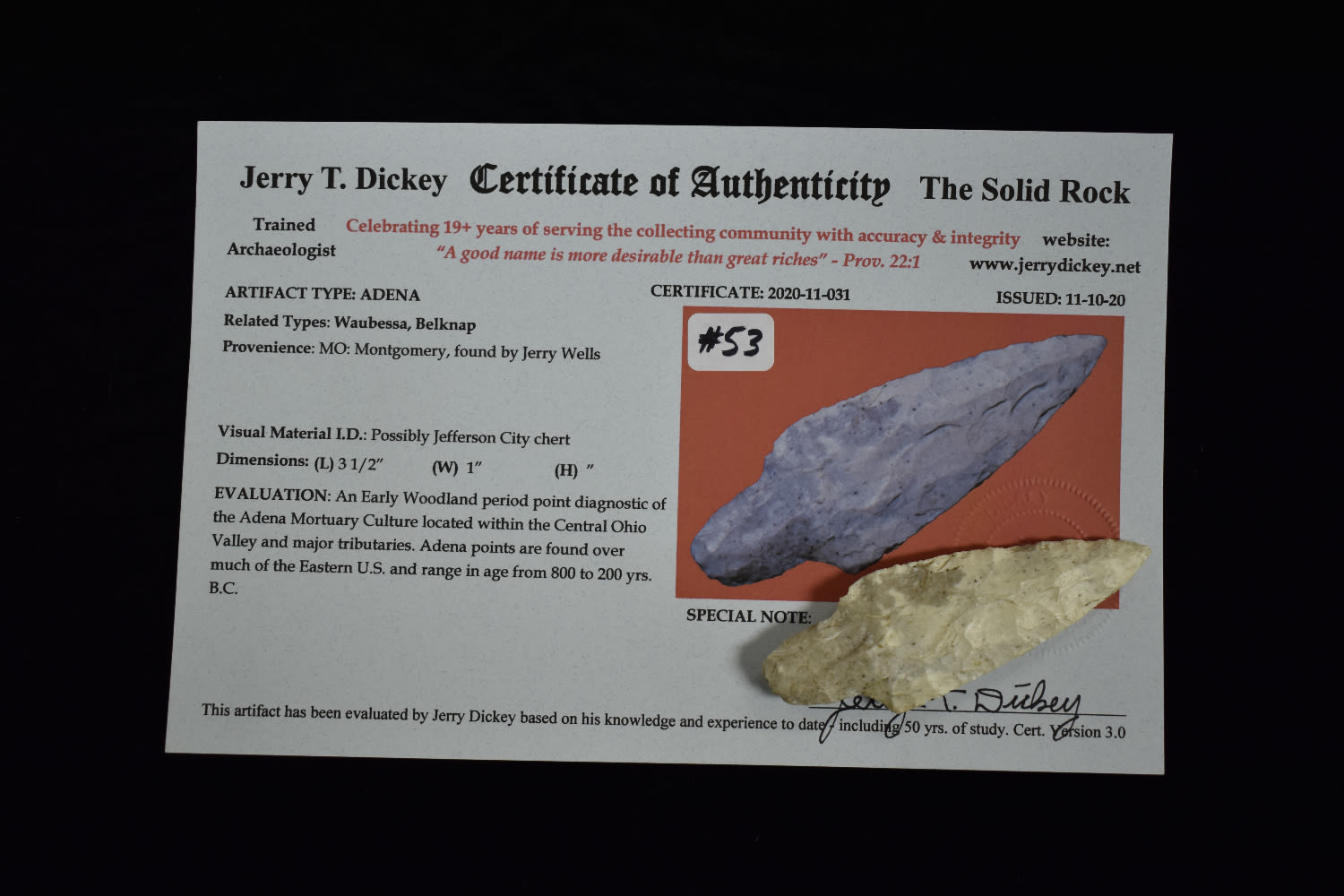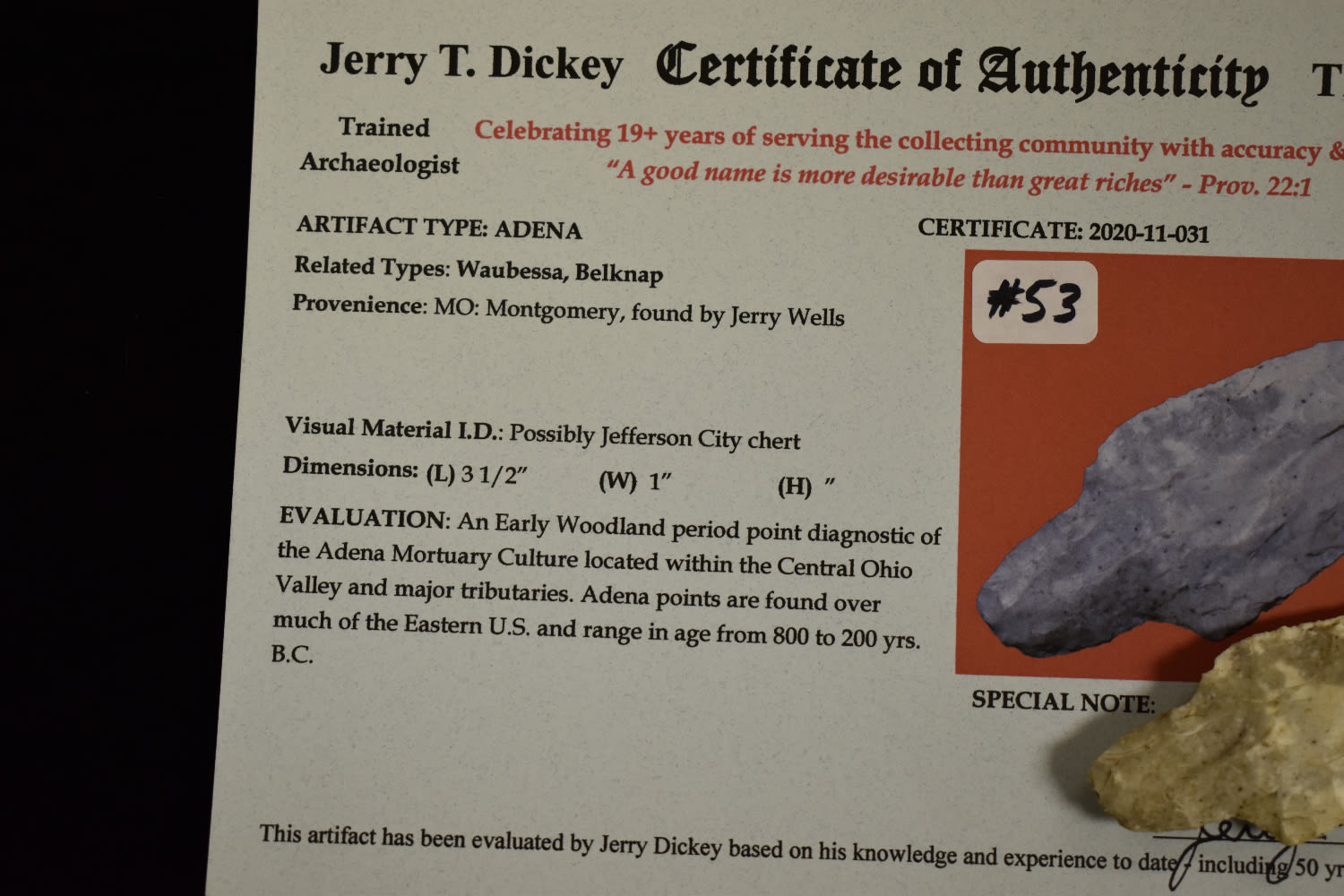 NICE 3 1/2″ ADENA, DICKEY COA, FOUND BY JERRY WELLS IN MONTGOMERY COUNTY MISSOURI, INDIAN ARROWHEAD, ARTIFACT