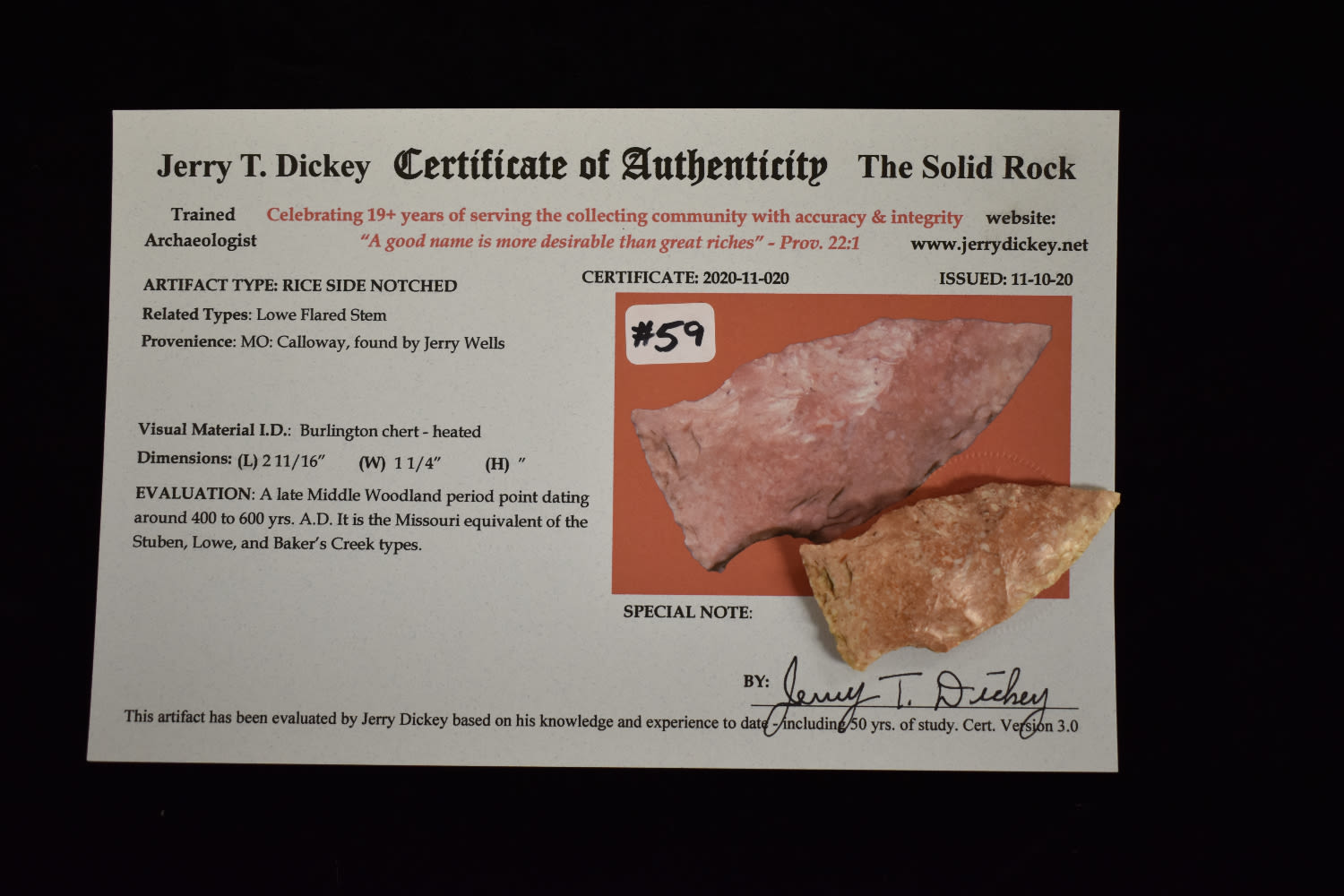 RICE SHALLOW SIDE NOTCHED, DICKEY COA, FOUND BY JERRY WELLS IN CALLOWAY COUNTY MISSOURI, INDIAN ARROWHEAD