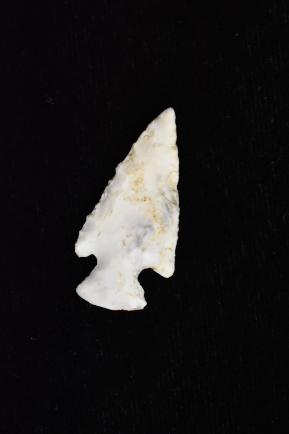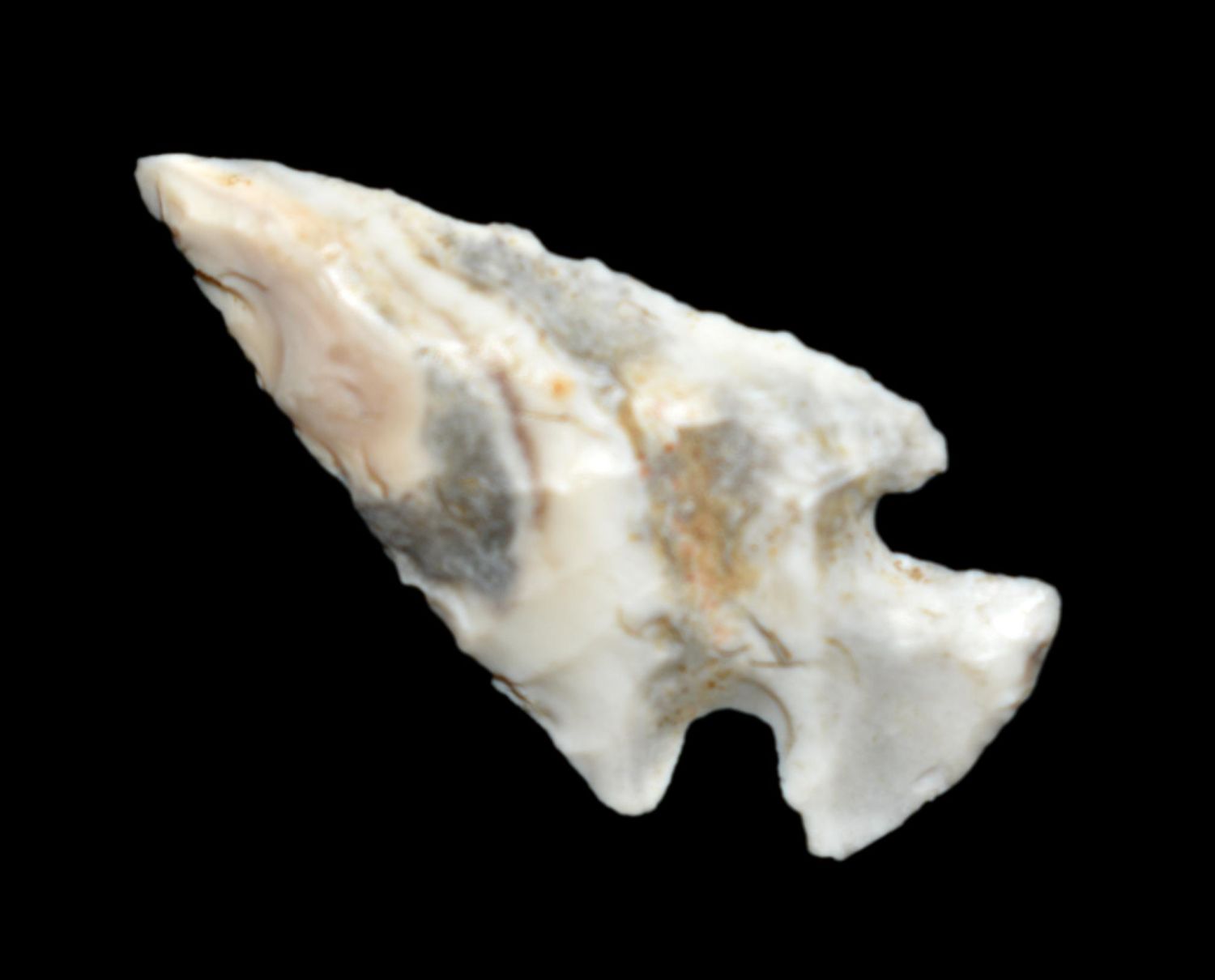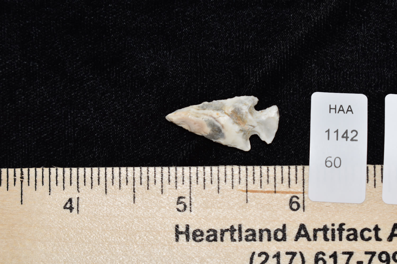 COLORFUL SCALLORN BIRD POINT FOUND IN COOPER COUNTY MISSOURI, 1 1/16″ LONG, INDIAN ARROWHEAD, ARTIFACT