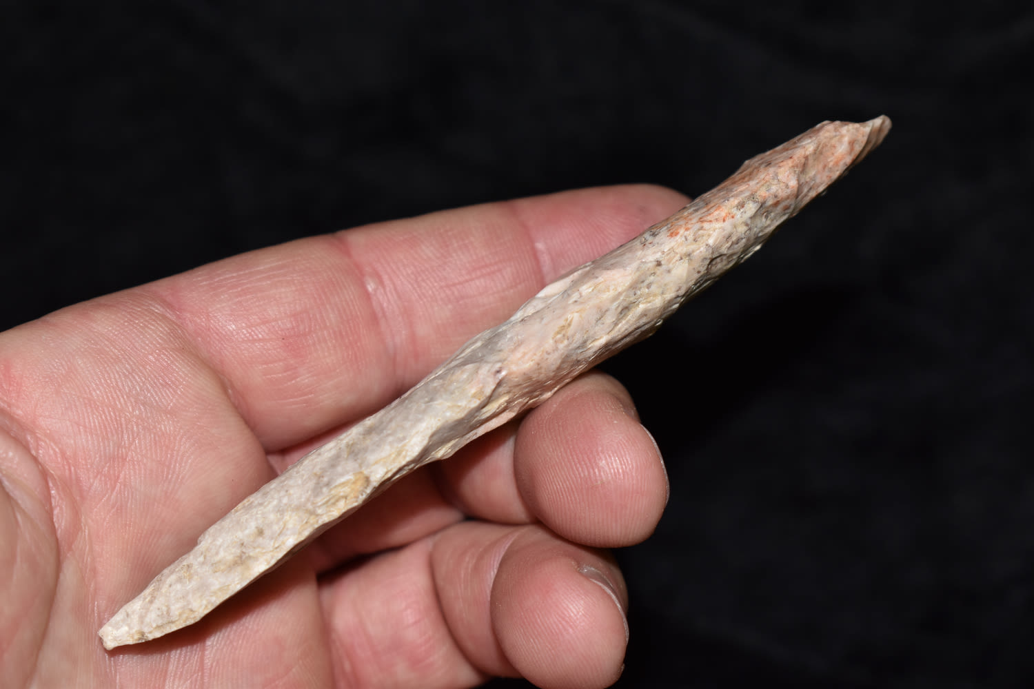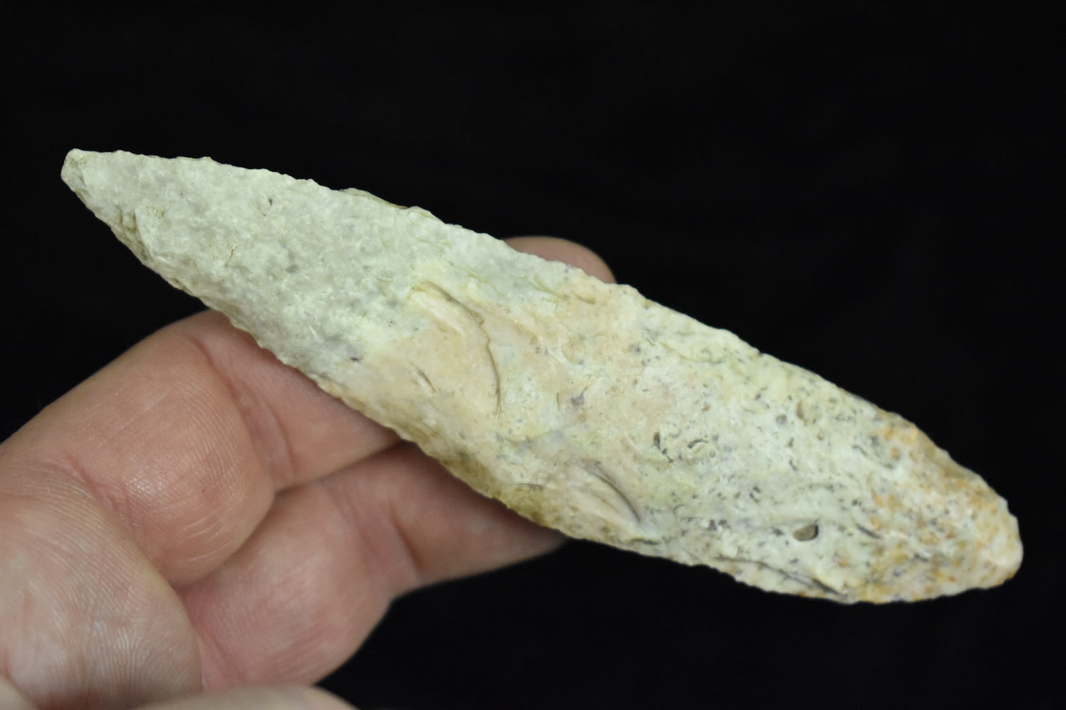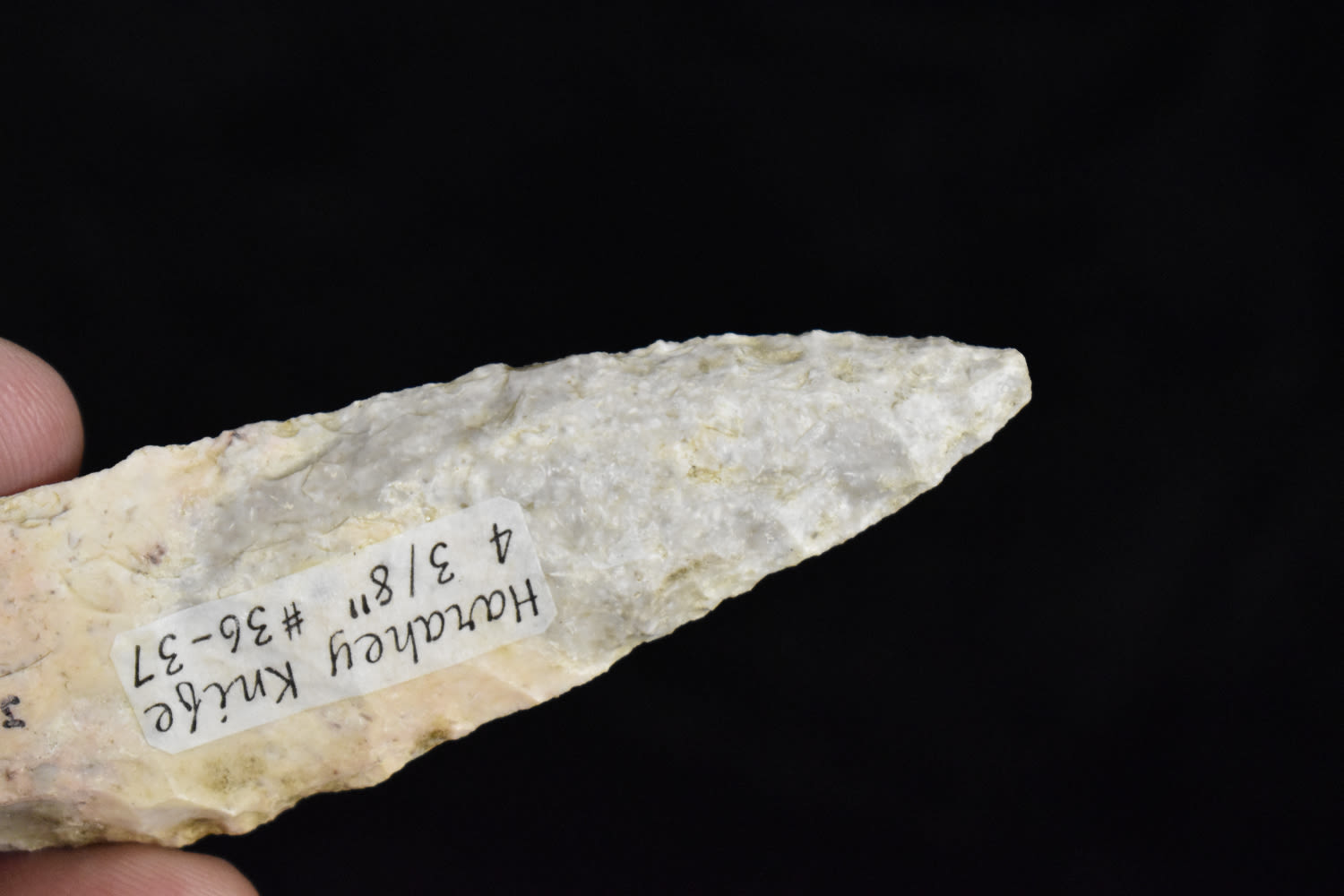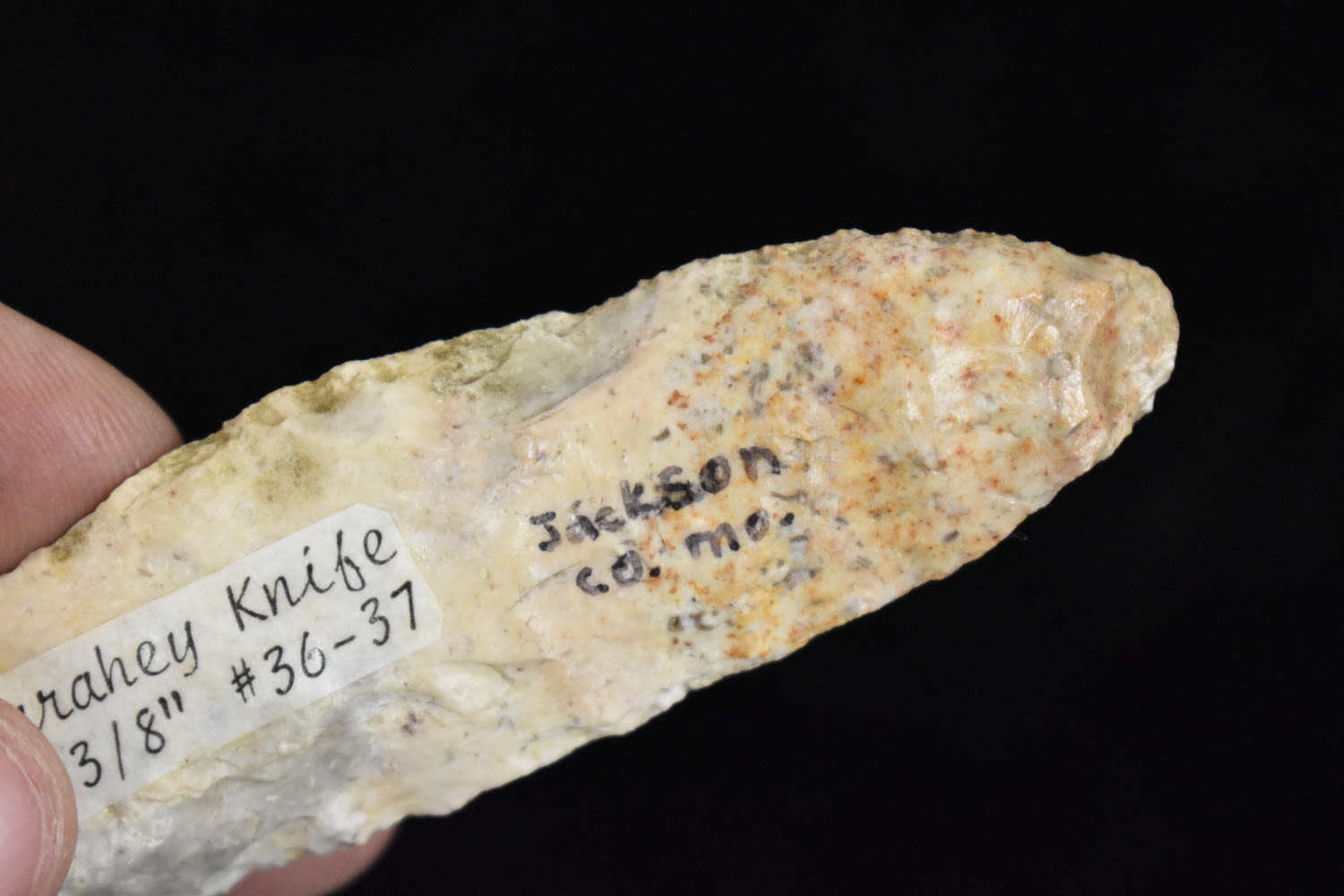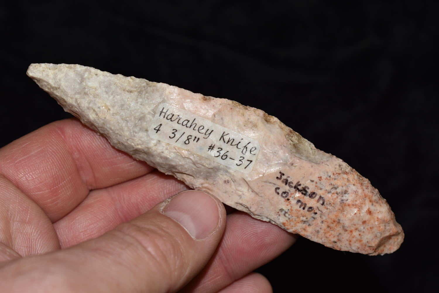 4 3/8″ HARAHEY 4-BEVEL KNIFE, MOTLEY COA, FOUND IN JACKSON COUNTY MISSOURI BY TRACY ALLEN, GREAT COLOR