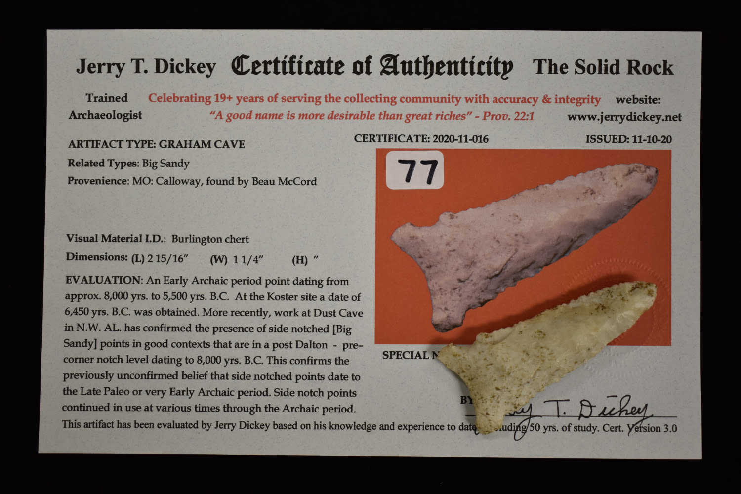 2 15/16″ GRAHAM CAVE, DICKEY COA, FOUND BY BEAU MCCORD IN CALLOWAY COUNTY MISSOURI, NATIVE AMERICAN ARTIFACT