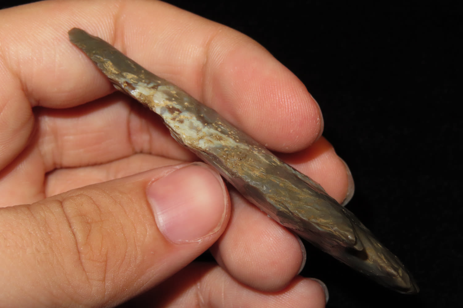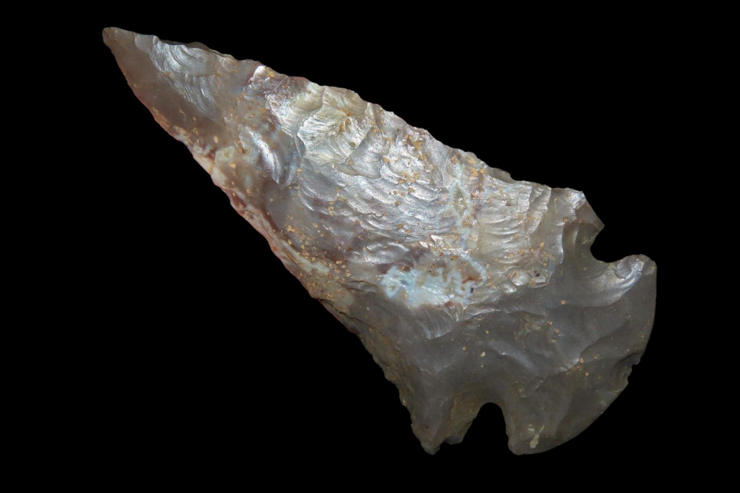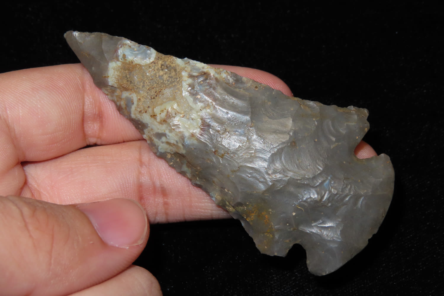 3 1/4″ Dovetail From Southern Illinois. Made of Hornstone and has a nice bullseye and Quartzite inclusions Ex John Samuel
