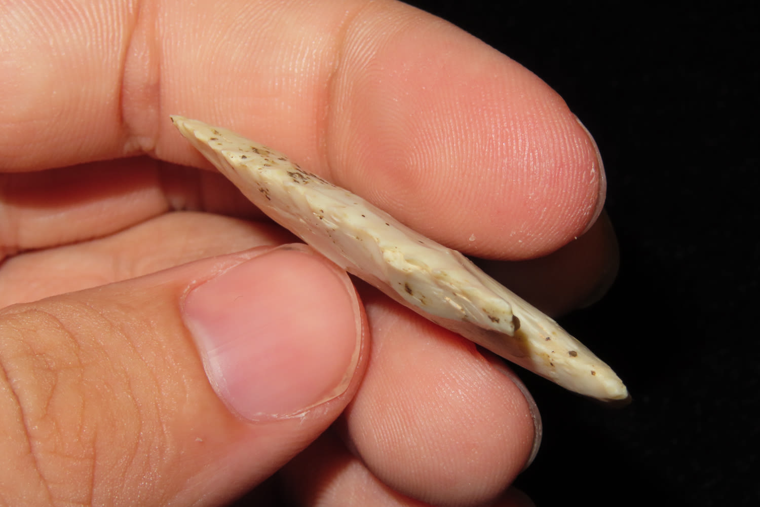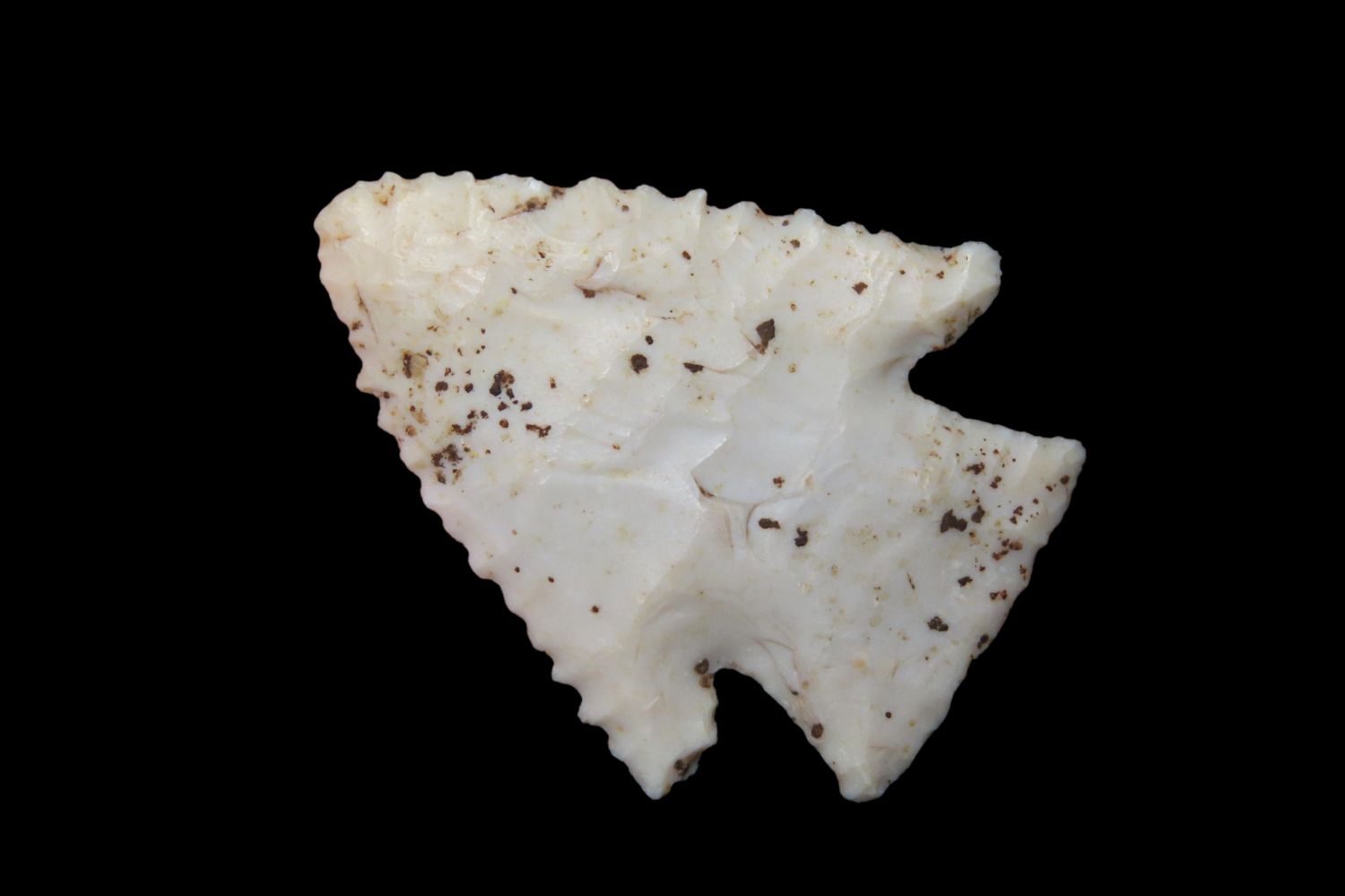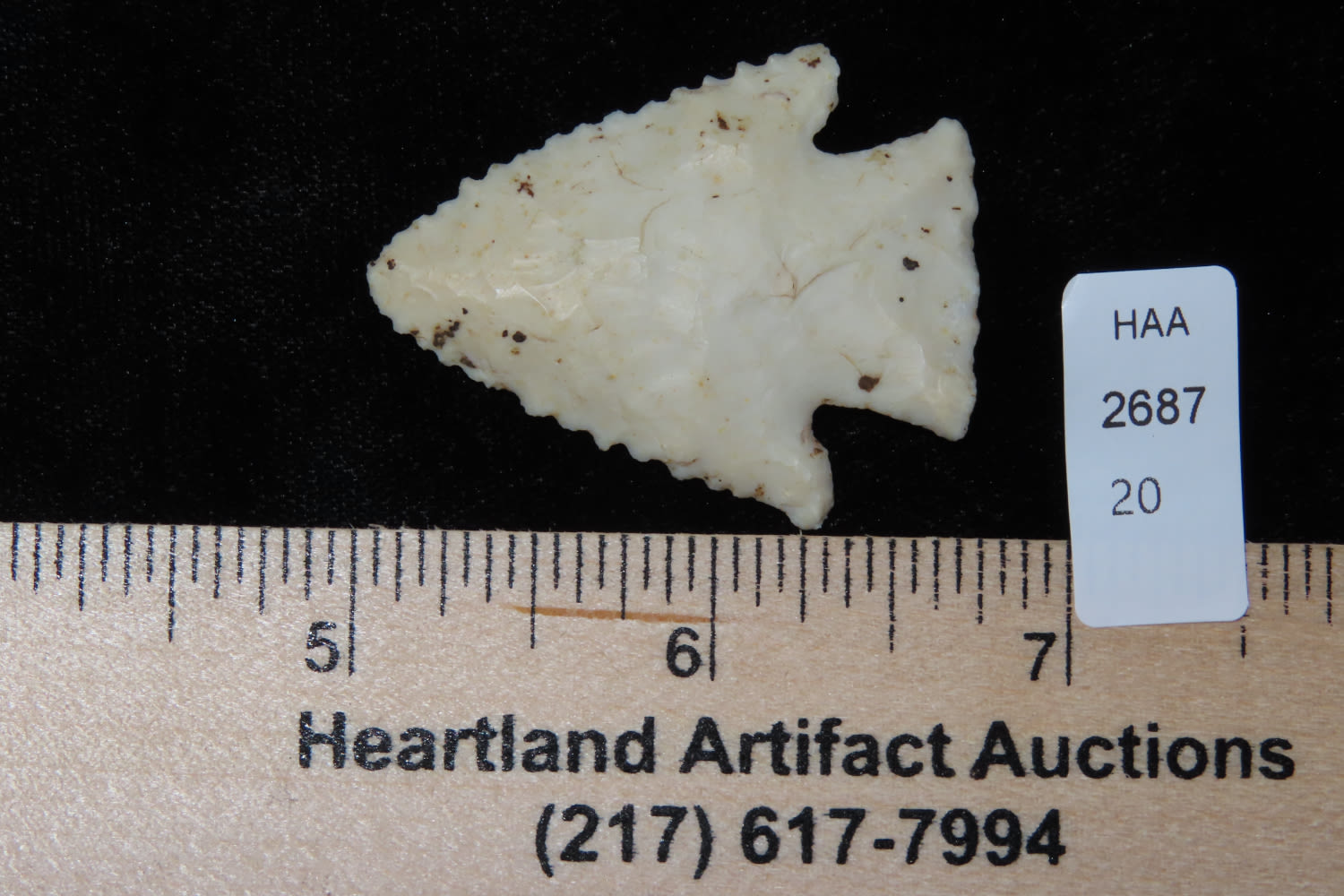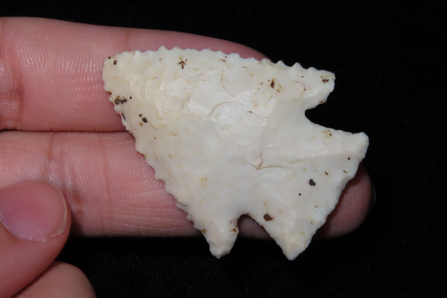 1 3/4″ Barbed Hardin with Phonemenal Workmanship. Highly Transluscent and Serrated Burlington Chert. Found in Cass Co Illinois