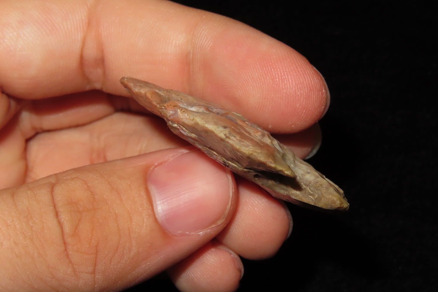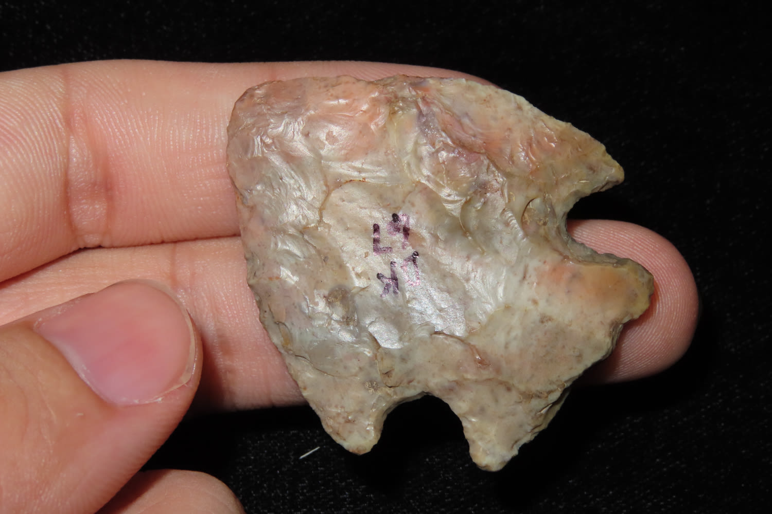 1 3/4″ Snyder Hopewell Found in Vermillion Co Indiana by Phil Sams. Made of a Pinkish Head Treated Burlington Chert. Ex Dave Vanderwall