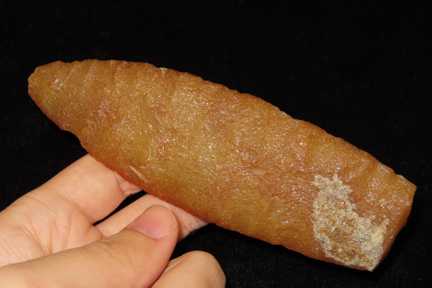 Huge 5 1/4″ Paleo Agate Basin Blade Made of Red Hixton Quartz From Wisconsin. Piece has a Fractured Base and tip. Ex Leach Brothers.