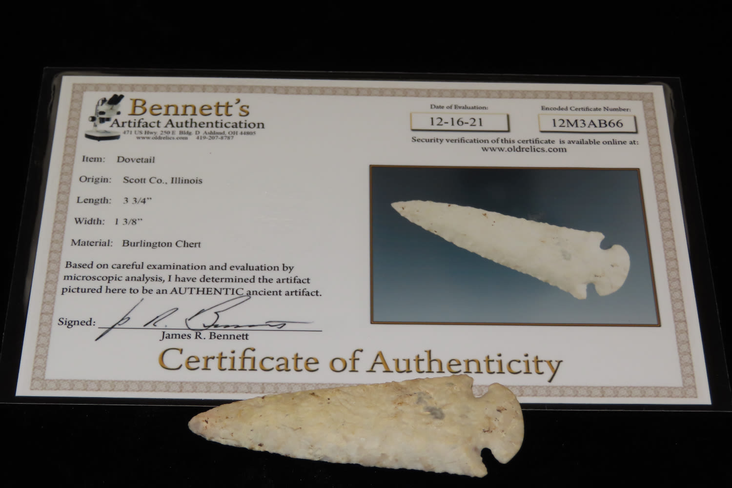 3 3/4″ Dovetail Made of a High Grade of Burilington Chert Jim Bennett COA Ex Jason Brooks