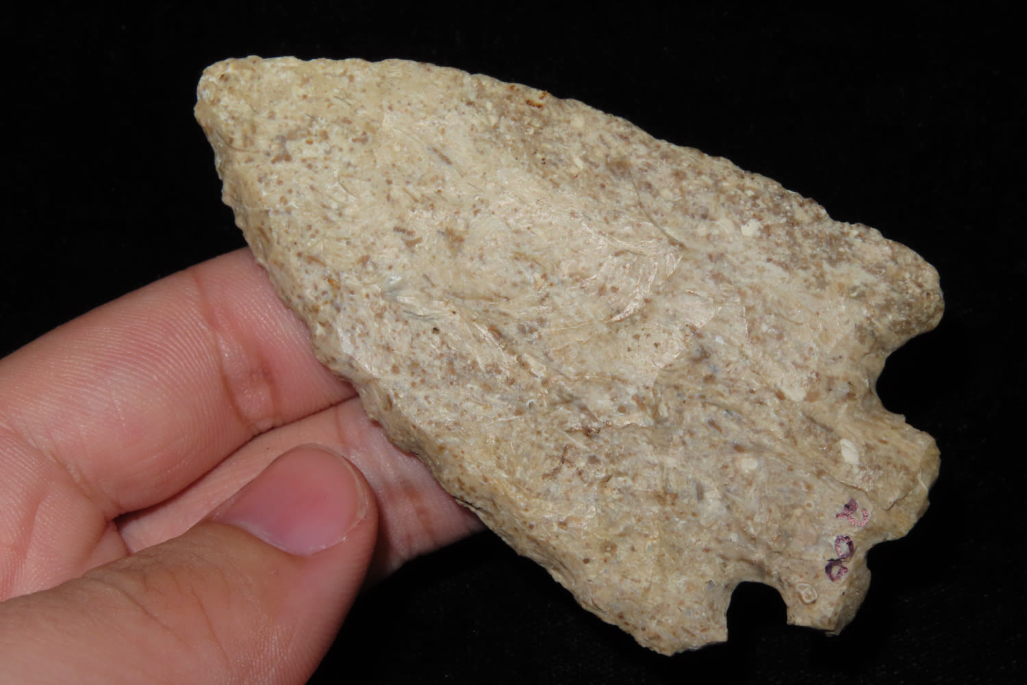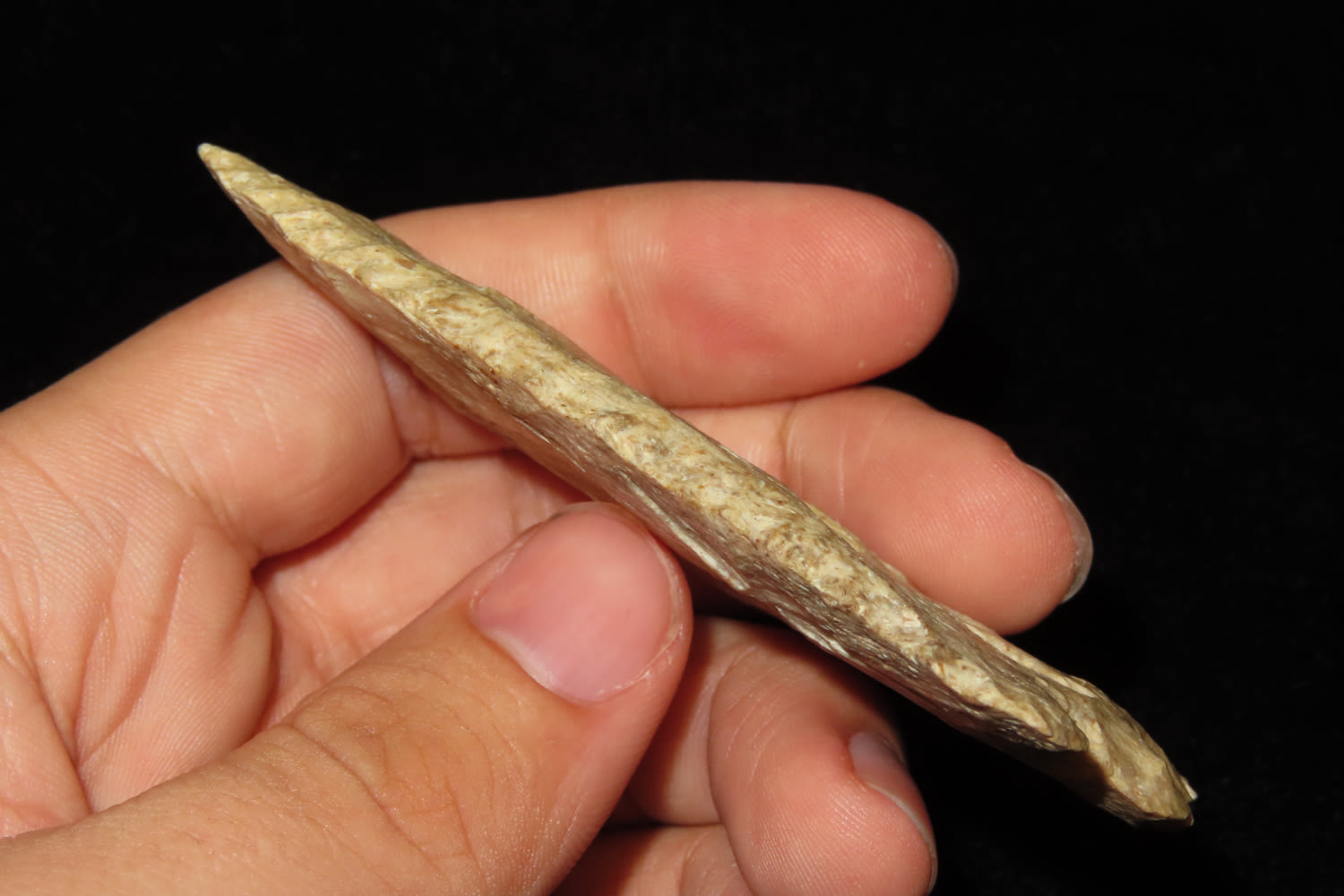 3 1/2″ Bifurcated Kirk Point Made of Harrodsburg Chert Found In Linton Indiana by Don Collision in the 1960’s Greene Co Indiana