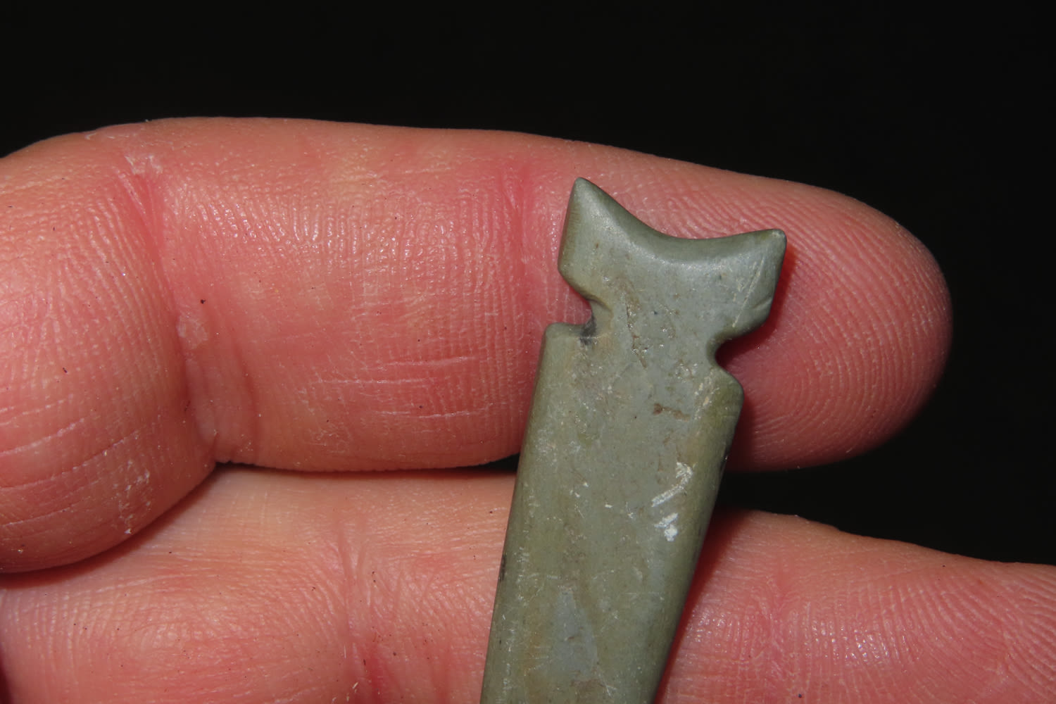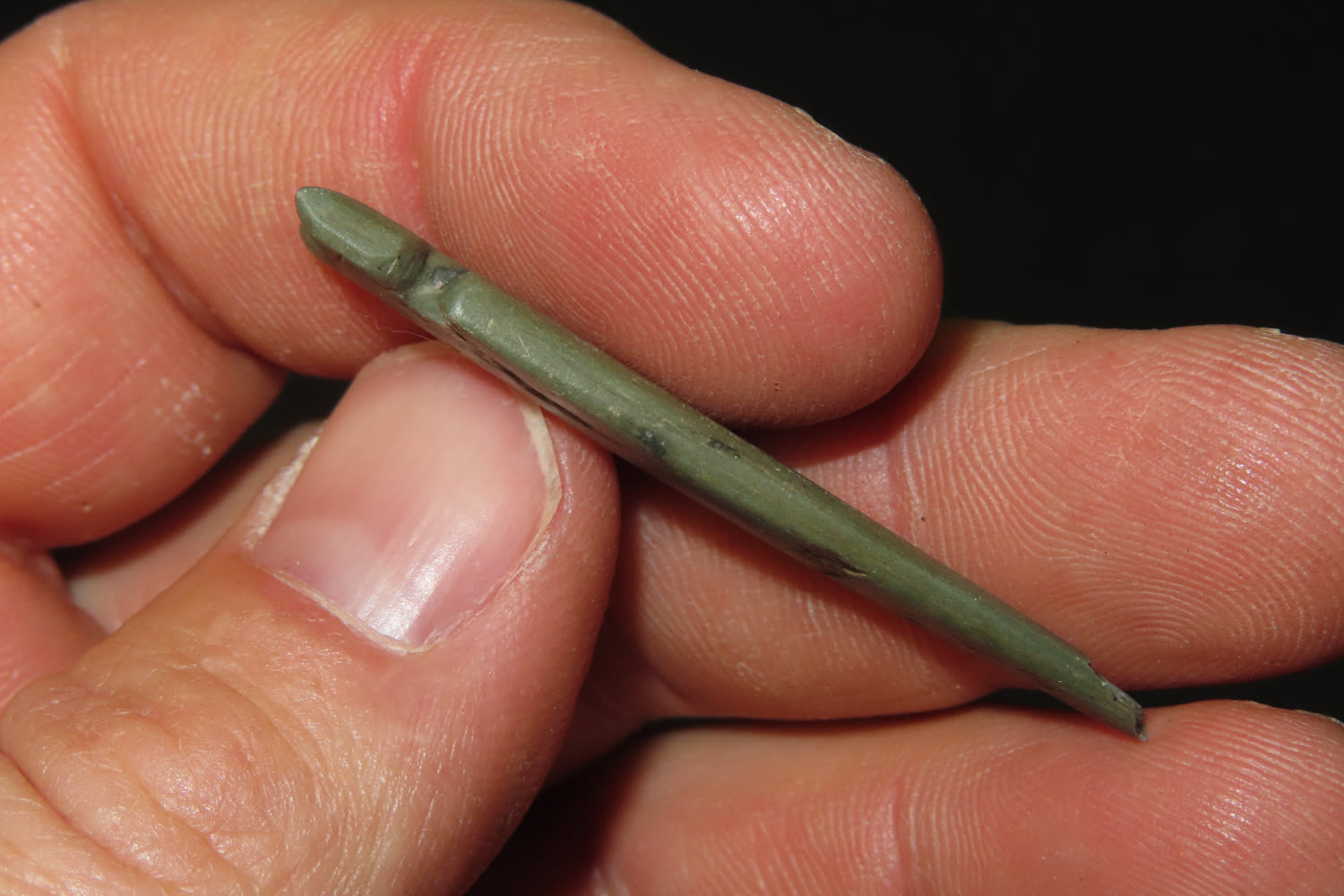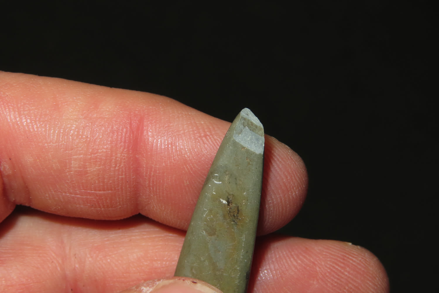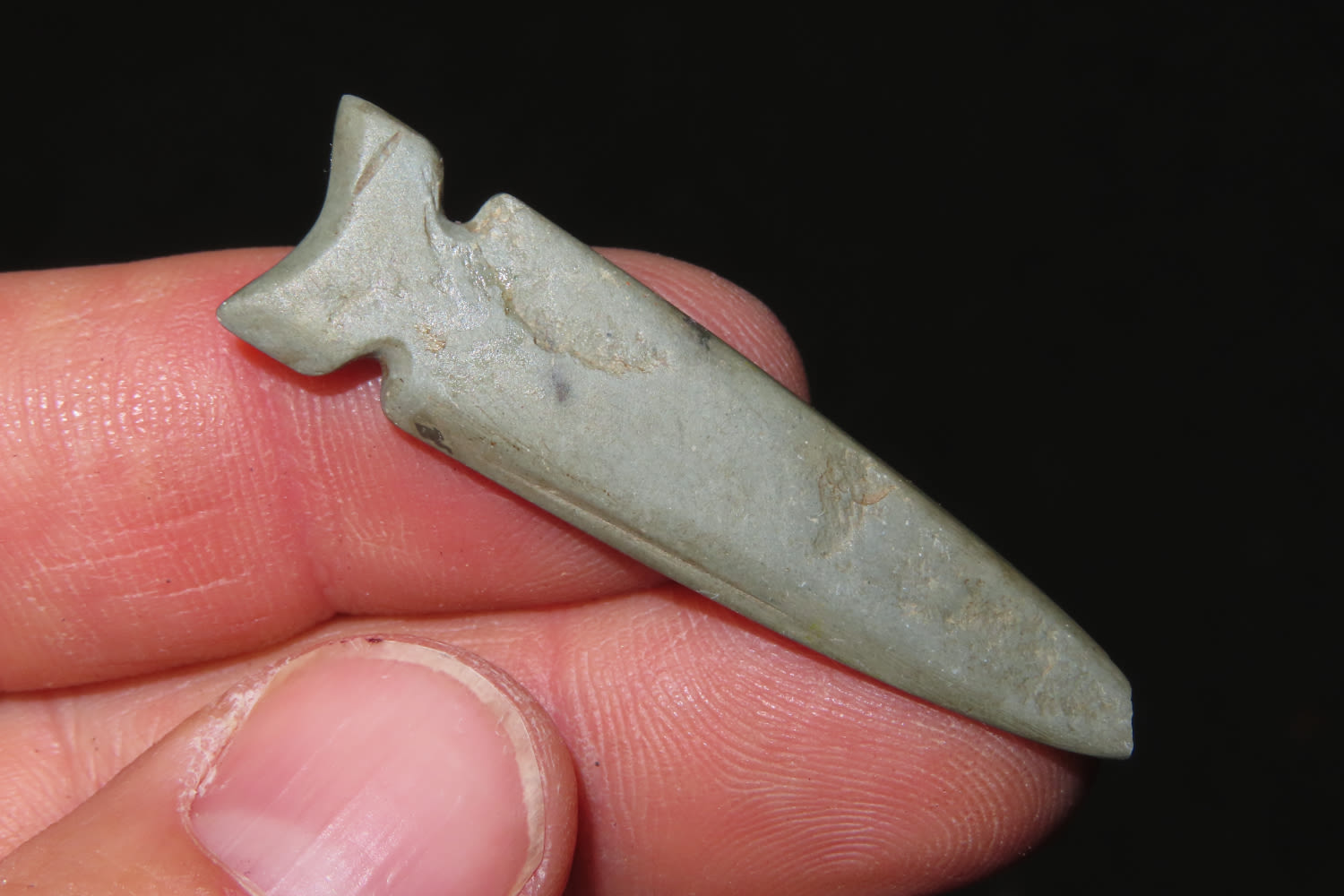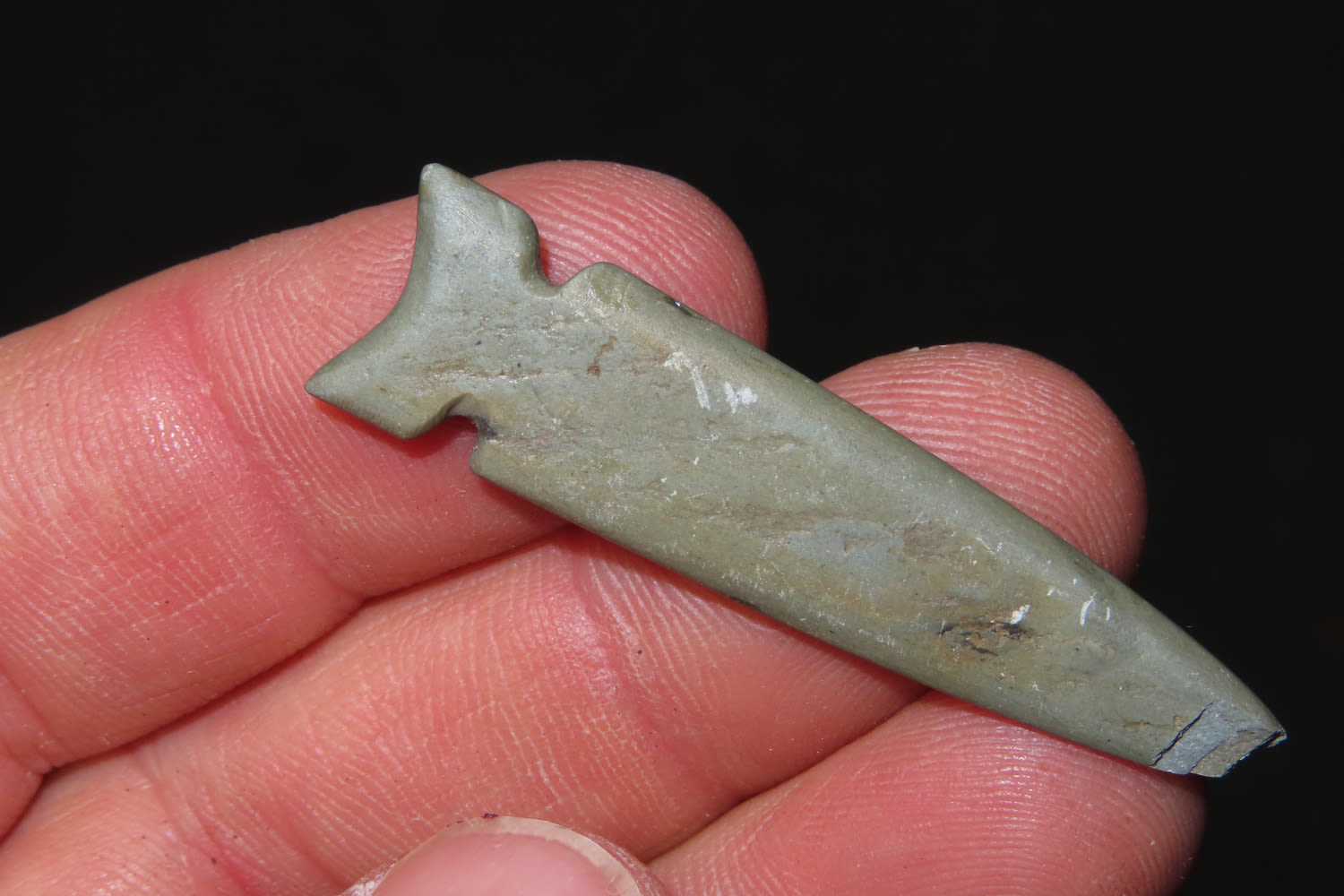1 7/8" Slate Arrowhead, exhibits unique style and manufacture-great patina change where the tip was broken off, likely Mississippian or Historic, from the collection of Robert Naderhoff of Quincy Illinois