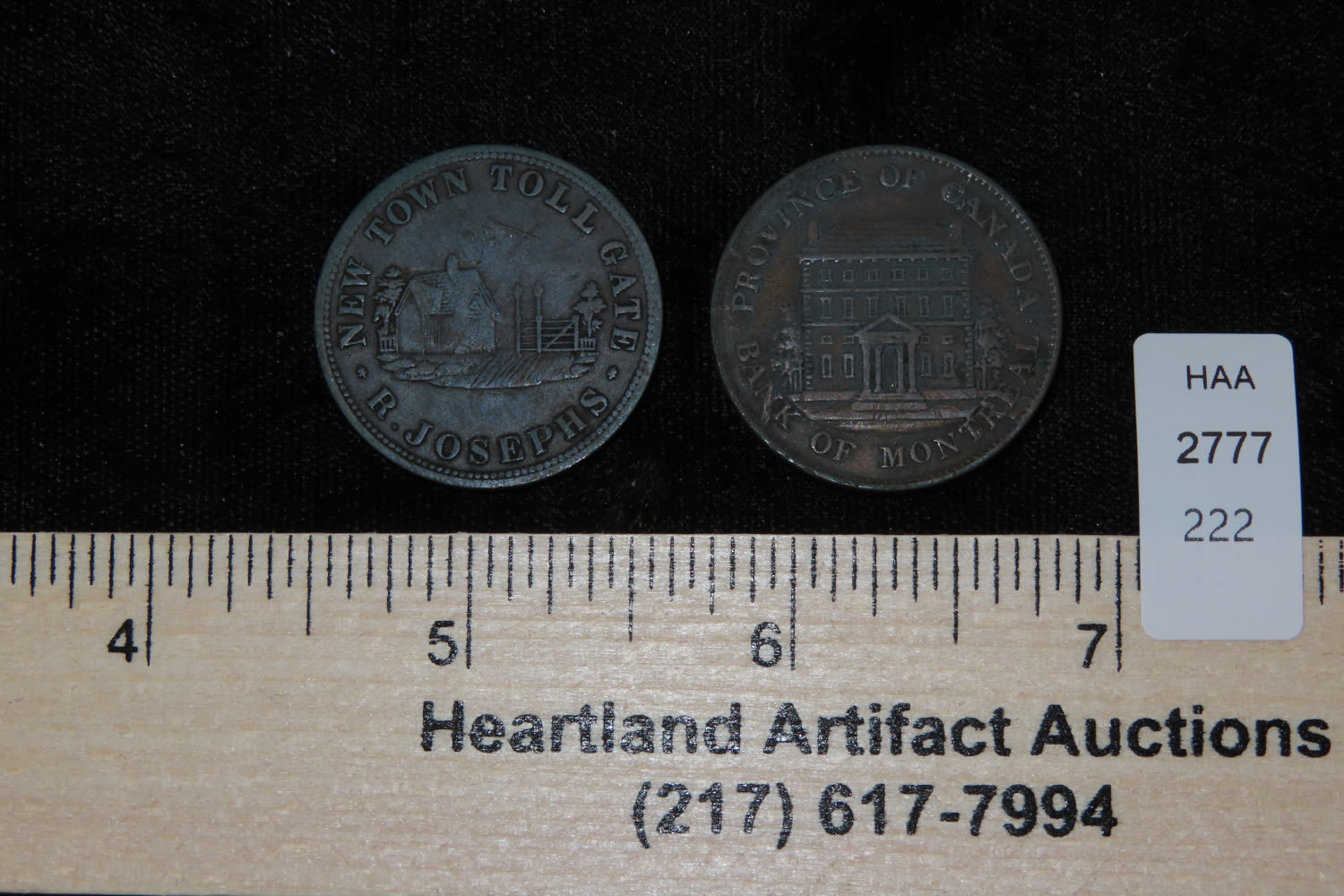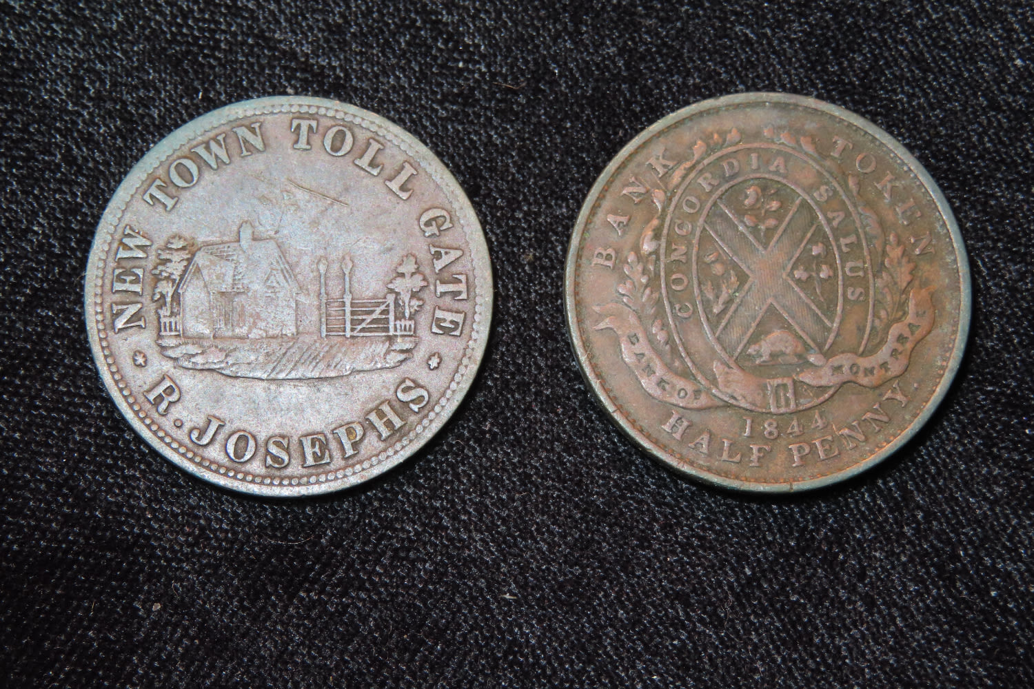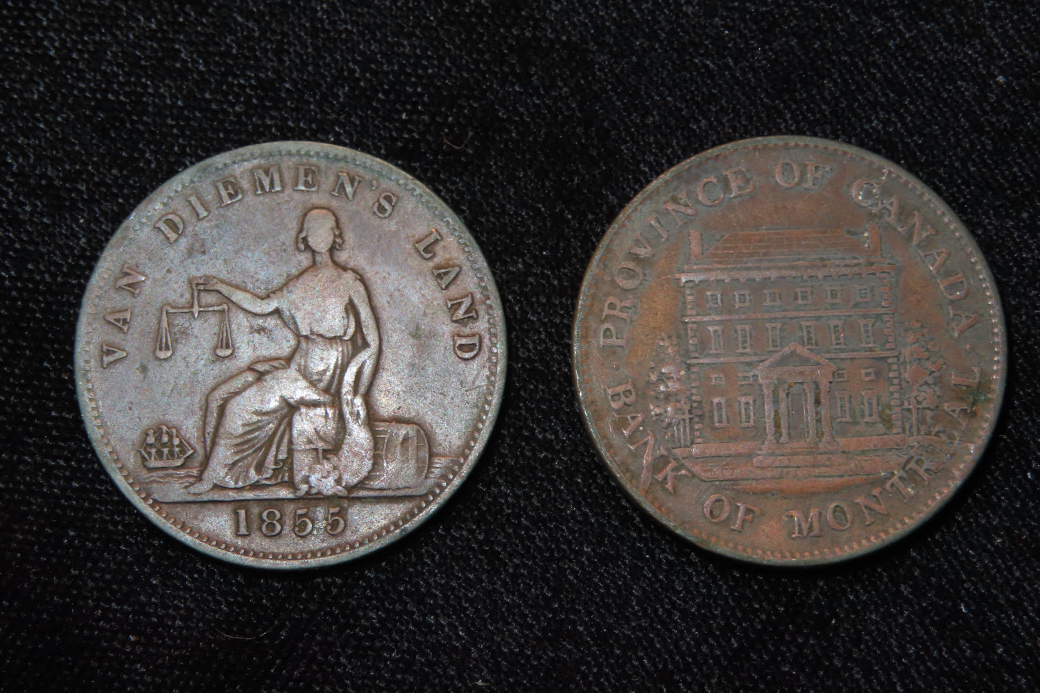 Province of Canada bank of montreal half penny bank token1844+new town toll gate R. Josephs VanDiemen’s Land 1855
