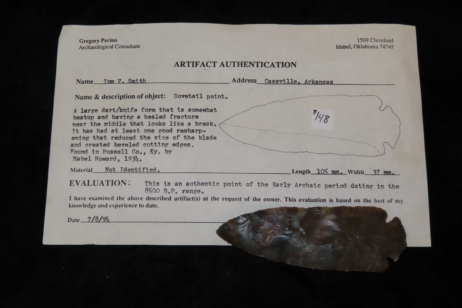 AMAZING 4 1/8" SONORA DOVETAIL, PERINO COA, FOUND IN RUSSEL COUNTY KENTUCKY BY MABEL HOWARD IN 1934, GREAT COLOR