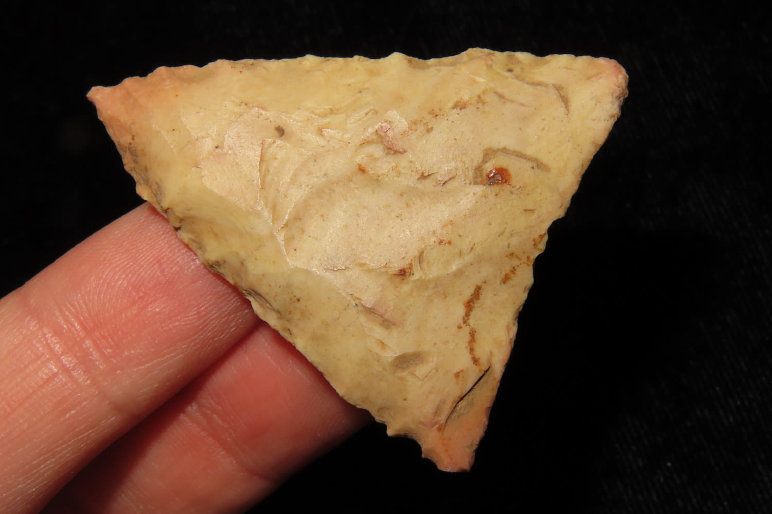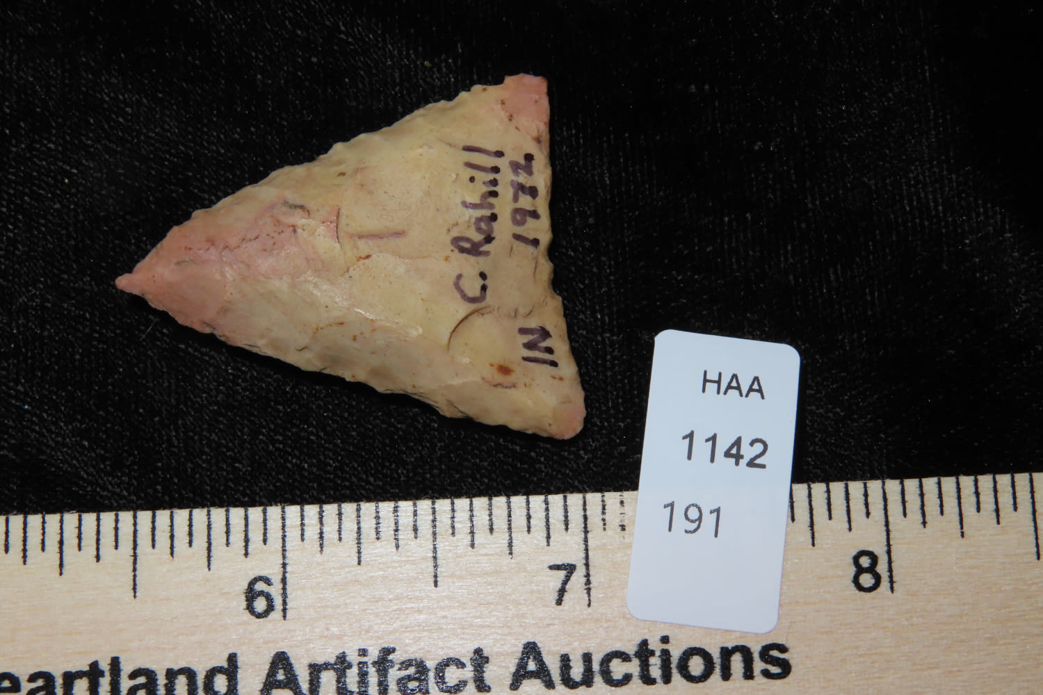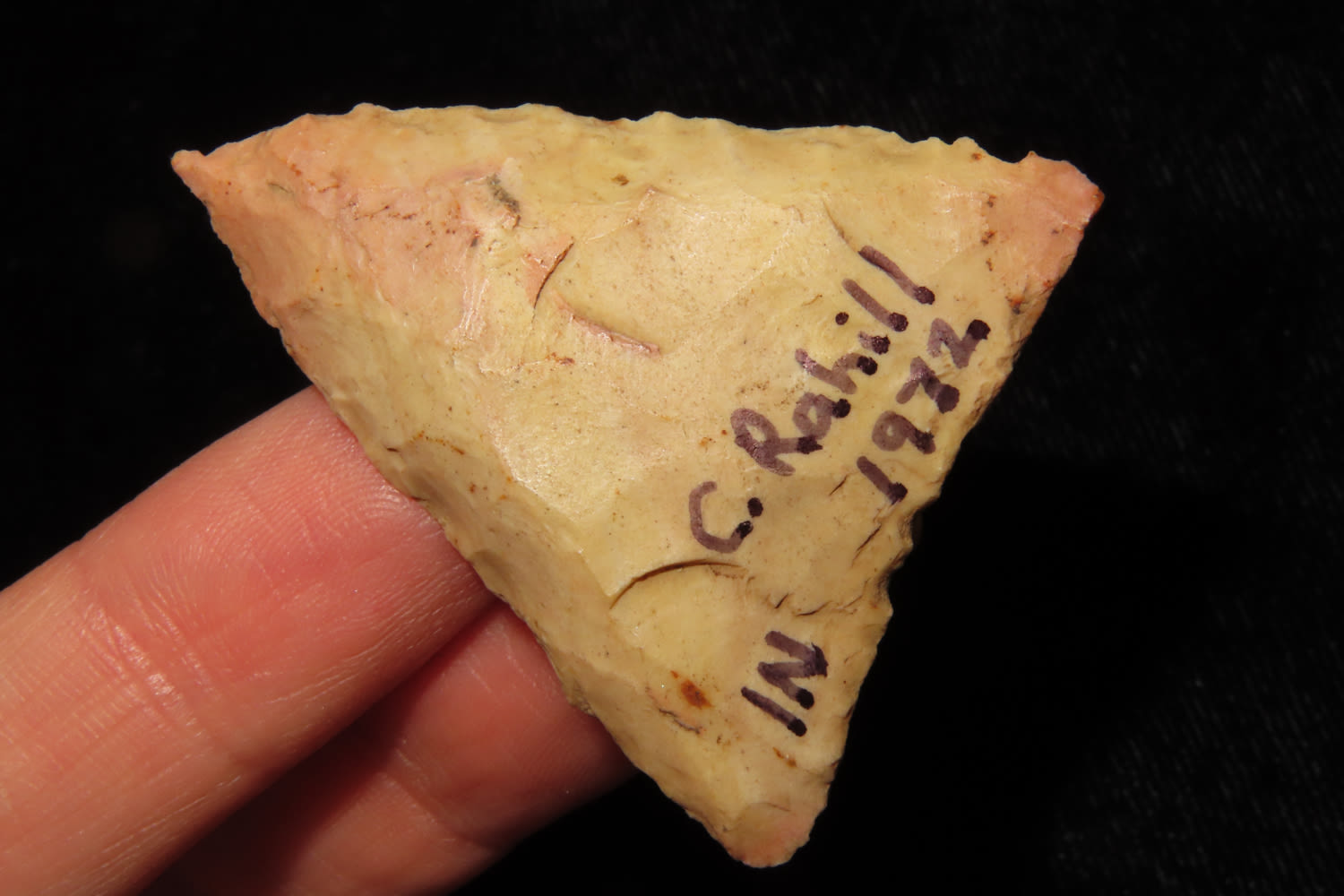 NICE 1 5/8″ EARLY TRIANGLE FOUND BY C. RAHILL IN INDIANA IN 1972, INDIAN ARROWHEAD, ARTIFACT