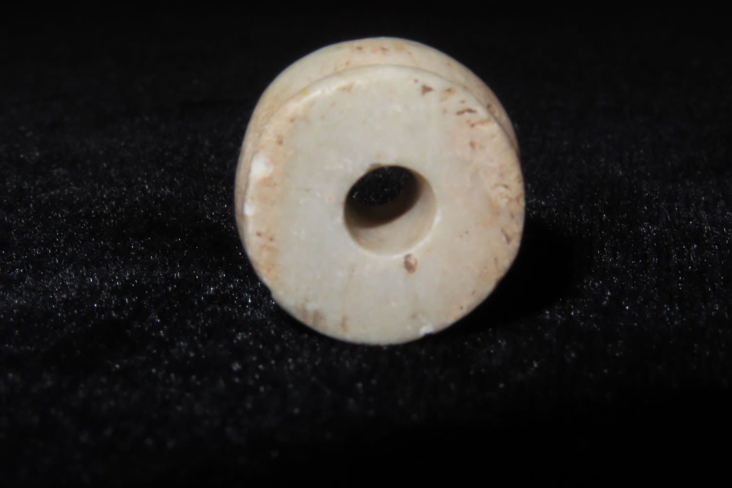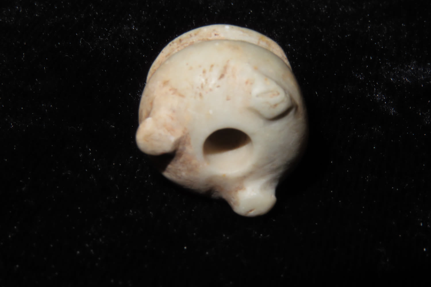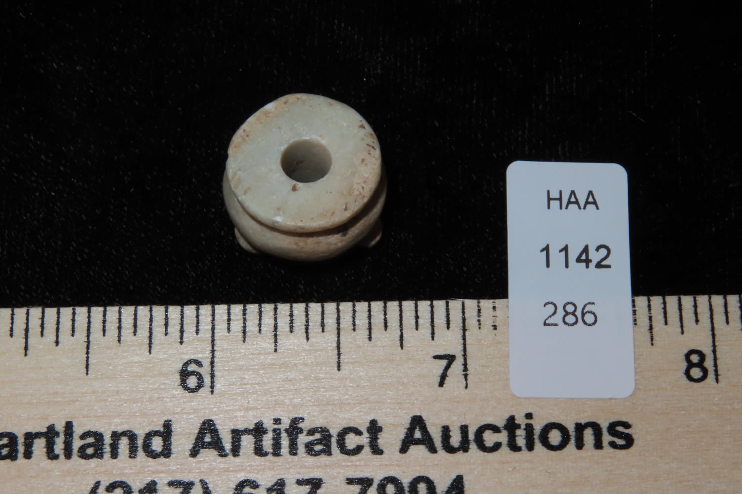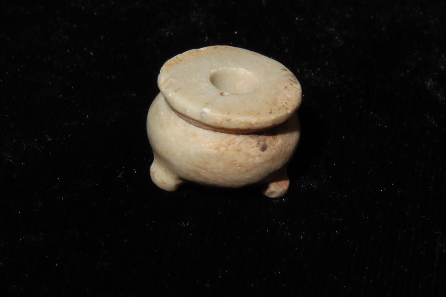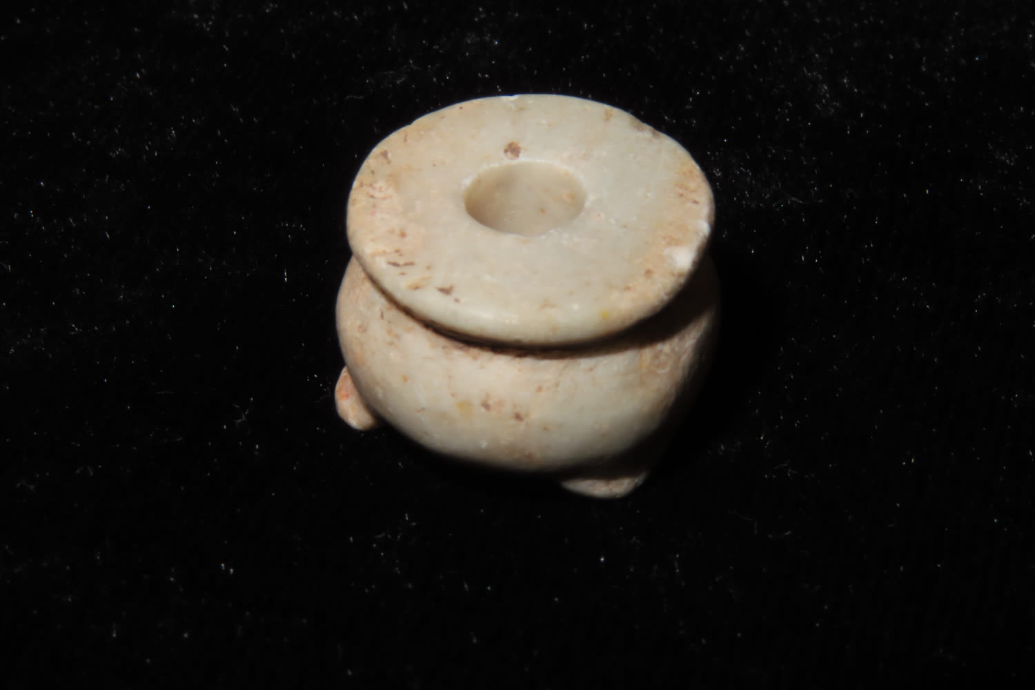 INTERESTING STONE EFFIGY BEAD REPRESENTING A TRIPOD POTTERY BOTTLE, FOUND IN MEXICO