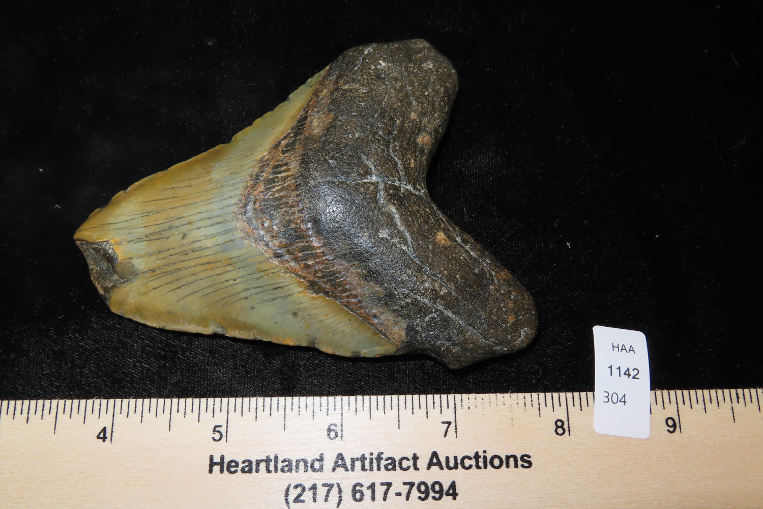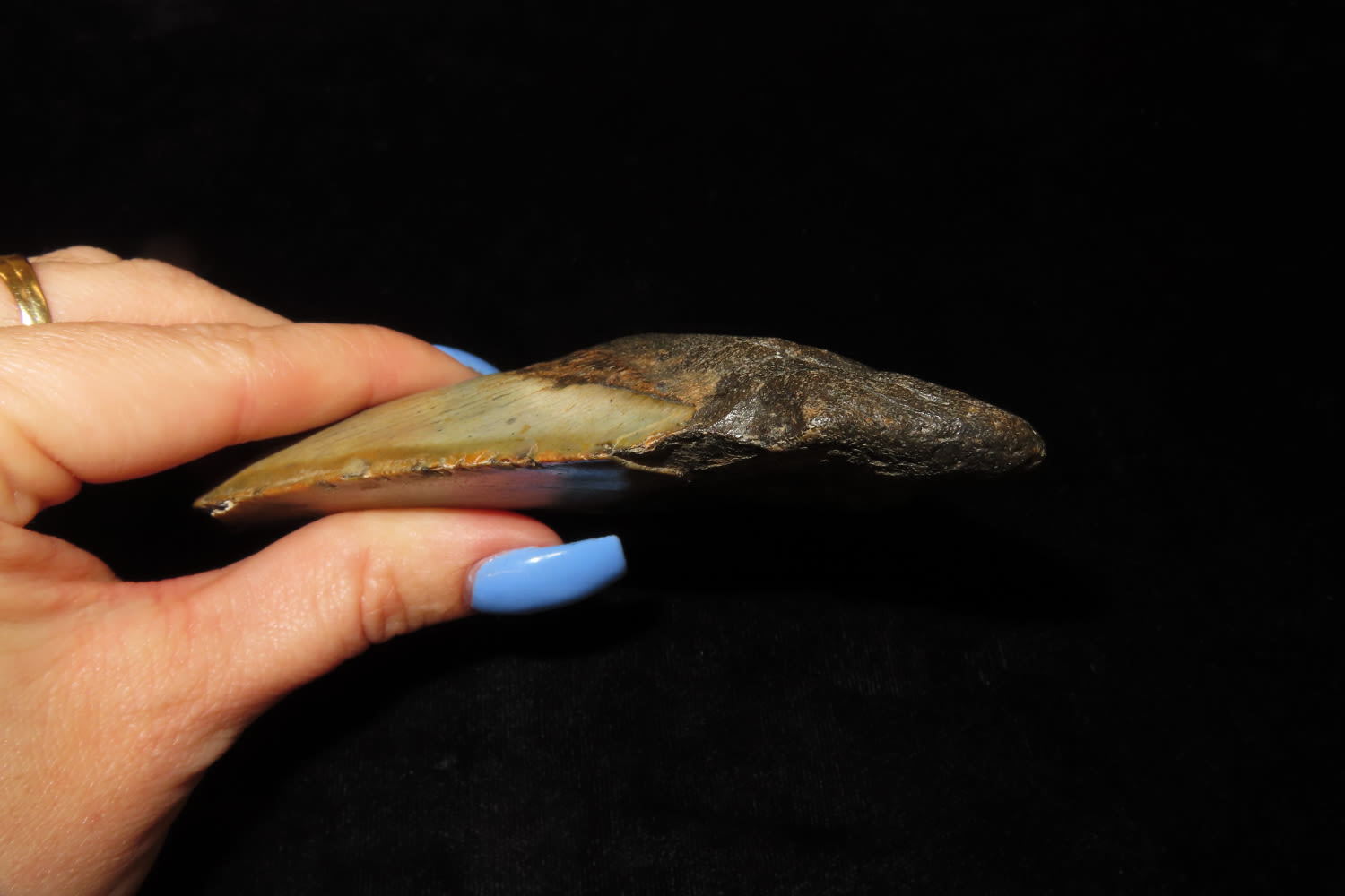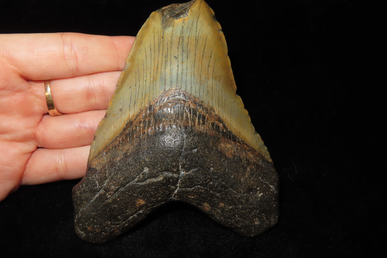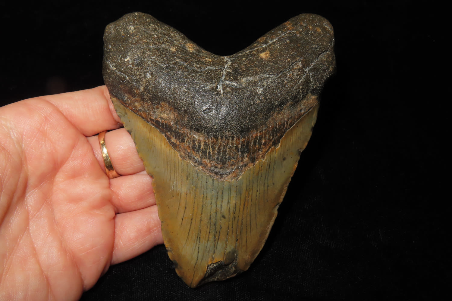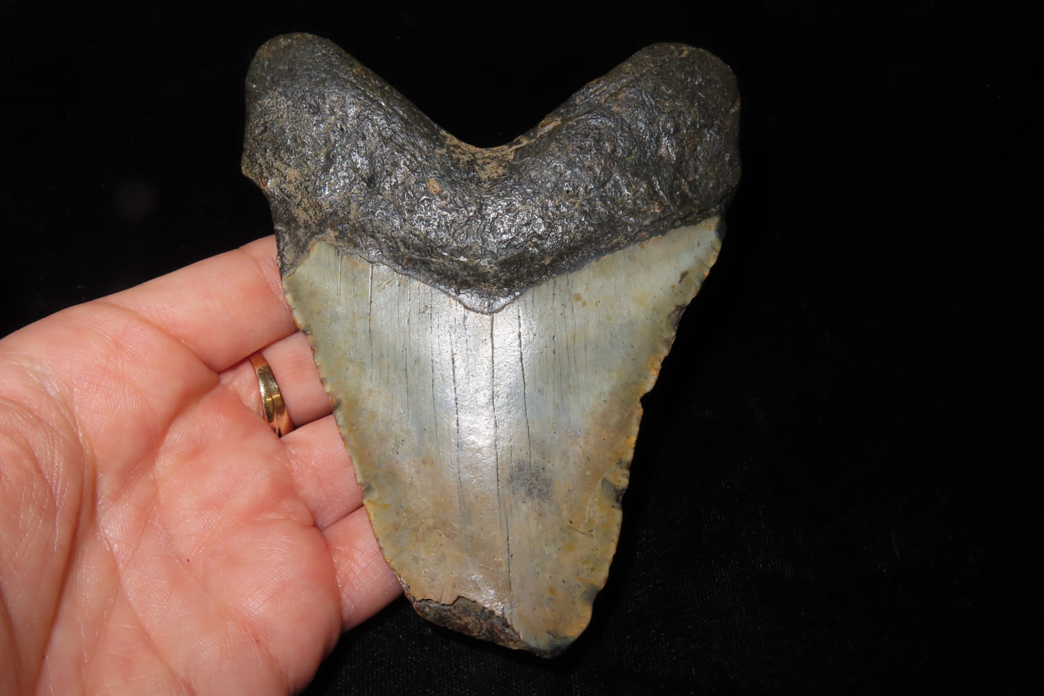 HUGE 4 1/2″ LONG MEGALODON SHARK TOOTH FOSSIL FOUND OFF THE COAST OF CAROLINAS