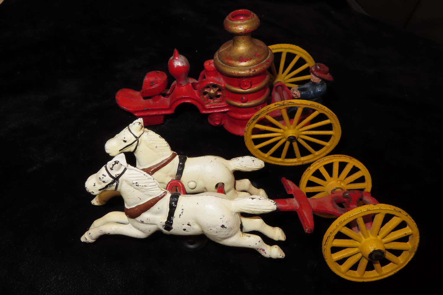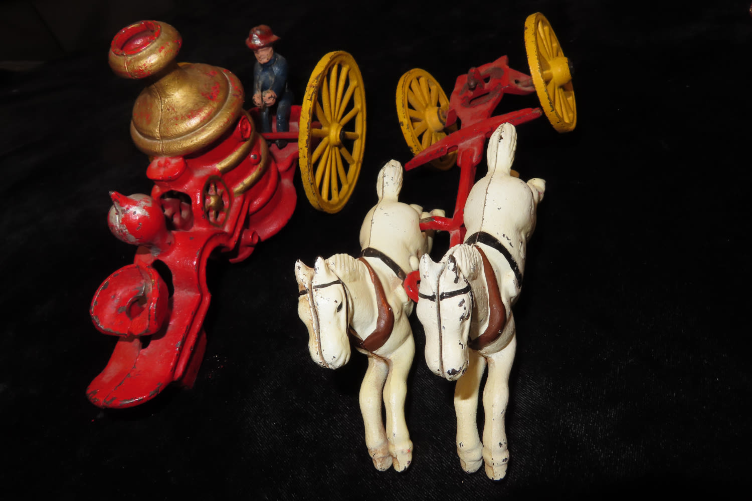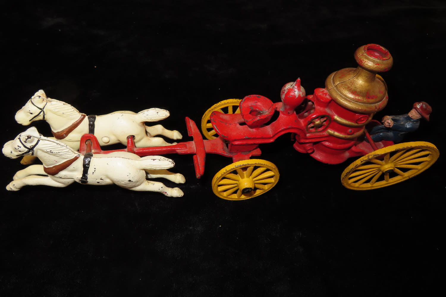 13″ LONG VINTAGE CAST IRON HORSE DRAWN FIRE TRUCK / WAGON WITH ORIGINAL FIREMAN